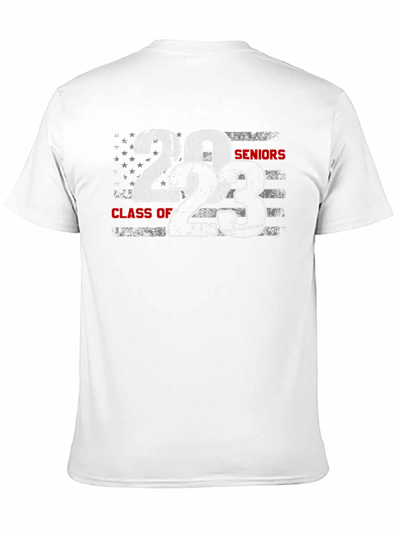 Show off your senior pride with this unique 2023 Class Of t-shirt! The design features an American flag backdrop with "20" and "23" distressed, bold numerals and the words "SENIORS" and "CLASS OF" in a contrasting red. Perfect for graduating seniors, class reunions, or school spirit events. This tee is a great way to commemorate your graduation year. Comfortable and stylish, it's ideal for everyday wear or special occasions. Wear it with pride and celebrate your achievements!