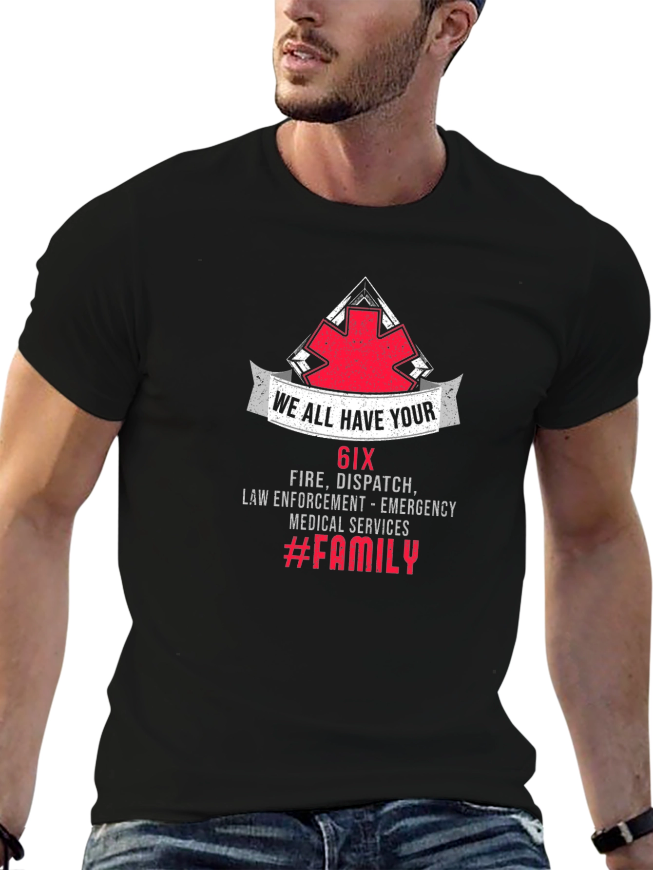 Show your support with this striking black t-shirt! Featuring a bold design with a red caduceus symbol and the words "WE ALL HAVE YOUR 6IX FIRE, DISPATCH, LAW ENFORCEMENT - EMERGENCY MEDICAL SERVICES #FAMILY" prominently displayed, this shirt is perfect for first responders and their families. Crafted from a comfortable-looking fabric, this t-shirt offers a relaxed fit. Wear it with pride to show your appreciation for the brave men and women who serve our communities.