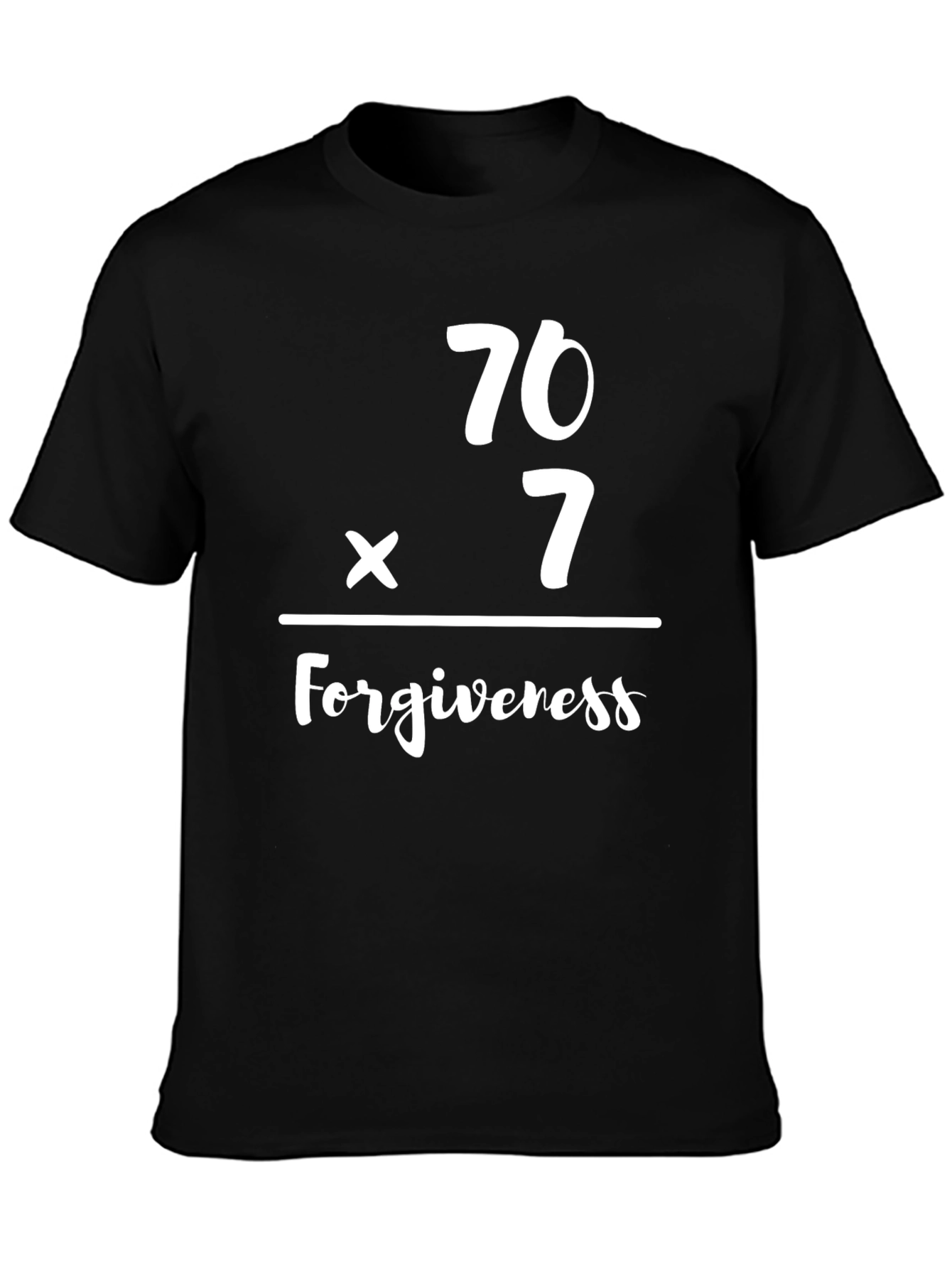 Show off your beliefs with this bold graphic t-shirt! This black tee features the white text "70 x 7 Forgiveness" on the front. The classic crew neck and short sleeves provide a comfortable fit, perfect for casual wear or spreading a message. Made from what appears to be soft cotton, it's ideal for everyday use. Whether you're attending a faith-based event, hanging out with friends, or simply running errands, this t-shirt offers a stylish way to express your faith and belief in forgiveness.