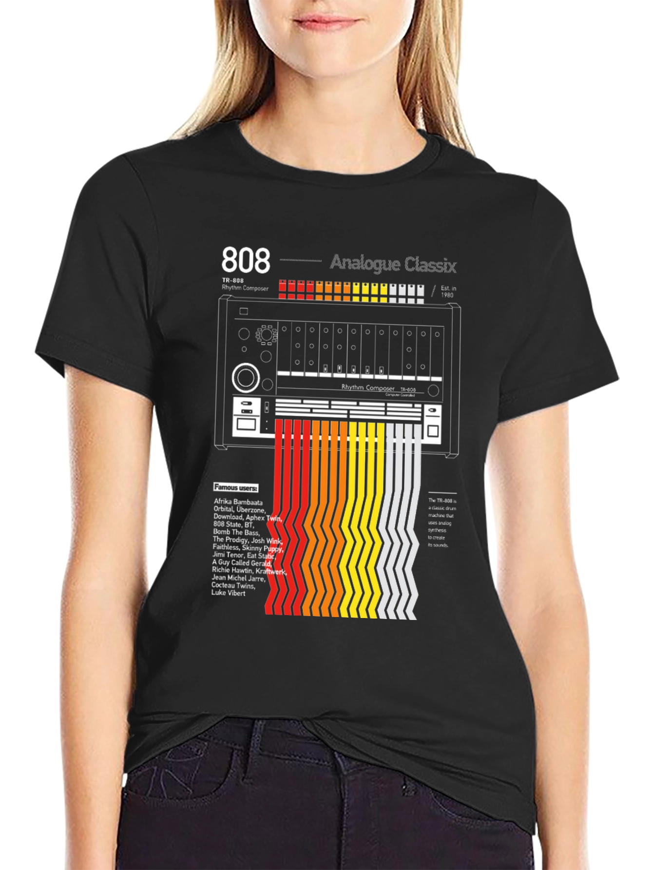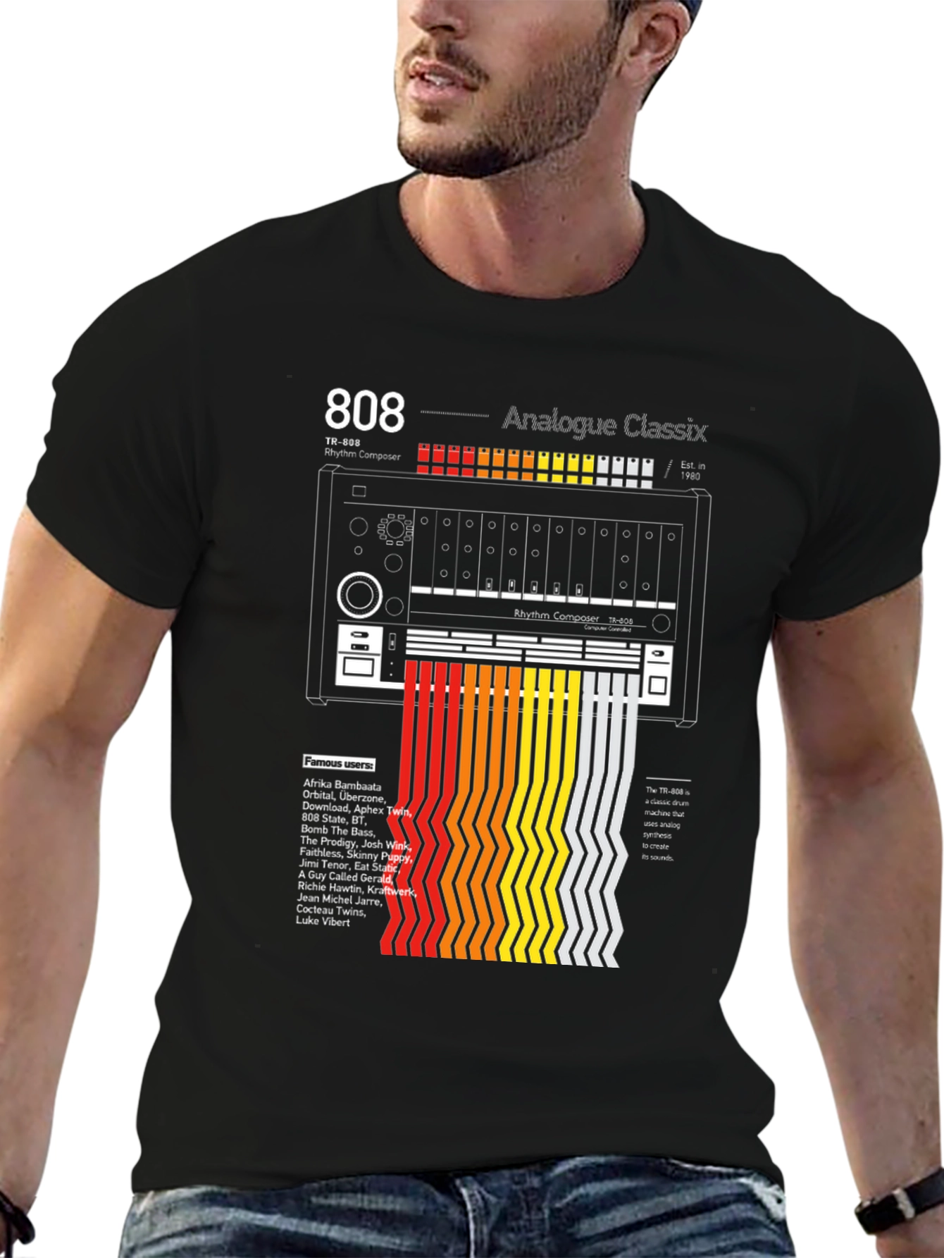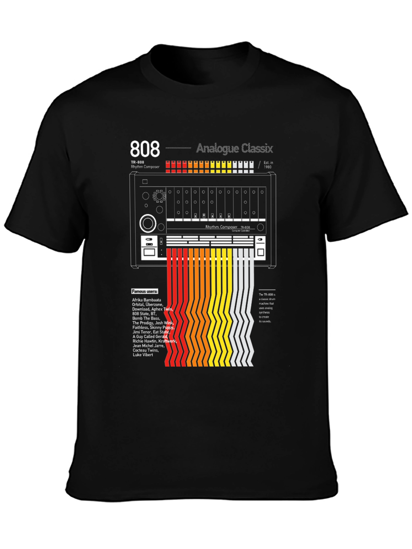 Show your love for classic rhythm composers with this stylish black t-shirt. Featuring a detailed graphic of the iconic 808 drum machine, complete with colorful sound wave design. This shirt pays homage to influential artists like Afrika Bambaata, Aphex Twin, Kraftwerk, and more. Made from a soft and comfortable fabric, this tee is perfect for music enthusiasts, producers, and anyone who appreciates vintage electronic sound. Wear it to the studio, concerts, or as a cool everyday statement piece.