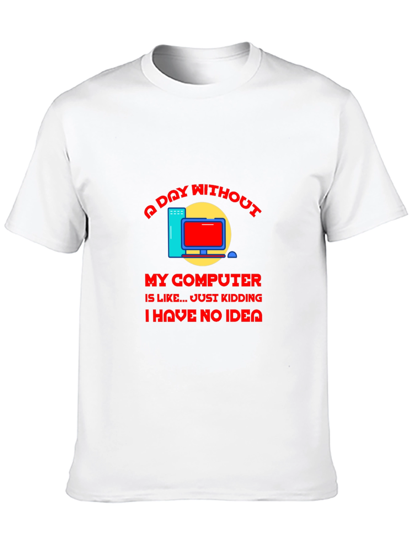 This black t-shirt features a humorous graphic that playfully acknowledges our reliance on technology. The design showcases a stylized computer setup inside a vibrant yellow circle, framed by the text "A DAY WITHOUT" arching above and "MY COMPUTER" below. The complete phrase continues with "IS LIKE... JUST KIDDING, I HAVE NO IDEA", emphasizing the humor. Made from a comfortable-looking fabric, this short-sleeved tee is perfect for casual wear, tech enthusiasts, or anyone with a playful sense of humor. It's an excellent conversation starter and a fun way to express your love (or dependence) on computers!