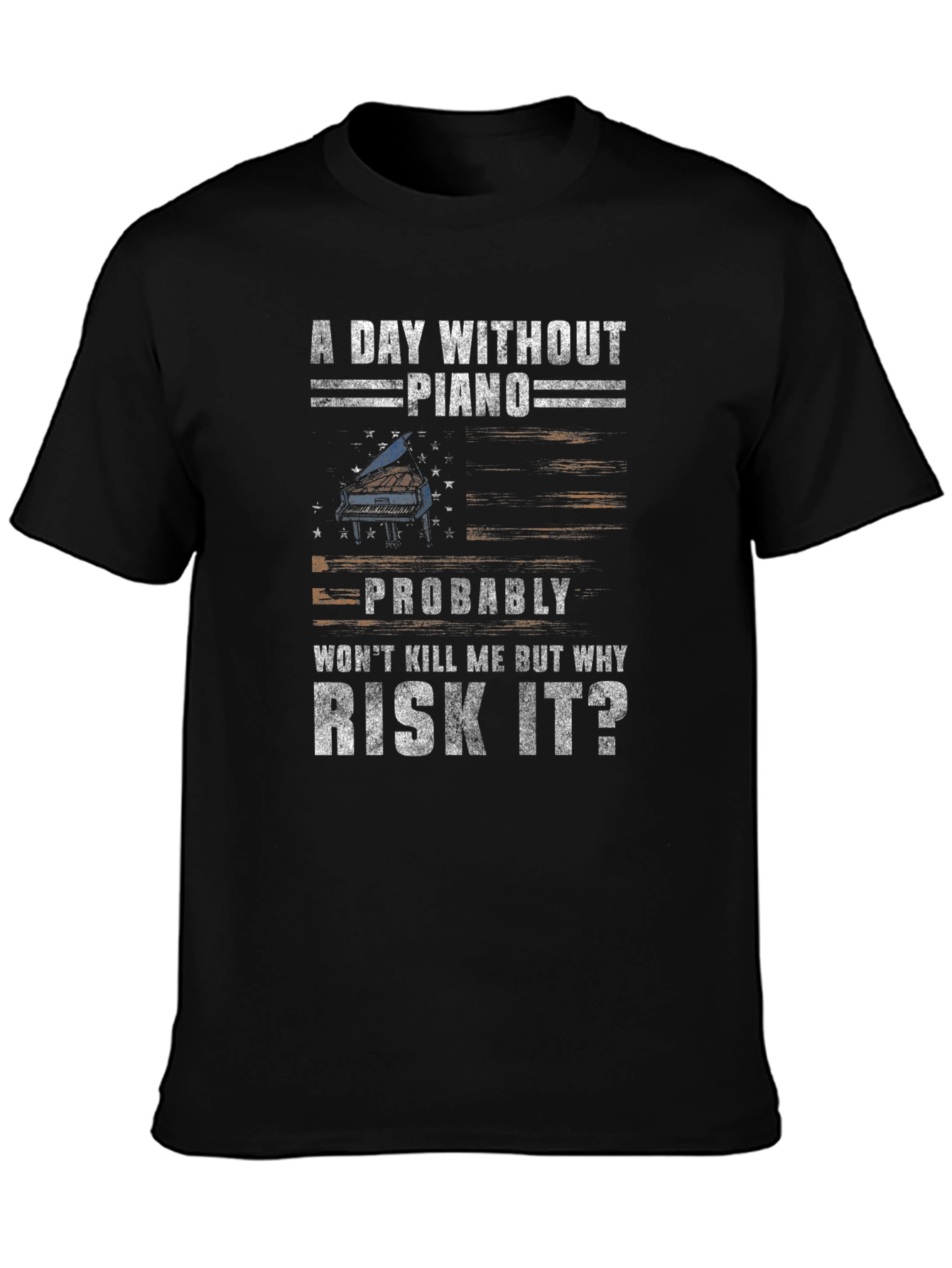 Show your love for music with this stylish black t-shirt. The design features the funny saying, "A Day Without Piano Probably Won't Kill Me But Why Risk It?" that any pianist will relate to! The graphic includes an artistic piano graphic. Made from a soft, comfortable fabric, this tee is perfect for casual wear, music lessons, or practice sessions. Makes a great gift for the musician in your life. Get yours today and let the world know that playing piano is an essential part of your day!