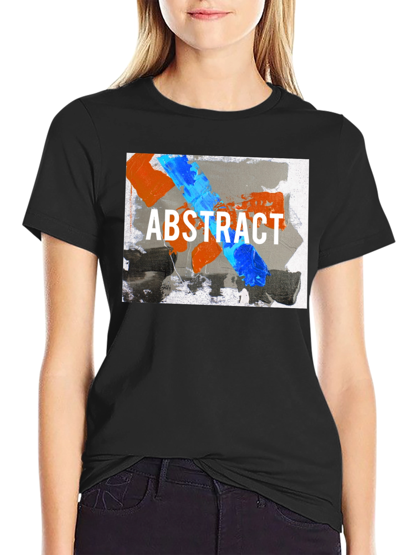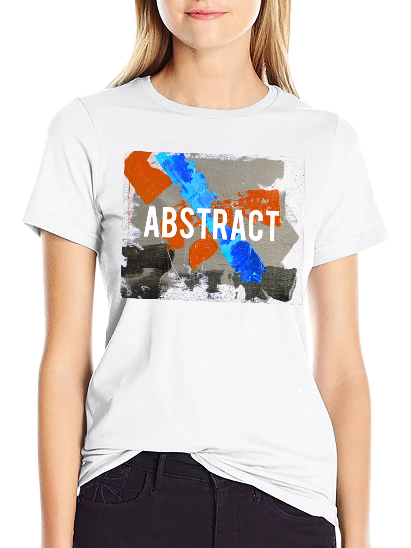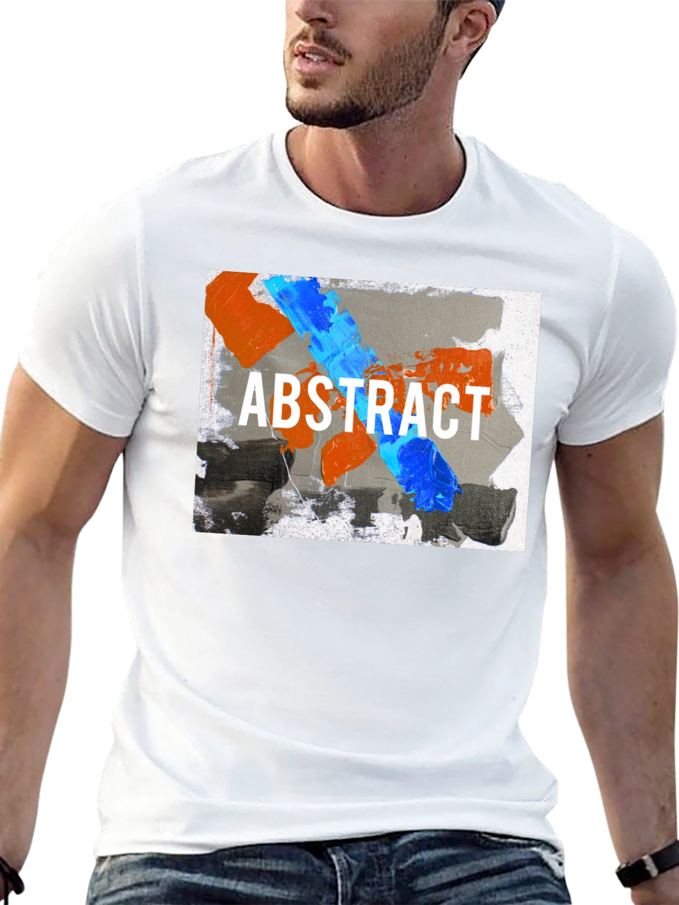 Elevate your wardrobe with this eye-catching abstract art t-shirt. Featuring a bold, contemporary design with vibrant blue and orange paint strokes over a gray background, emblazoned with "ABSTRACT" in crisp white font. This tee is a statement piece that blends artistic flair with everyday comfort. Perfect for casual outings, art enthusiasts, or anyone looking to add a touch of modern art to their style. Made from soft and breathable cotton, it's a comfortable choice for all-day wear. Stand out from the crowd and express your unique style with this must-have graphic tee.
