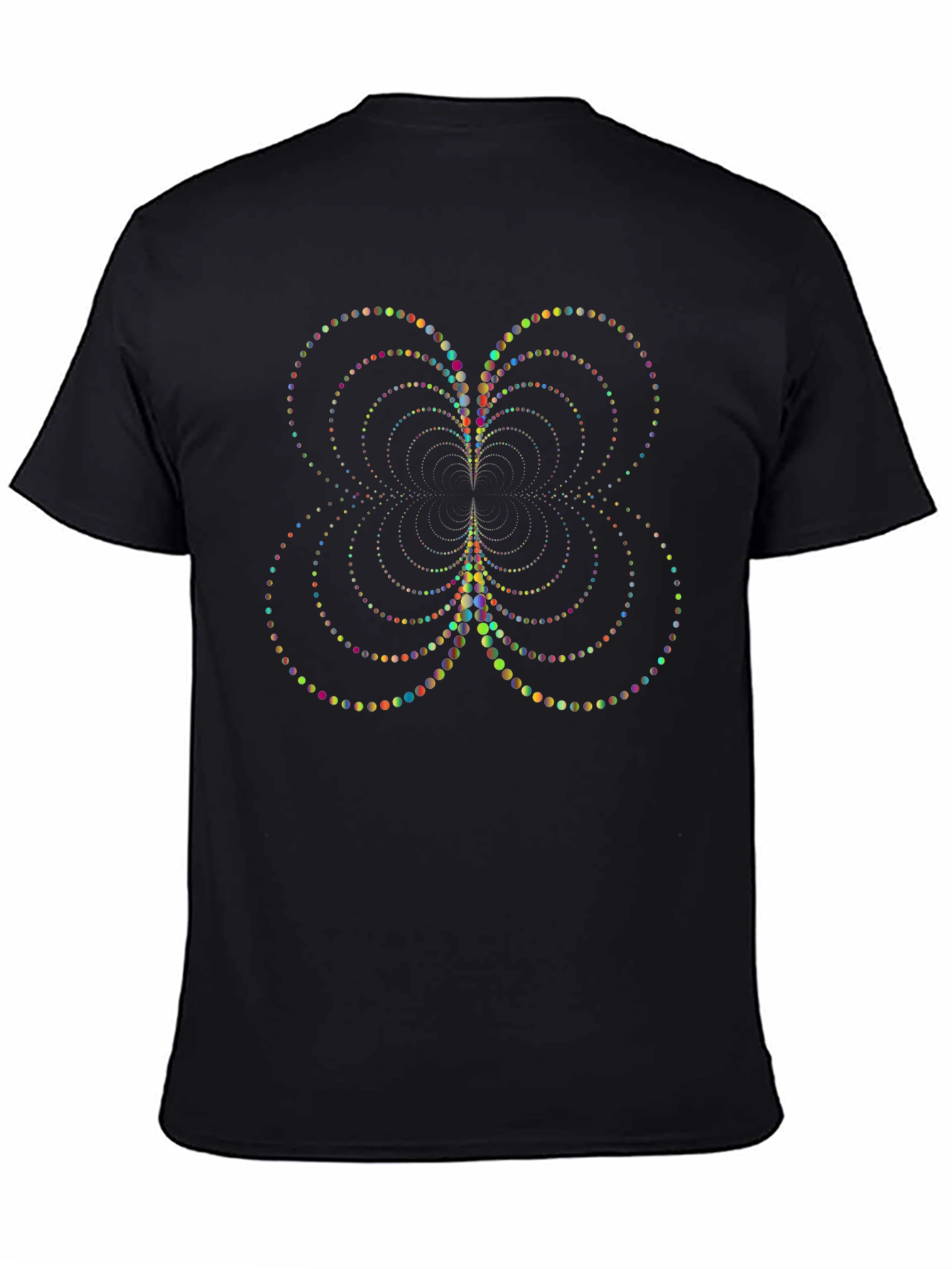 Make a statement with this eye-catching black t-shirt featuring a unique, abstract design. The pattern consists of concentric circles formed by an array of colorful dots, creating a mesmerizing visual effect. Crafted from a soft, breathable fabric, this shirt offers both style and comfort. The classic fit makes it ideal for everyday wear, casual outings, or expressing your artistic flair. Stand out from the crowd and add this conversation-starting piece to your wardrobe today! Perfect for those who appreciate modern art and bold fashion.