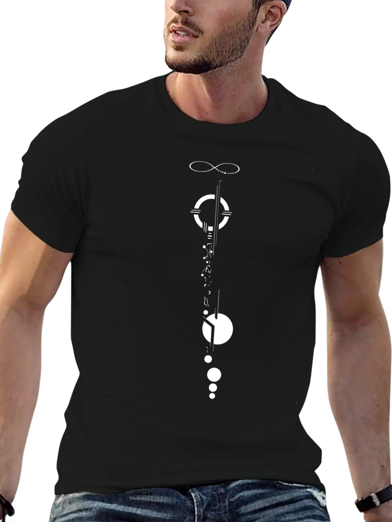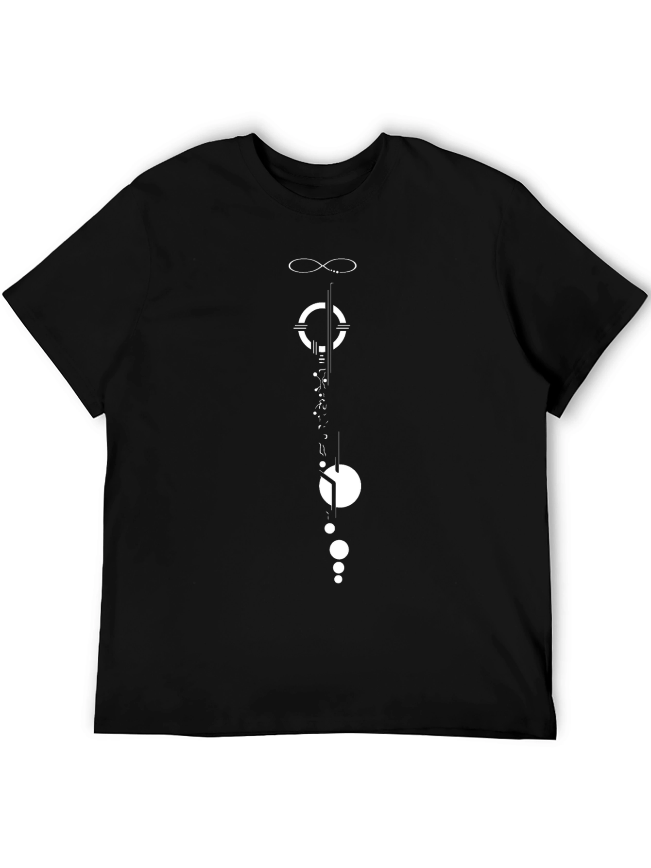 Elevate your casual style with this striking black t-shirt featuring an abstract geometric graphic. The clean, minimalist design in white creates a modern and eye-catching statement. The unique arrangement of lines, circles, and symbols adds an artistic touch, making this tee a standout piece in any wardrobe. Made from soft, breathable fabric, this t-shirt offers both comfort and style. Perfect for everyday wear, whether you're heading out with friends or just relaxing at home. Pair it with jeans or shorts for a cool, effortless look. Make a statement with this simple yet sophisticated graphic tee.