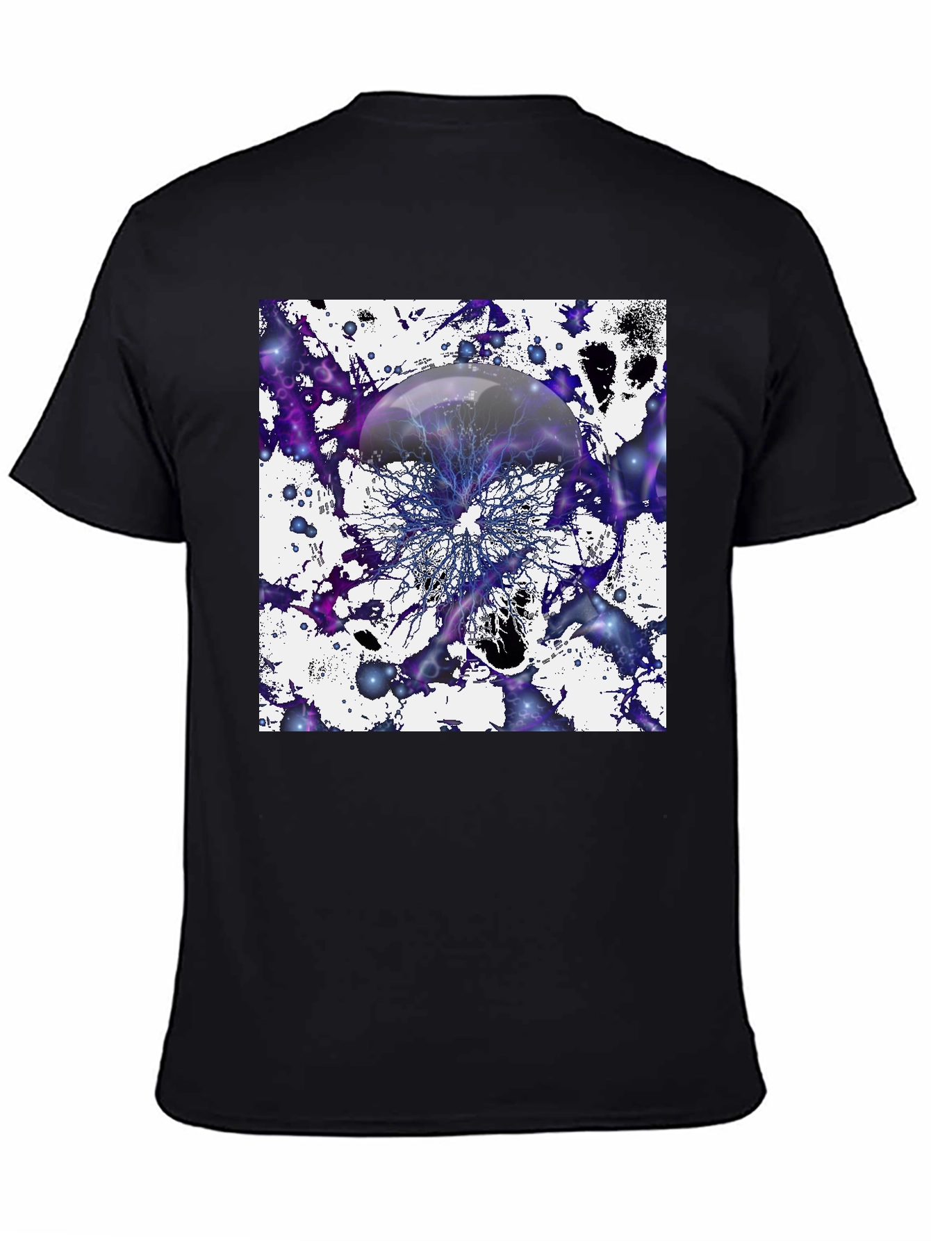 Showcase your unique style with this eye-catching t-shirt featuring an abstract jellyfish design. The artwork blends organic and geometric elements, with a spherical jellyfish shape set against a dynamic splattered background of purple and white. Made from a comfortable, breathable material, this classic tee is perfect for casual wear or making a statement. The unisex fit ensures a flattering look for everyone. Stand out from the crowd with this visually stunning and conversation-starting tee!