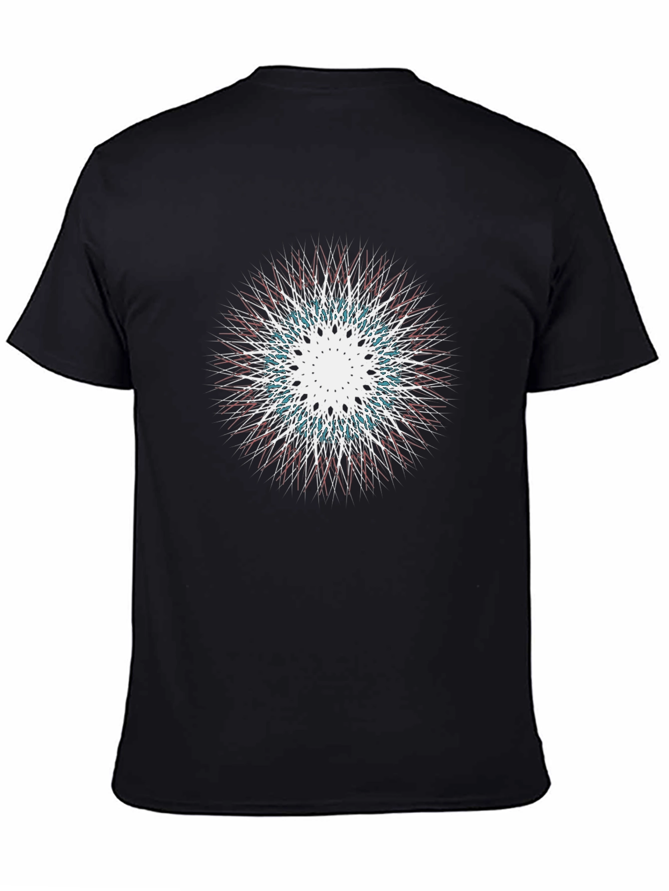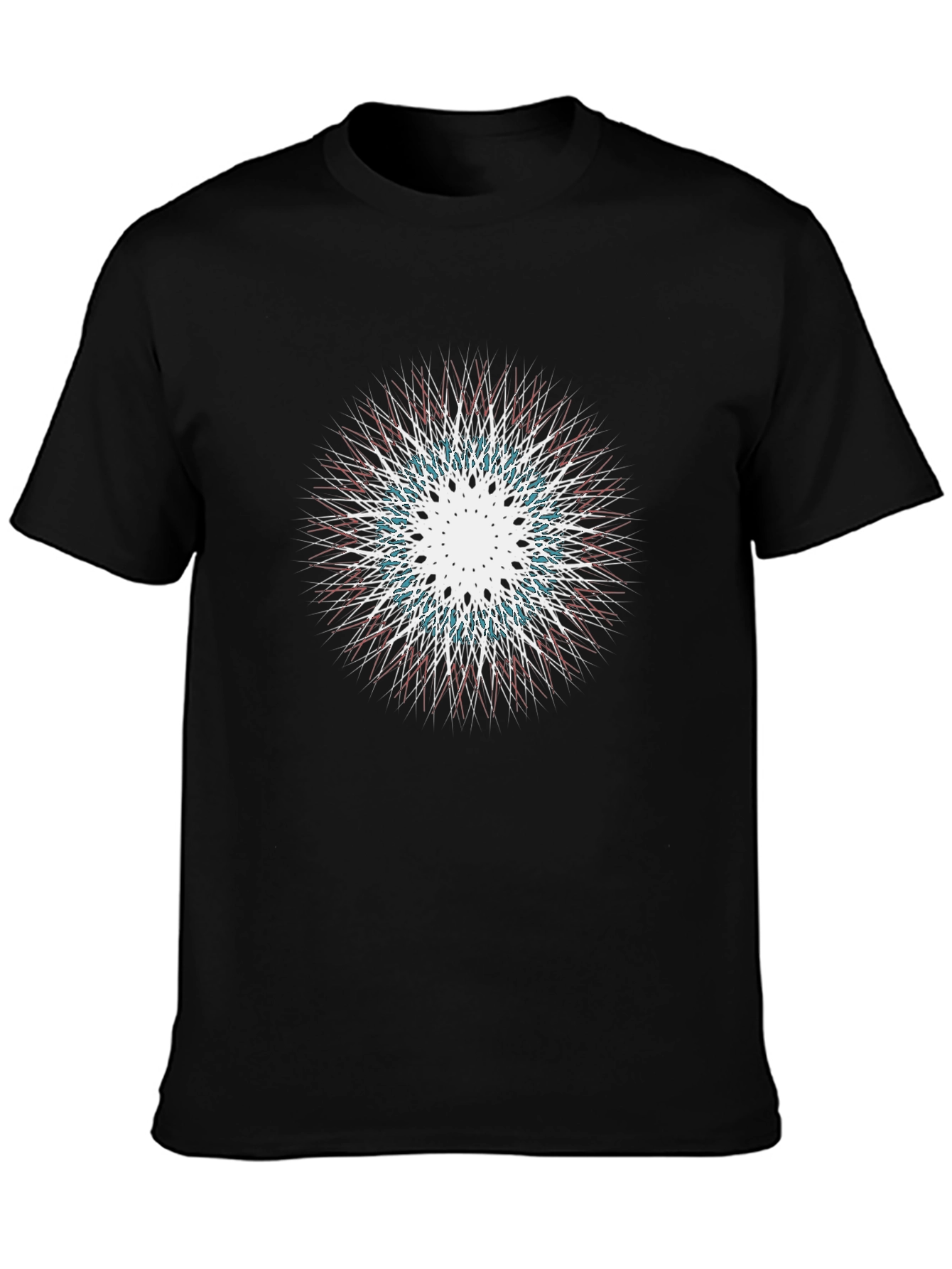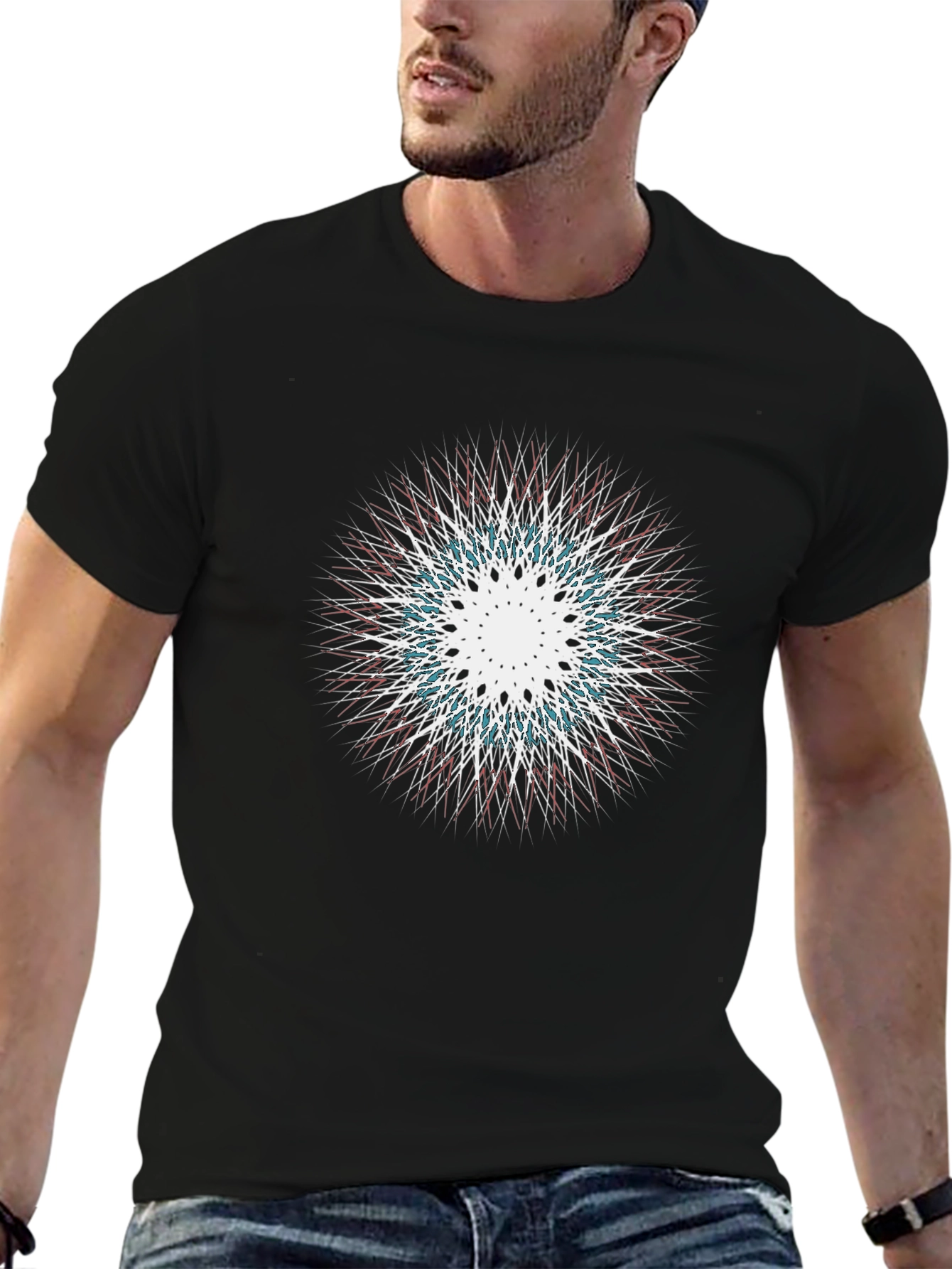 Make a bold statement with this eye-catching black t-shirt. The shirt features a unique, abstract starburst design in the center, blending white, blue, and red hues for a mesmerizing effect. This soft, comfortable tee is perfect for casual wear, concerts, or expressing your individuality. Stand out from the crowd with this artistic and stylish garment that effortlessly combines comfort and visual appeal. A great gift for those who appreciate modern and unique designs. Dress it up with dark jeans and boots or keep it casual with sneakers and a jacket.