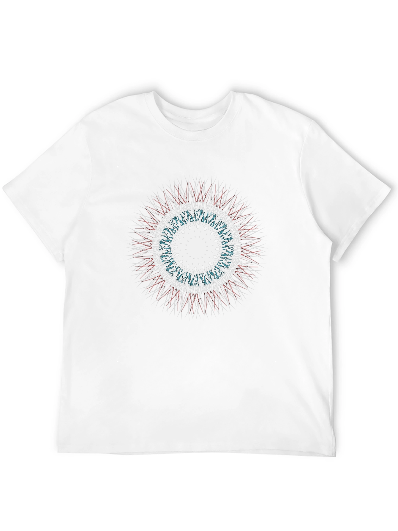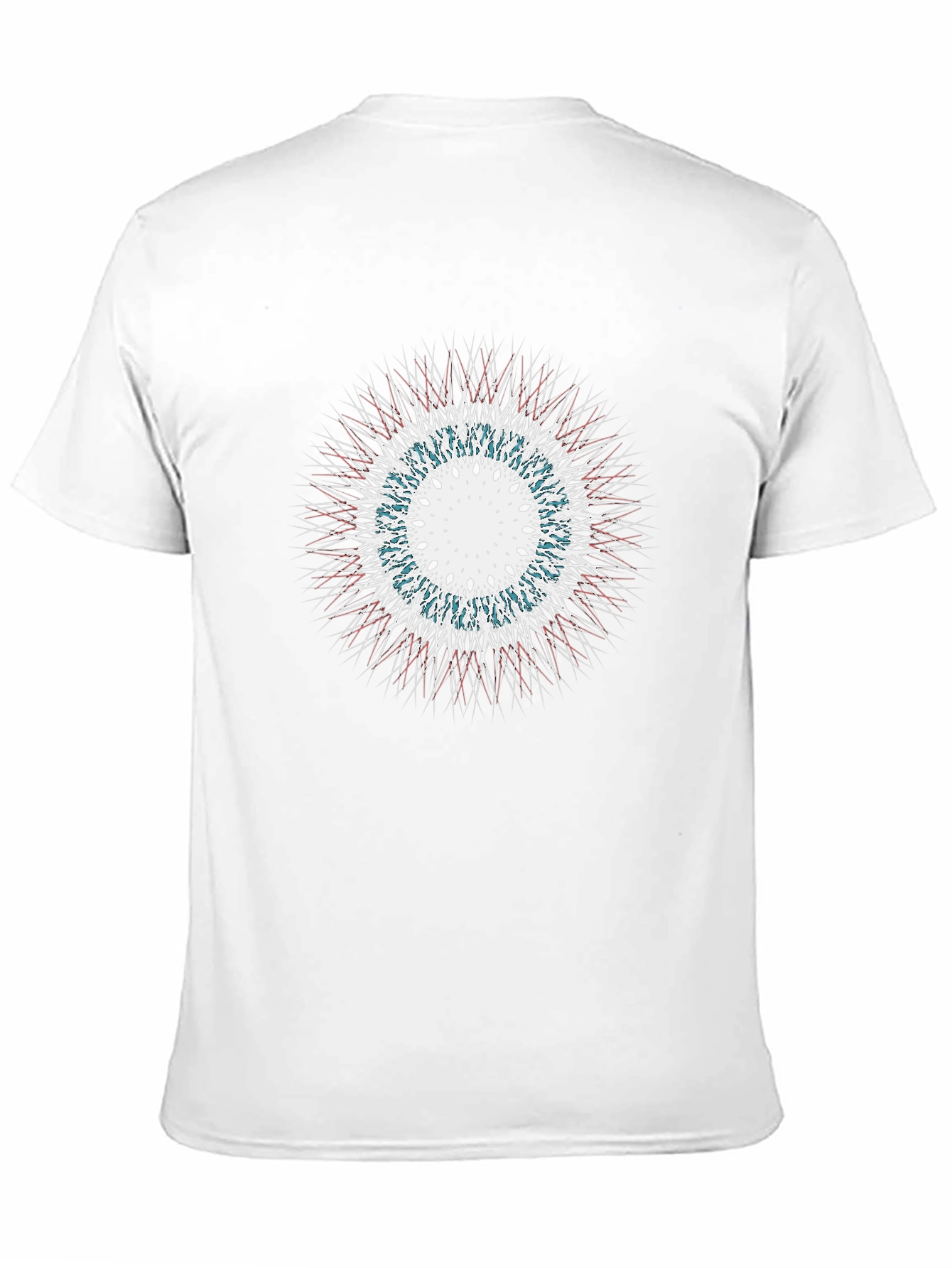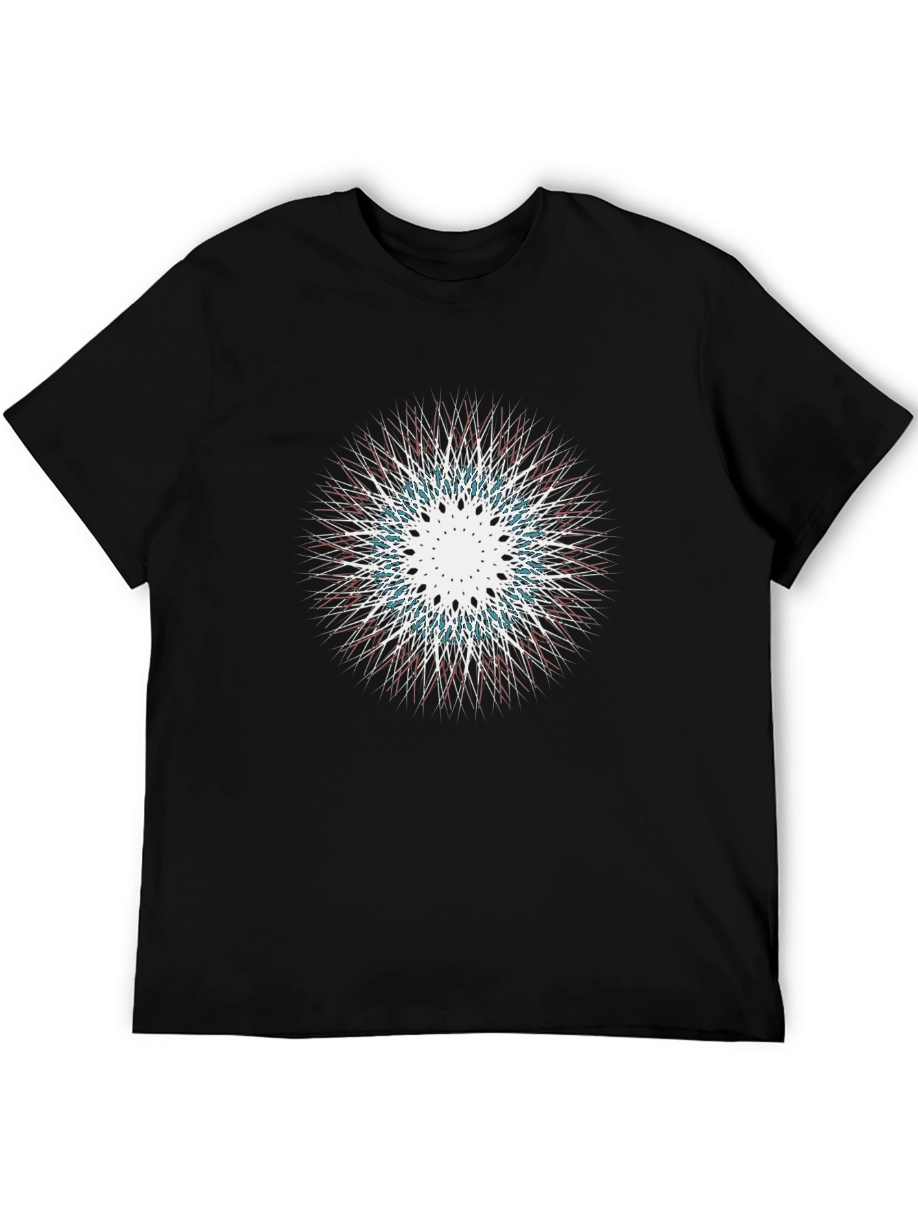 Make a bold statement with this eye-catching black t-shirt. The shirt features a unique, abstract starburst design in the center, blending white, blue, and red hues for a mesmerizing effect. This soft, comfortable tee is perfect for casual wear, concerts, or expressing your individuality. Stand out from the crowd with this artistic and stylish garment that effortlessly combines comfort and visual appeal. A great gift for those who appreciate modern and unique designs. Dress it up with dark jeans and boots or keep it casual with sneakers and a jacket.