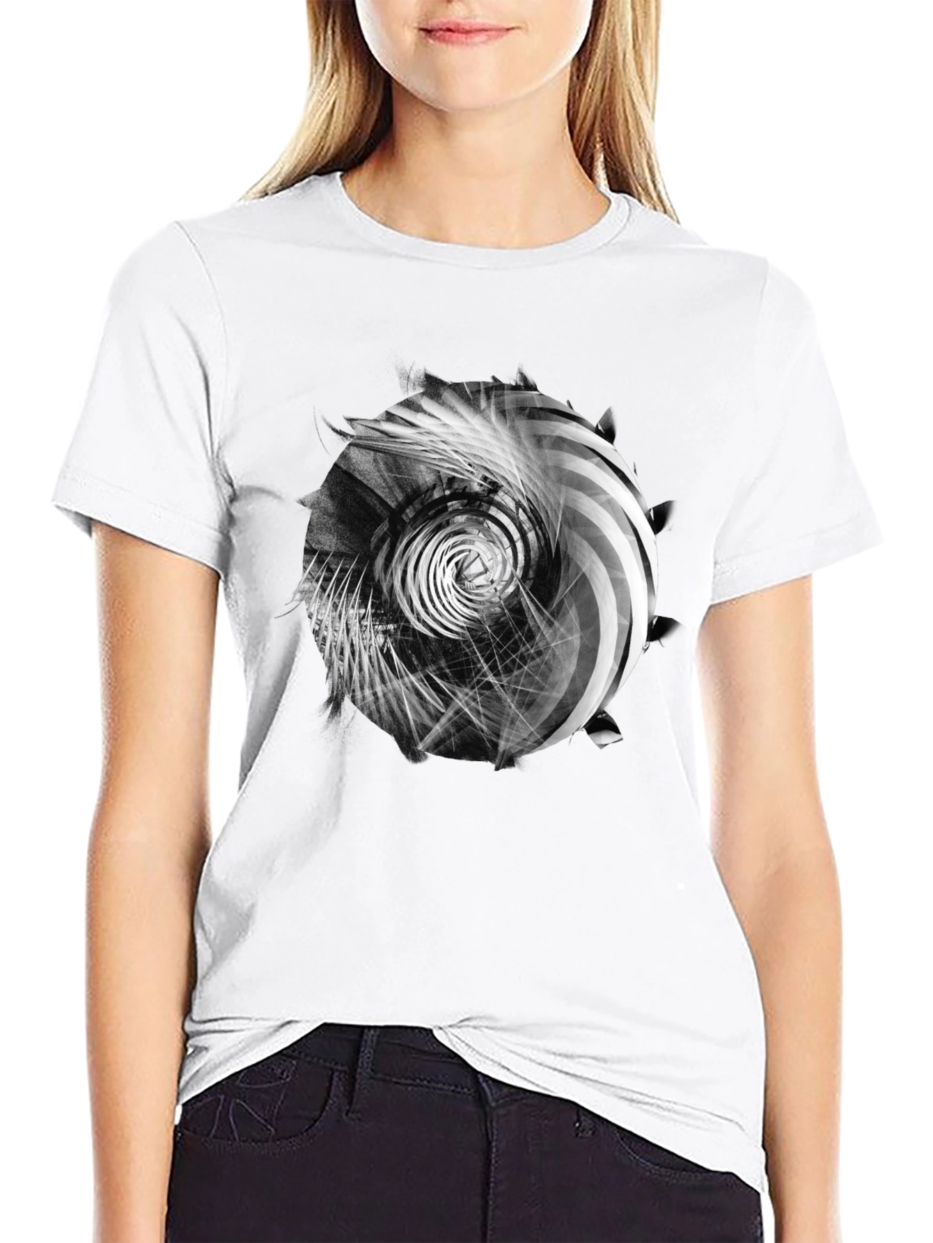Elevate your casual wardrobe with this striking black t-shirt featuring an eye-catching abstract swirl graphic. The complex, monochrome design creates a visually dynamic effect, making it a standout piece. Made from a comfortable-looking fabric, this tee is perfect for everyday wear. Pair it with jeans or shorts for a relaxed yet stylish look. Ideal for expressing your individuality and adding an artistic touch to your ensemble. The unique design will surely garner attention and spark conversation wherever you go.