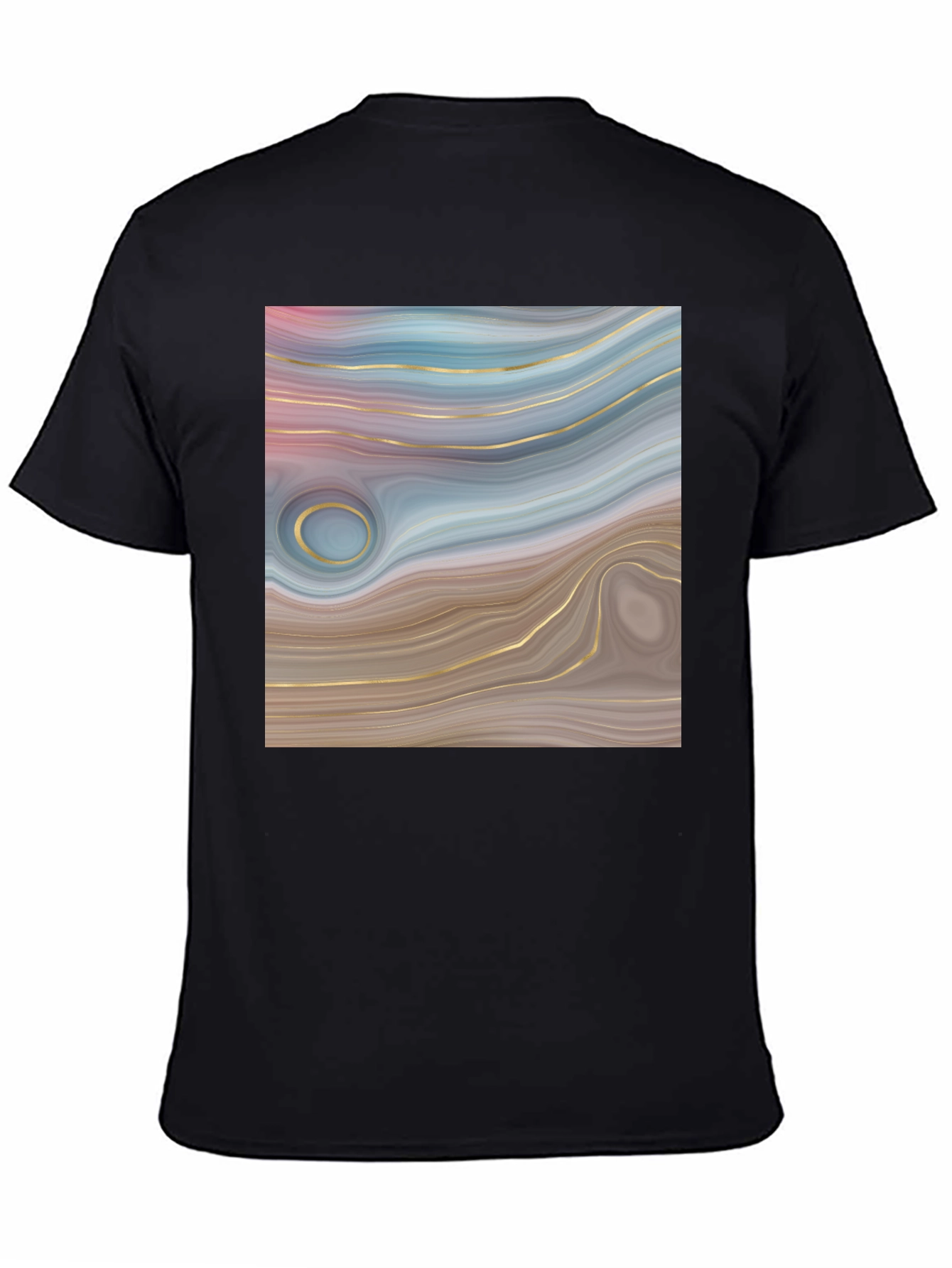 Elevate your casual style with this eye-catching graphic tee. This black t-shirt features a striking square design with an abstract swirl pattern in shades of blue, brown, and gold. The unique design adds a touch of modern art to your wardrobe. Made from comfortable, breathable fabric, this tee is perfect for everyday wear. Pair it with jeans or shorts for a relaxed, stylish look. The bold graphic makes a statement, perfect for expressing your individual style. Great for casual outings, weekend adventures, or just lounging around.