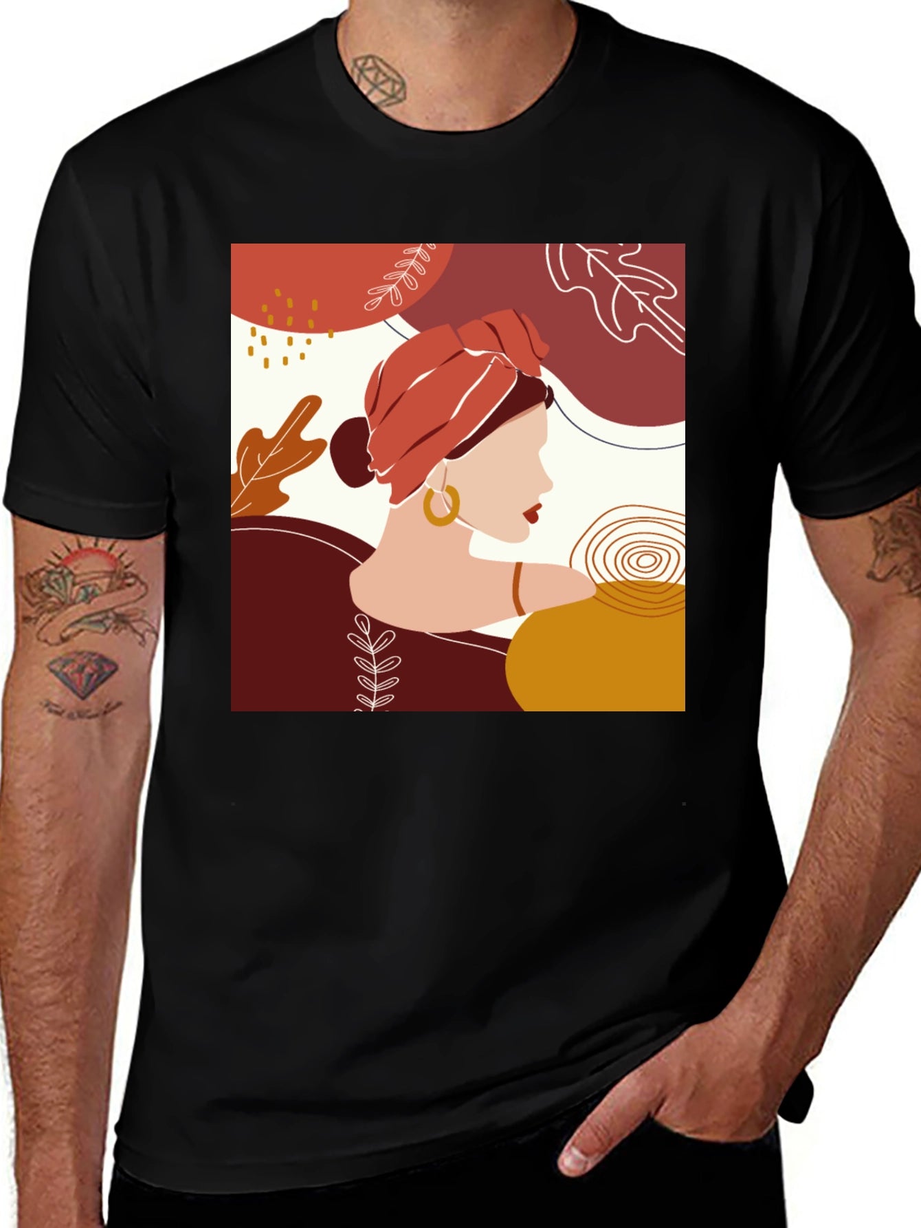 Elevate your everyday style with this unique graphic tee. Featuring an eye-catching abstract design of a woman with warm, earthy tones, this shirt is a statement piece that blends art and fashion. The design includes rich terracotta hues contrasted with neutral tones, creating a visually appealing aesthetic. Made from comfortable fabric, this tee is perfect for casual outings, relaxed days at home, or pairing with your favorite jeans or skirts for a chic look. Show off your distinctive taste with this comfortable and stylish tee.