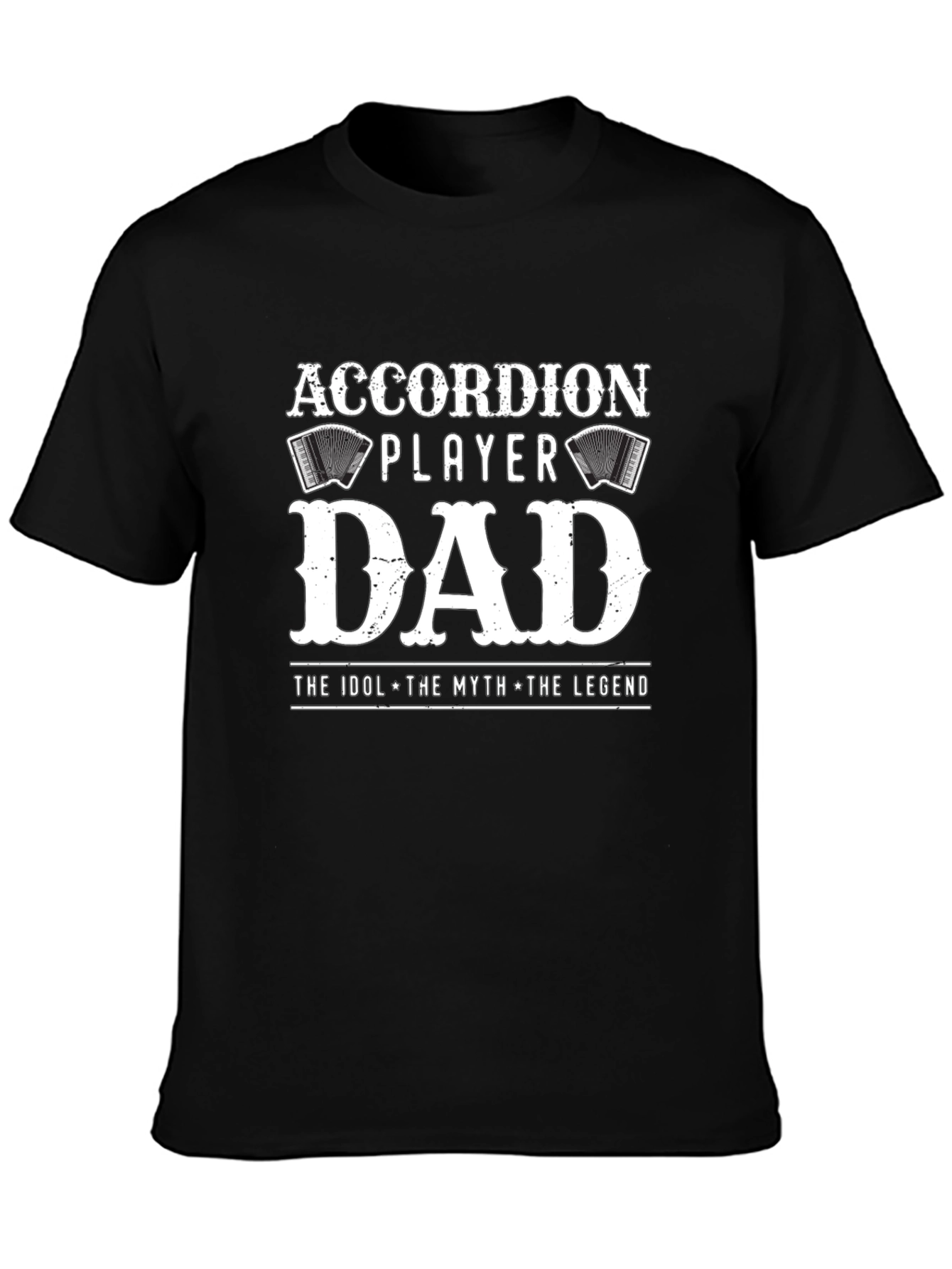 Celebrate the accordion-loving dad with this unique black t-shirt. The design features bold white lettering with "Accordion Player Dad" displayed prominently, flanked by accordion illustrations. Beneath, the phrase "The Idol * The Myth * The Legend" adds a touch of humor and admiration. Made from comfortable fabric, this t-shirt is perfect for casual wear, music events, or as a thoughtful gift for the accordion enthusiast in your life. Show your appreciation for their musical talent and paternal role with this stylish tee.