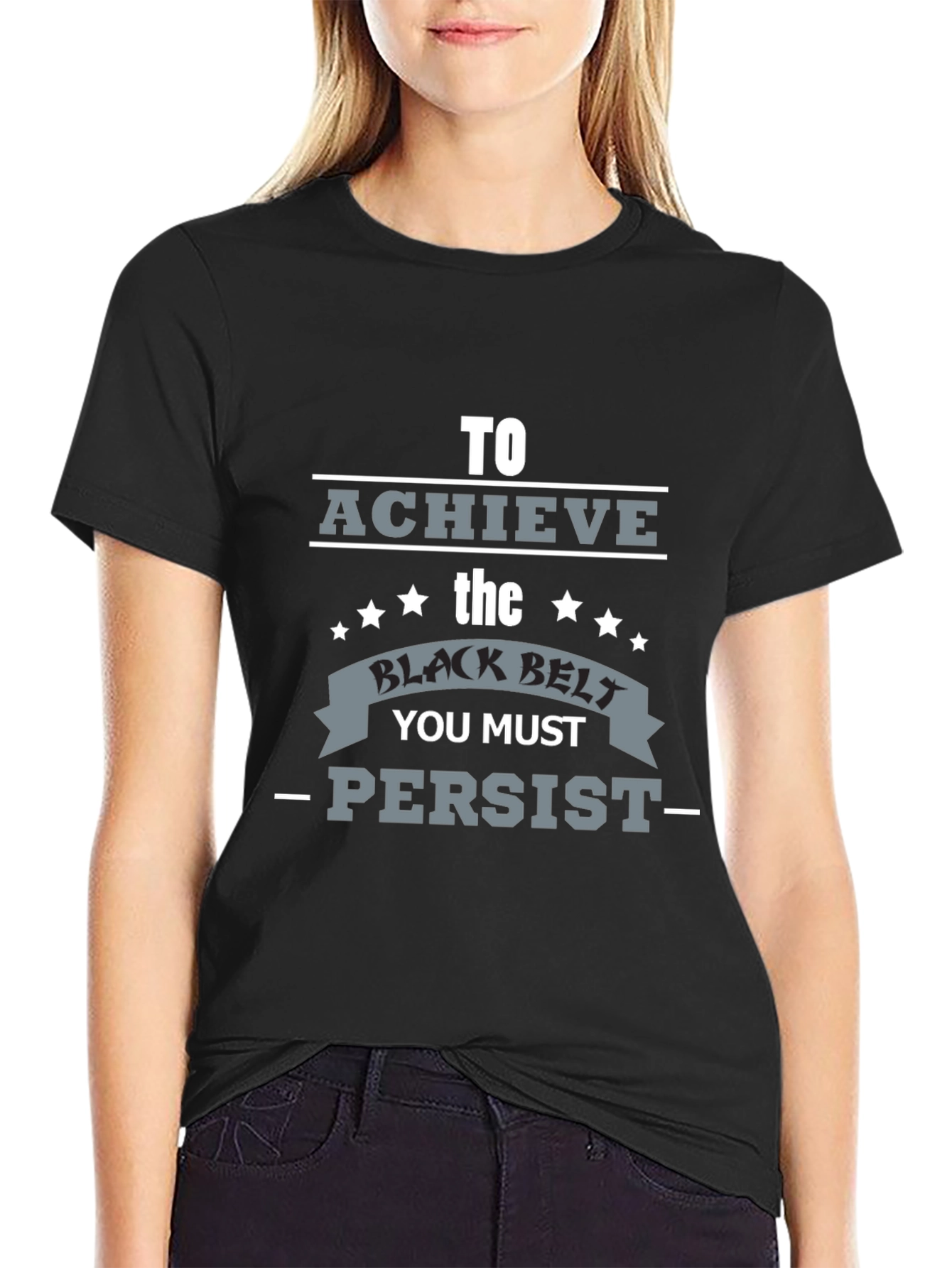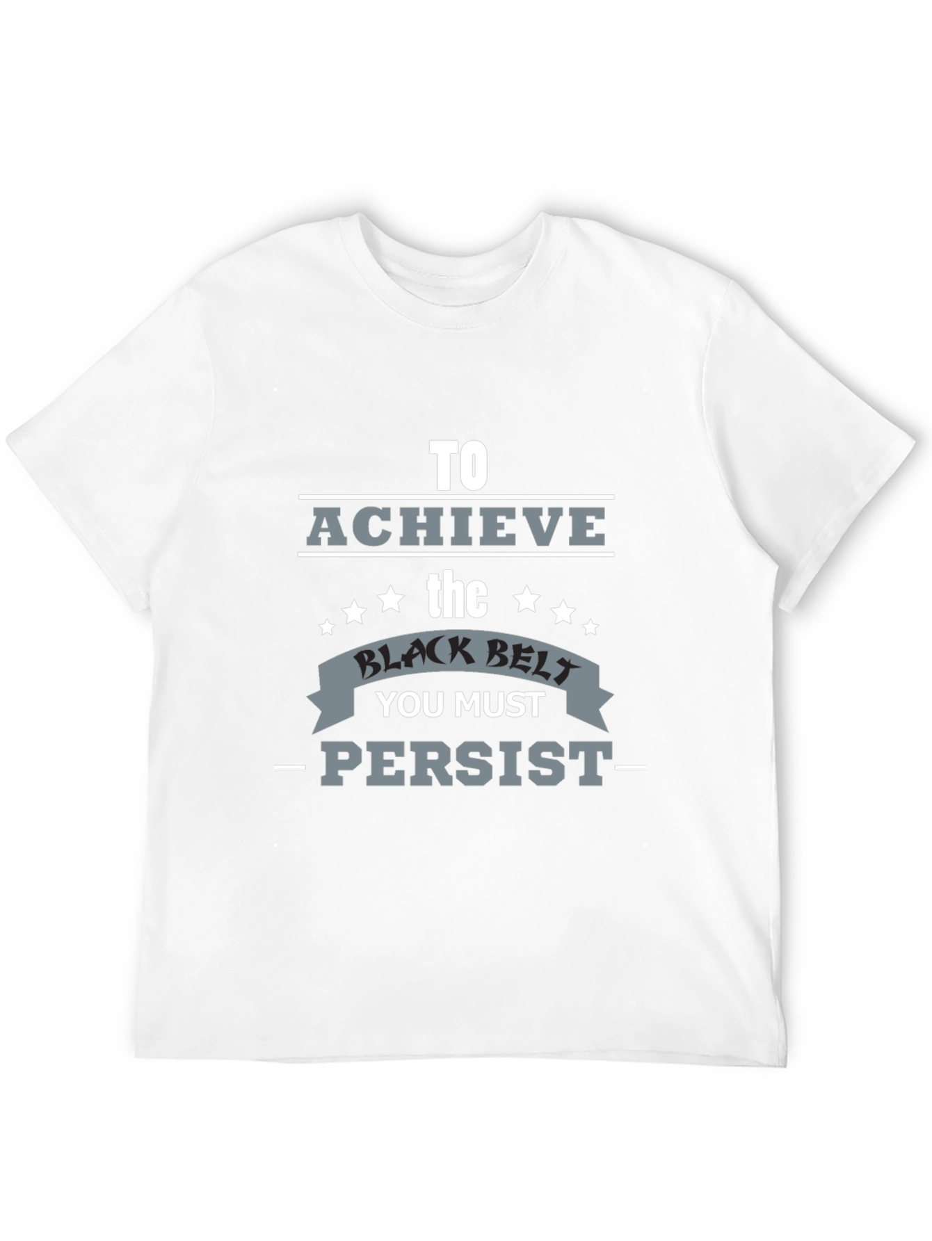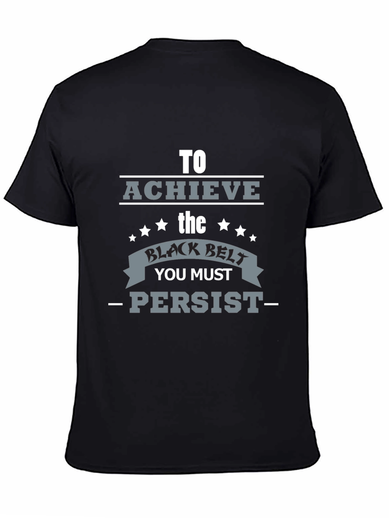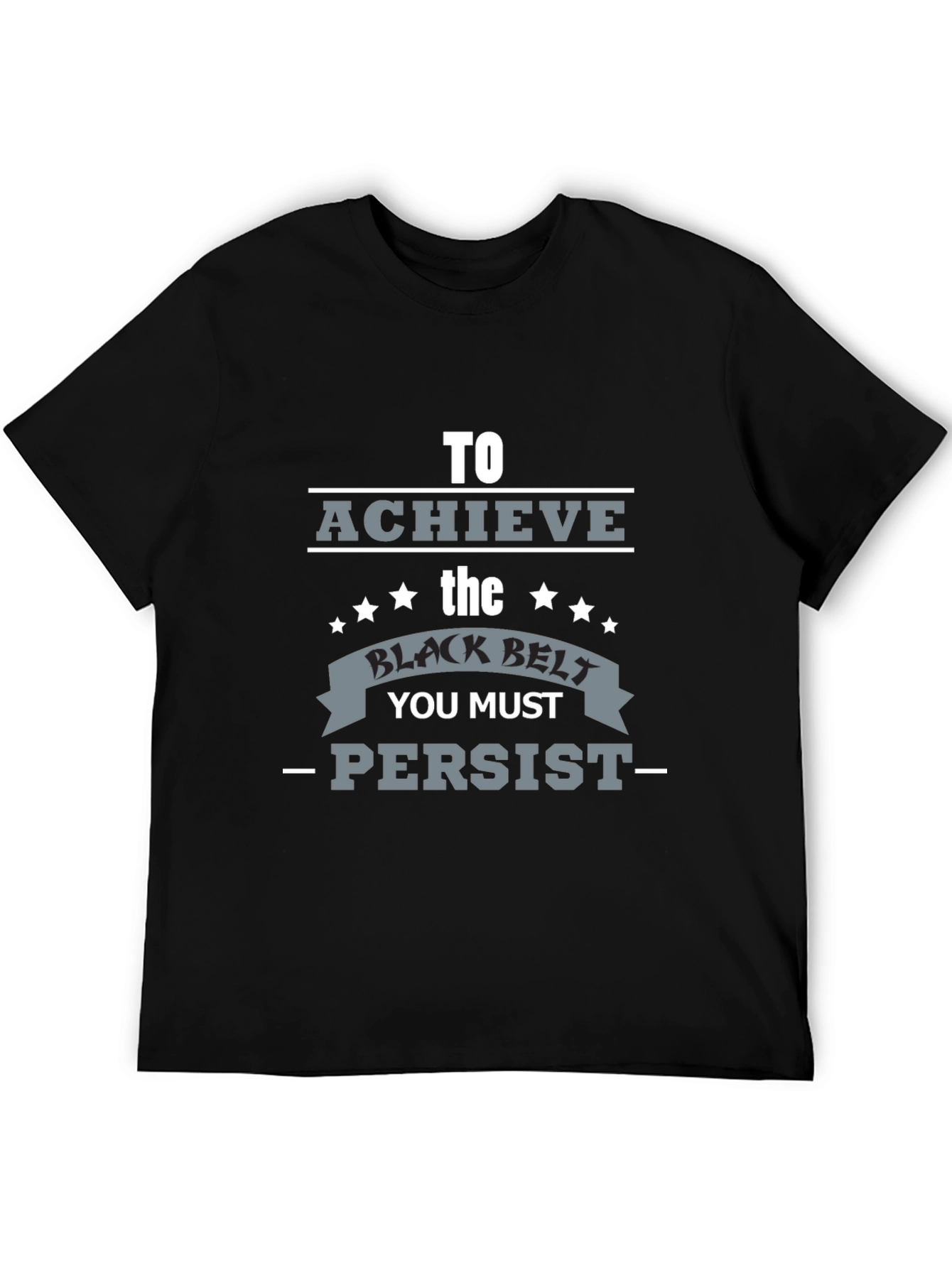 Show your dedication with this stylish black t-shirt featuring a motivational graphic. The design encourages persistence with the phrase "To Achieve the Black Belt You Must - Persist." Perfect for martial arts enthusiasts, athletes, or anyone seeking inspiration. Made from comfortable, breathable fabric, this tee is ideal for everyday wear, workouts, or casual outings. The bold graphic and clean design make it a standout piece in any wardrobe. Get yours today and wear your motivation!