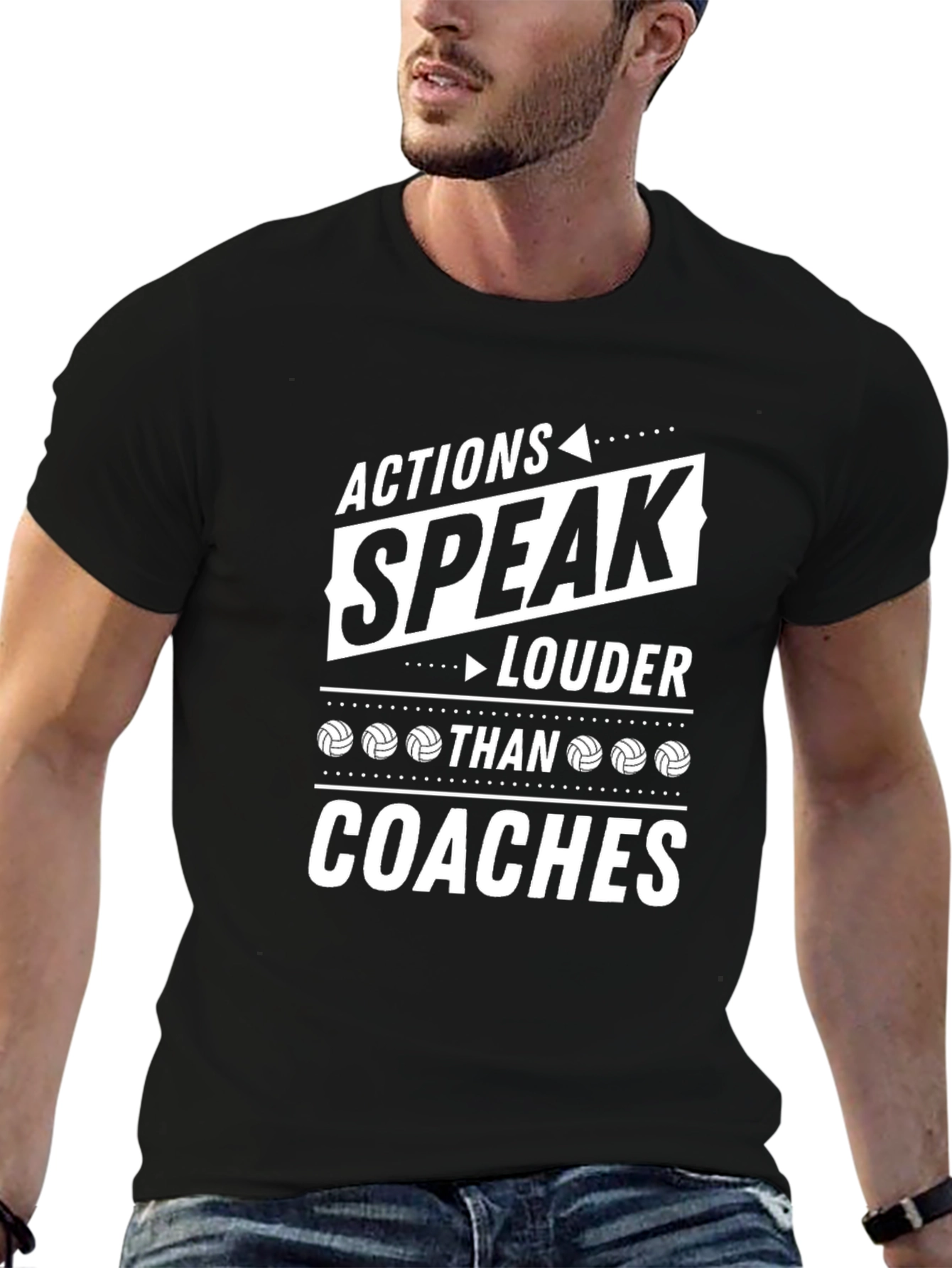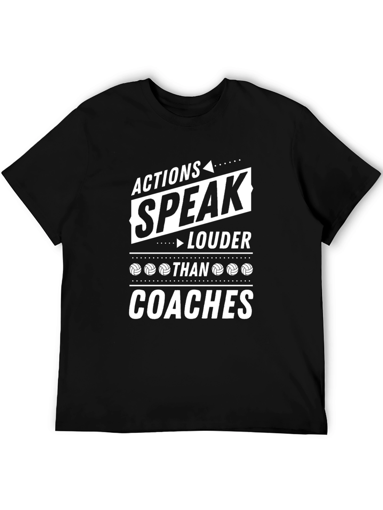This black t-shirt features a bold, white graphic design. The design includes the phrase "ACTIONS SPEAK LOUDER THAN COACHES". The word "SPEAK" is highlighted in a white box. The word "THAN" is sandwiched between volleyball graphics. The shirt is made from a soft-looking fabric, making it comfortable to wear for casual outings or sports activities. It is suitable for volleyball players, fans, or anyone who appreciates motivational messages. Get yours today!