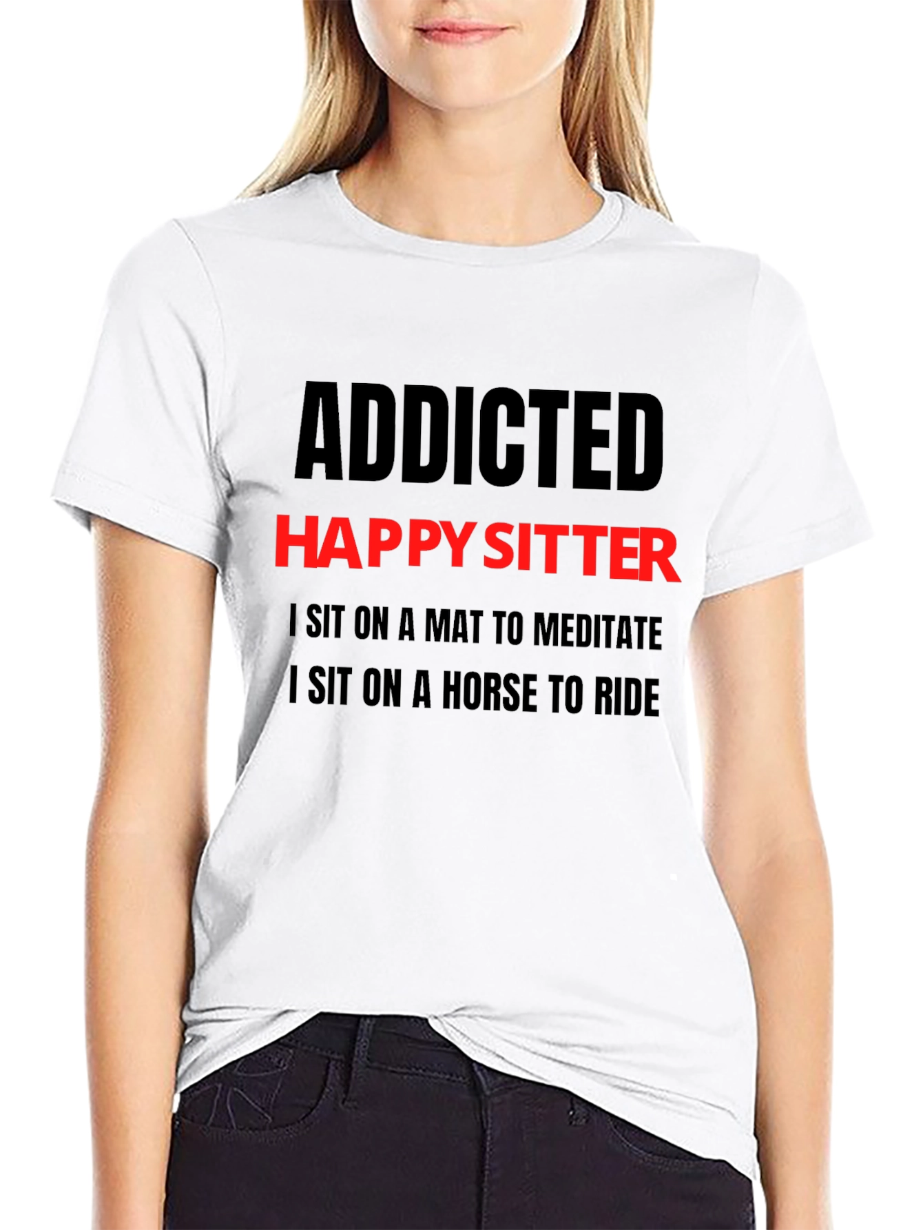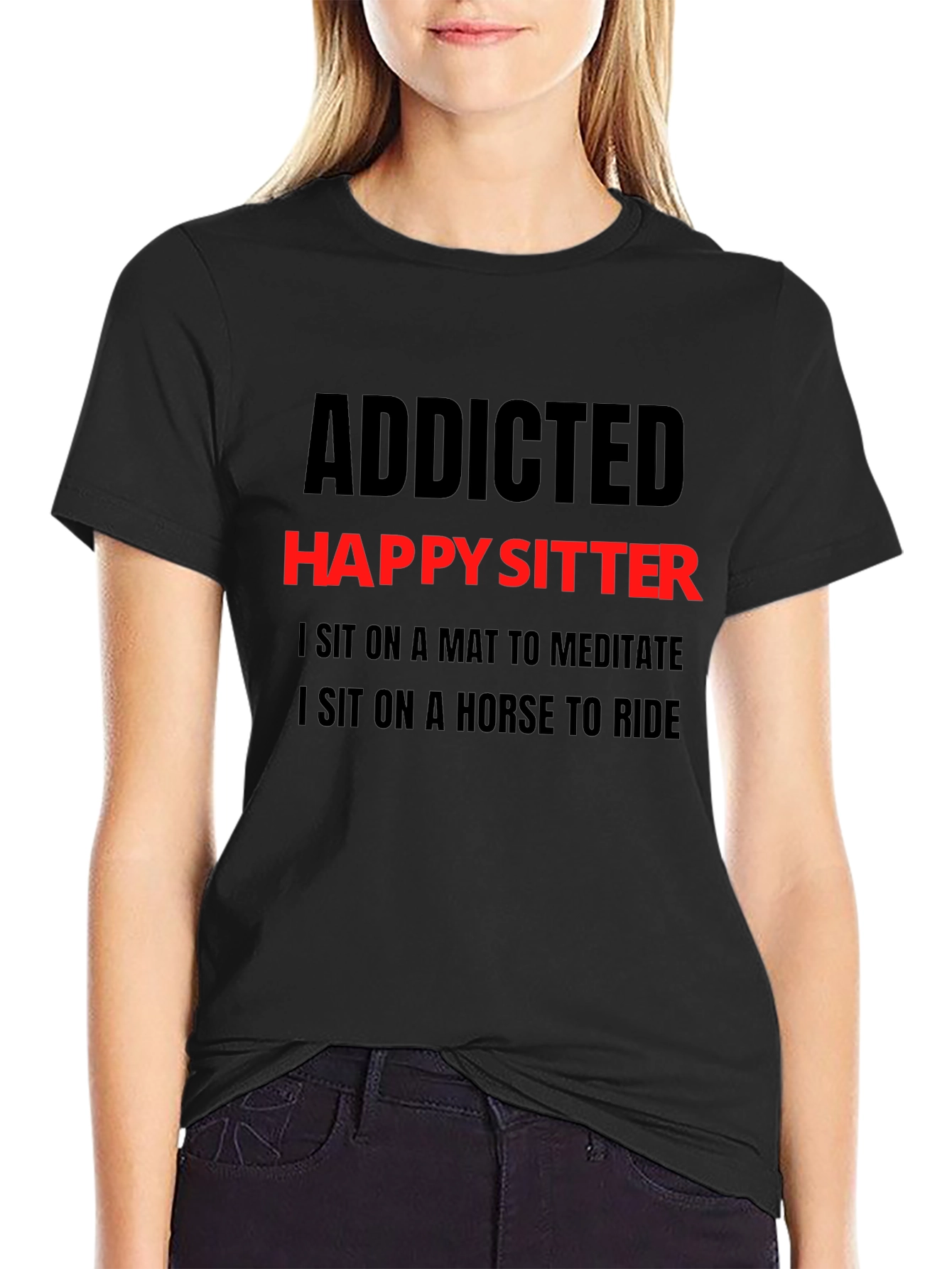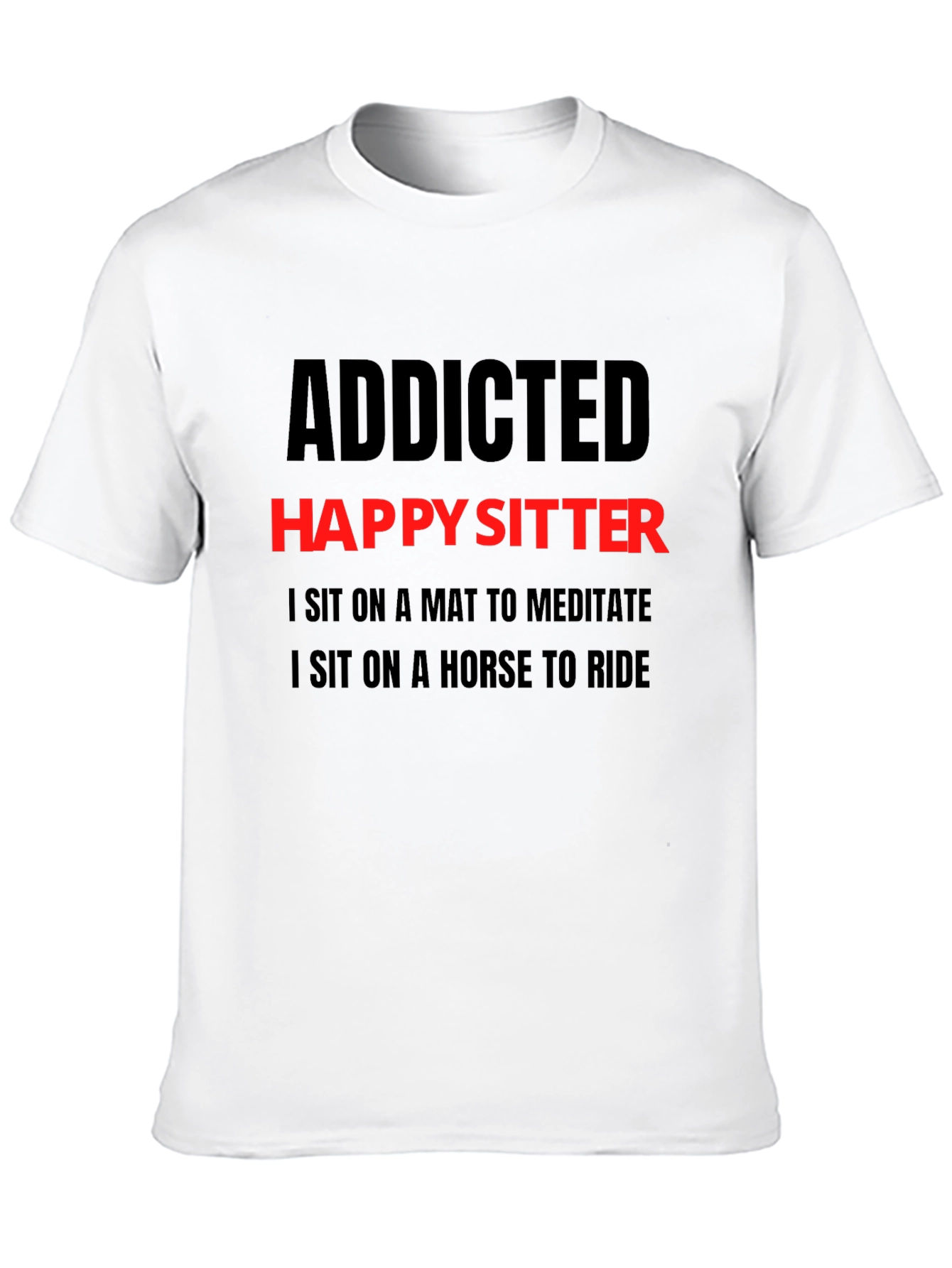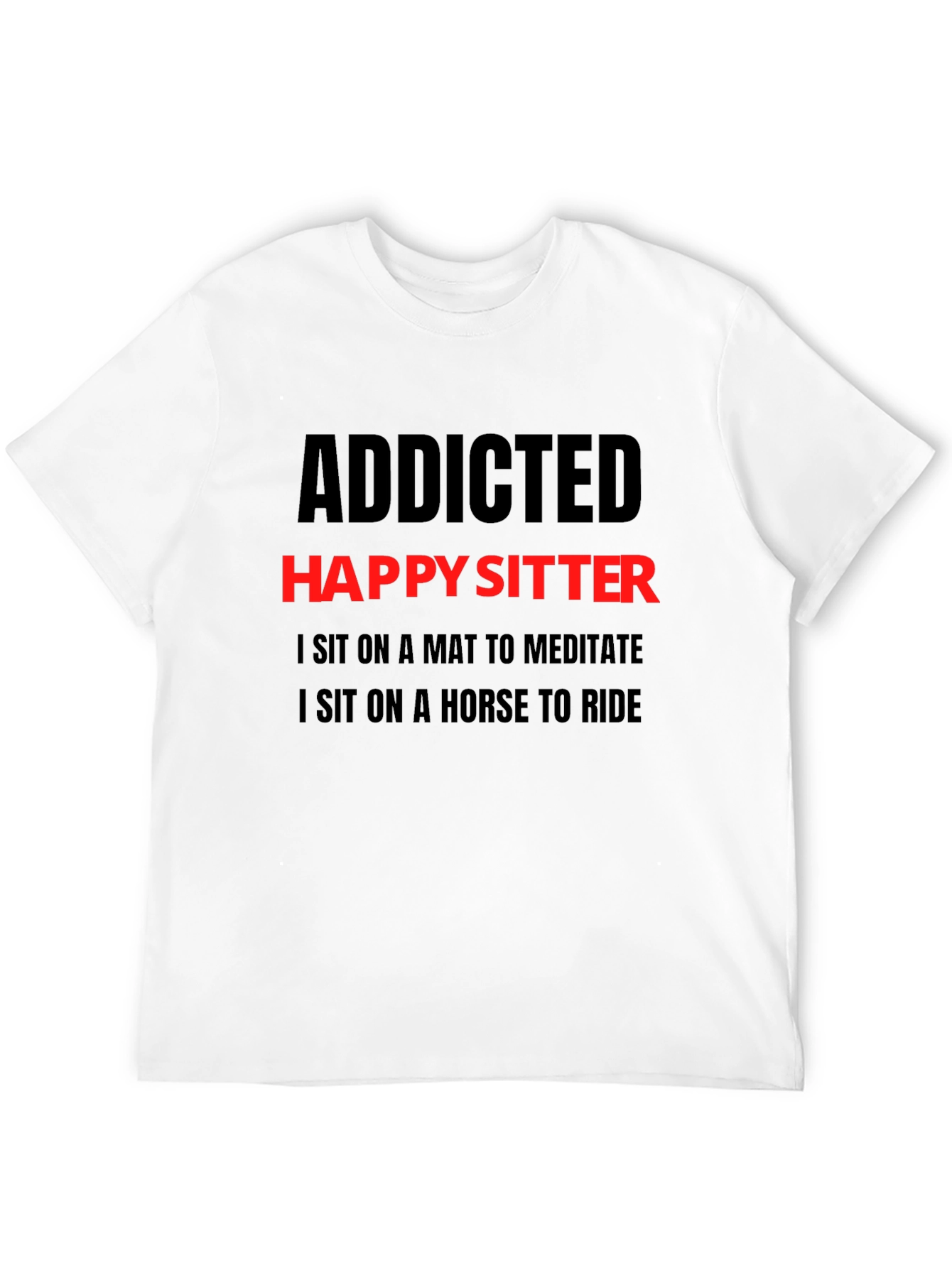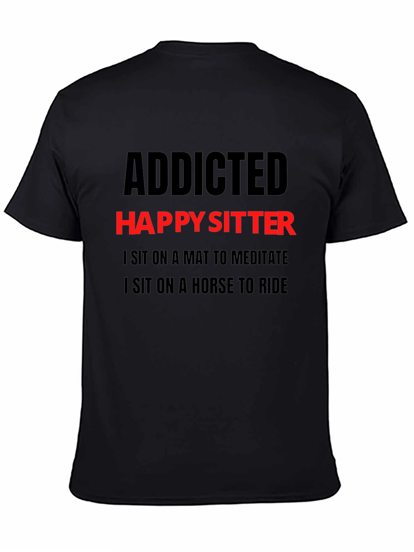 Show off your humorous side with this black "Addicted Happy Sitter" graphic t-shirt. Featuring bold red and black lettering, the shirt playfully states, "I Sit on a Mat to Meditate, I Sit on a Horse to Ride." Made from a comfortable-looking fabric, this tee is perfect for casual wear, lounging at home, or making a statement wherever you go. It's a great conversation starter and a fun addition to any wardrobe. This t-shirt is an ideal gift for someone with a good sense of humor.