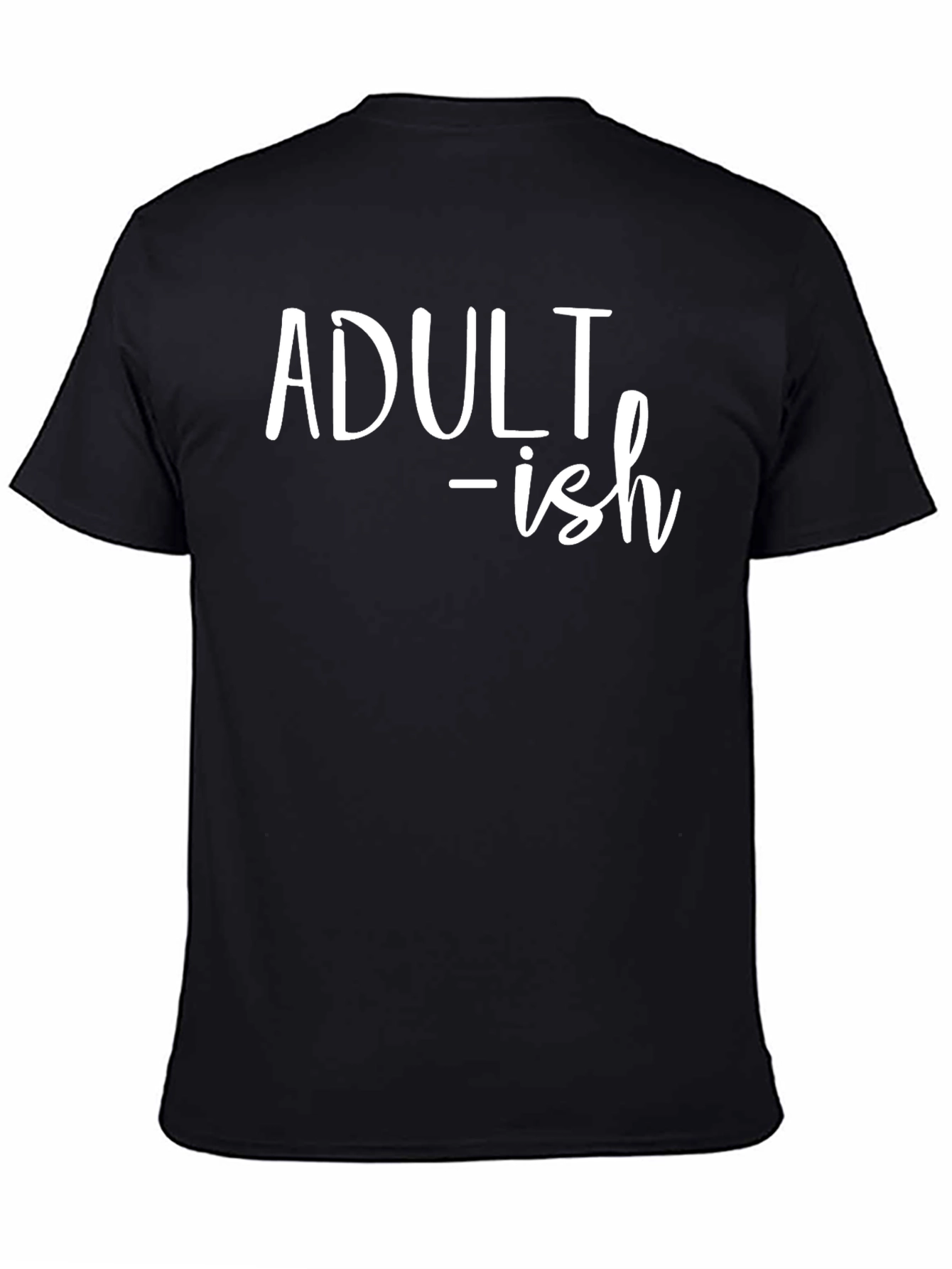 Show your playful side with this fun 'Adult-ish' graphic tee. Made from a comfortable, likely breathable fabric, this black t-shirt features a bold, white print that adds a touch of humor to your everyday style. The classic fit makes it a versatile piece for casual wear. Perfect for those who embrace the responsibilities of adulthood but still enjoy a lighthearted approach to life. This tee is ideal for weekend outings, casual Fridays, or lounging at home, offering a blend of comfort and style.