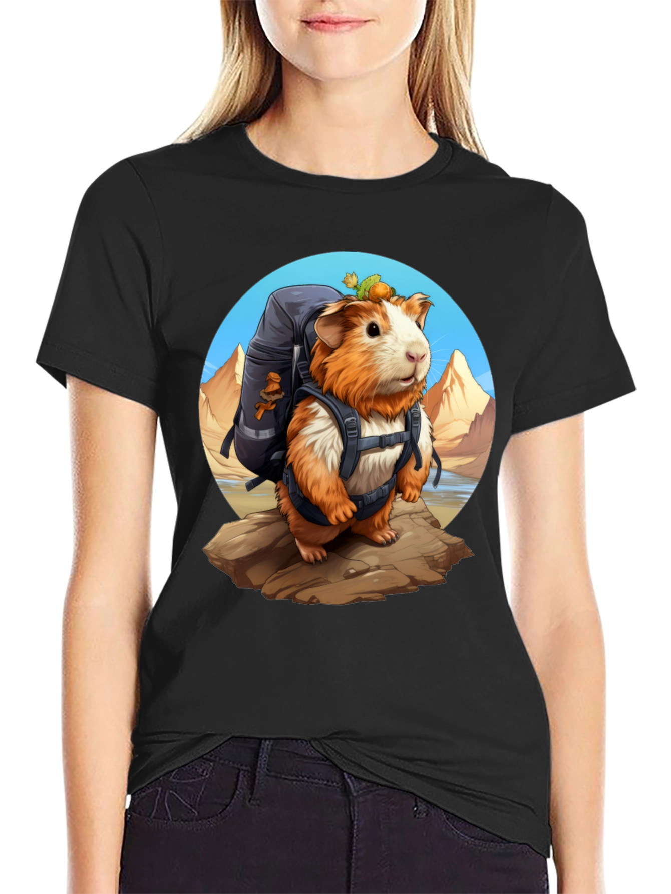 Embark on a whimsical journey with this eye-catching black t-shirt featuring a charming guinea pig explorer. This unique design showcases an adorable guinea pig wearing a backpack, ready for adventure in a mountainous landscape. The vibrant, detailed print stands out against the classic black background, making it a fun and stylish addition to any wardrobe. Perfect for animal lovers, hikers, and anyone with a playful spirit, this t-shirt is sure to spark conversation and smiles. Wear it on casual outings, nature walks, or simply to express your unique personality. Experience comfort and style in one delightful package!