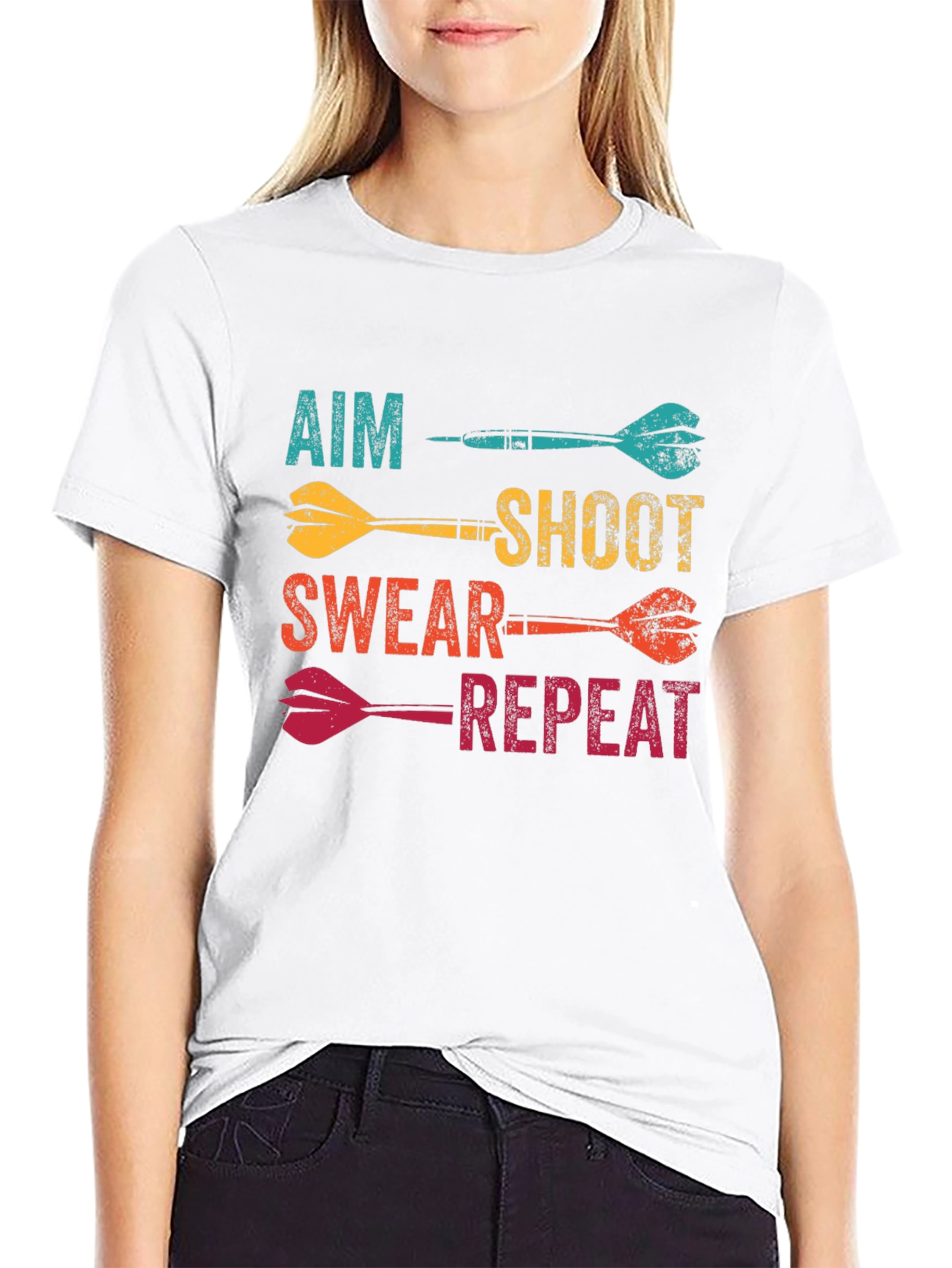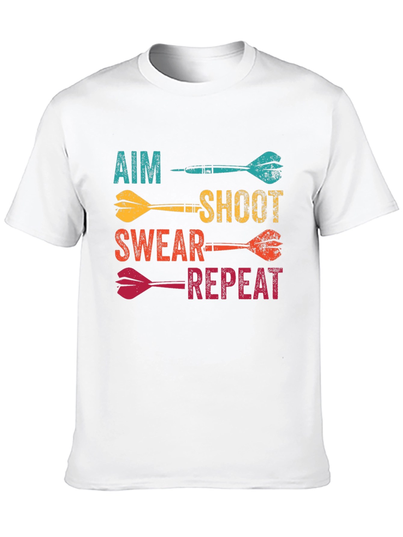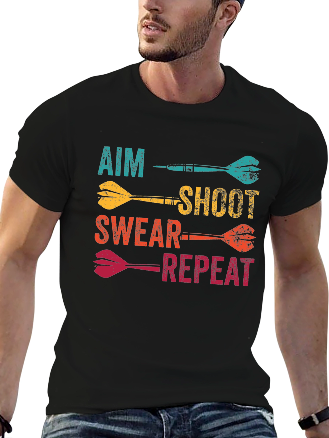 Show off your love for darts with this unique t-shirt! This black tee features a bold, eye-catching graphic with the words "AIM," "SHOOT," "SWEAR," and "REPEAT" stacked vertically, each paired with a colorful dart illustration. The vintage-inspired design gives it a cool, retro look. Perfect for casual wear, dart tournaments, or simply lounging around, this t-shirt is sure to spark conversation and showcase your passion for the game. A comfortable and stylish addition to any dart enthusiast's wardrobe.