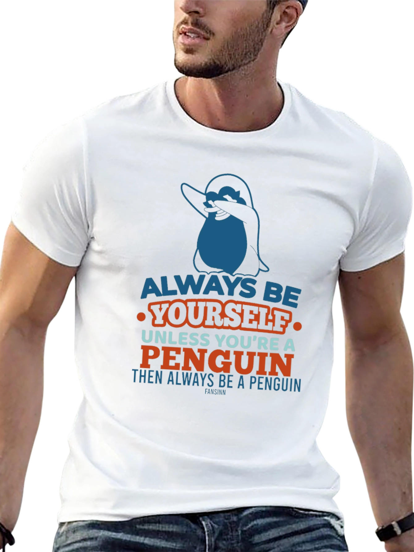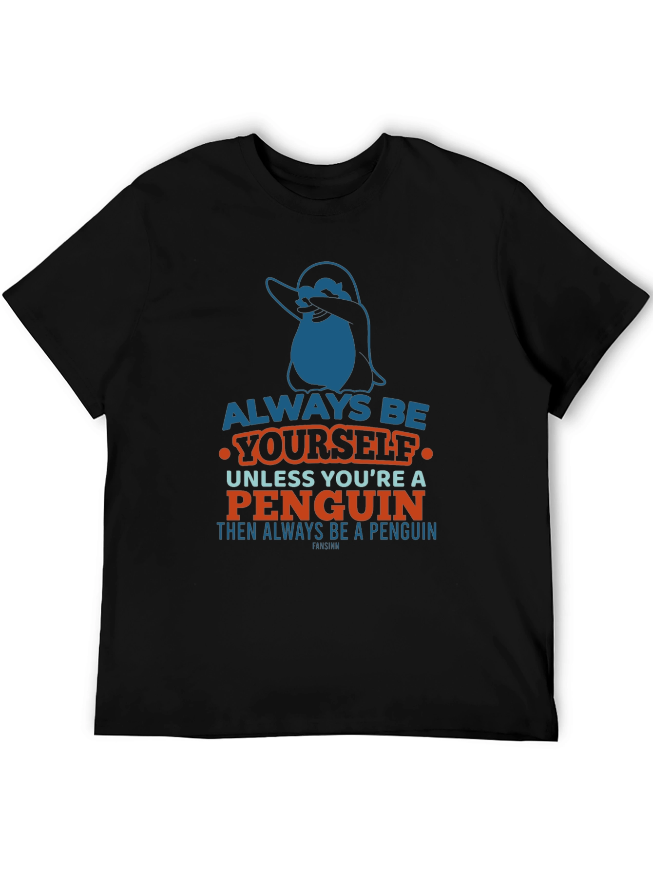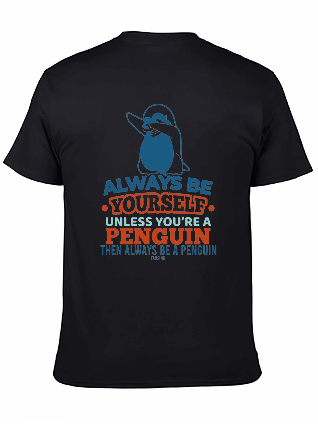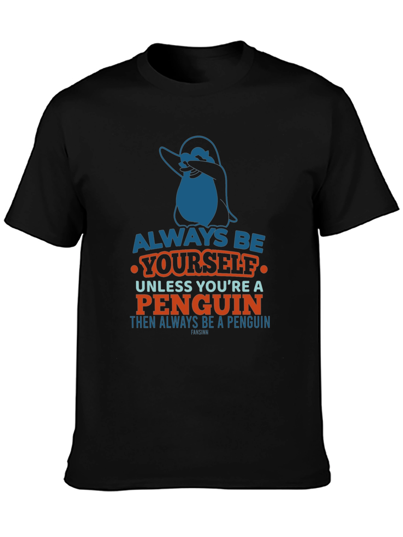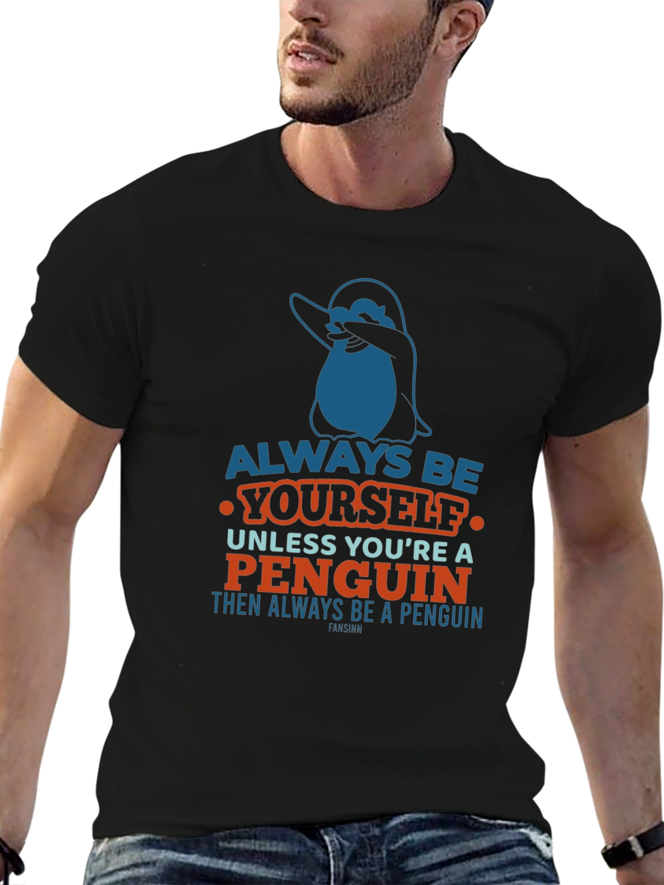 Show off your playful side with this unique black T-shirt. Featuring a fun graphic of a penguin doing the dab, paired with the humorous text "Always Be Yourself. Unless You're A Penguin. Then Always Be A Penguin", this tee is sure to spark conversations. Made from a soft, comfortable fabric, it's perfect for casual wear. Whether you're a penguin lover, enjoy quirky designs, or simply want to add a touch of humor to your wardrobe, this shirt is a great choice. Get ready to spread some smiles and turn heads!