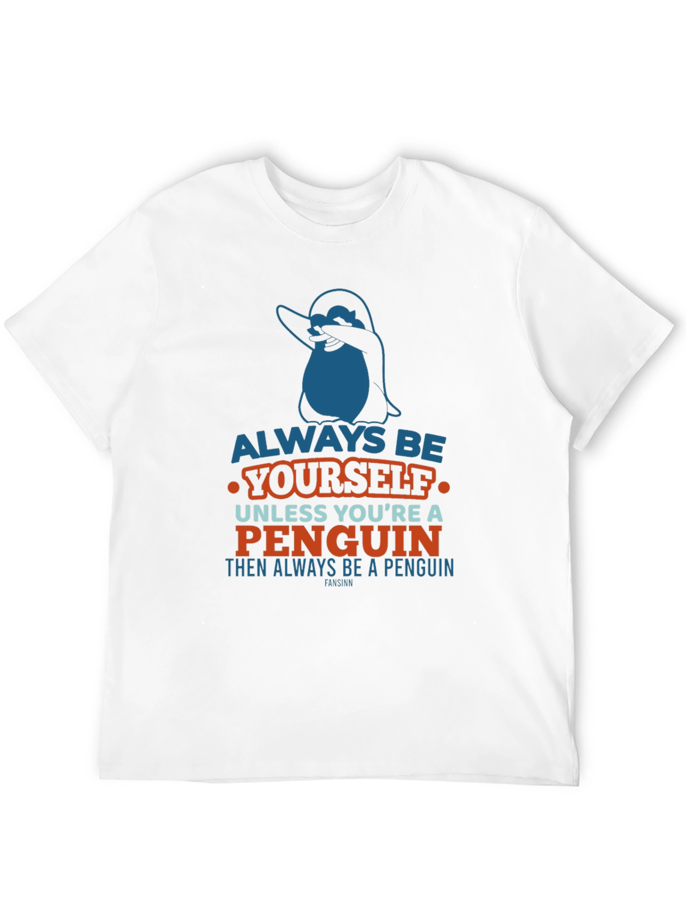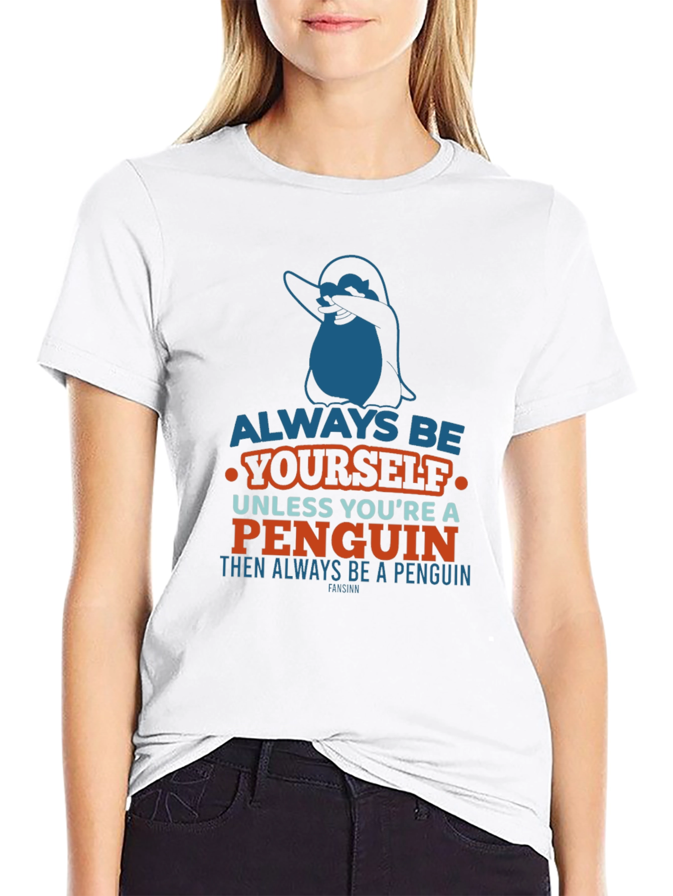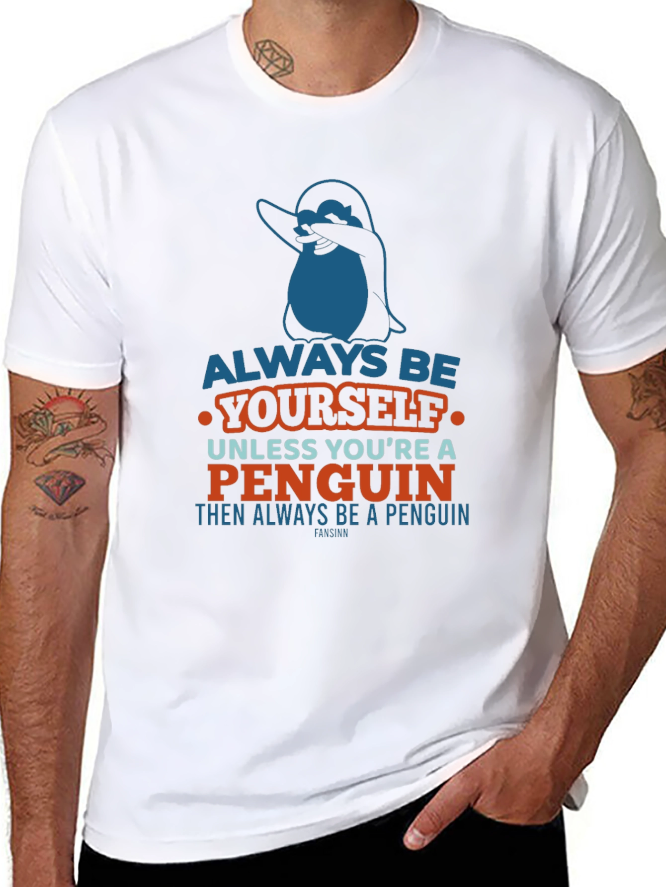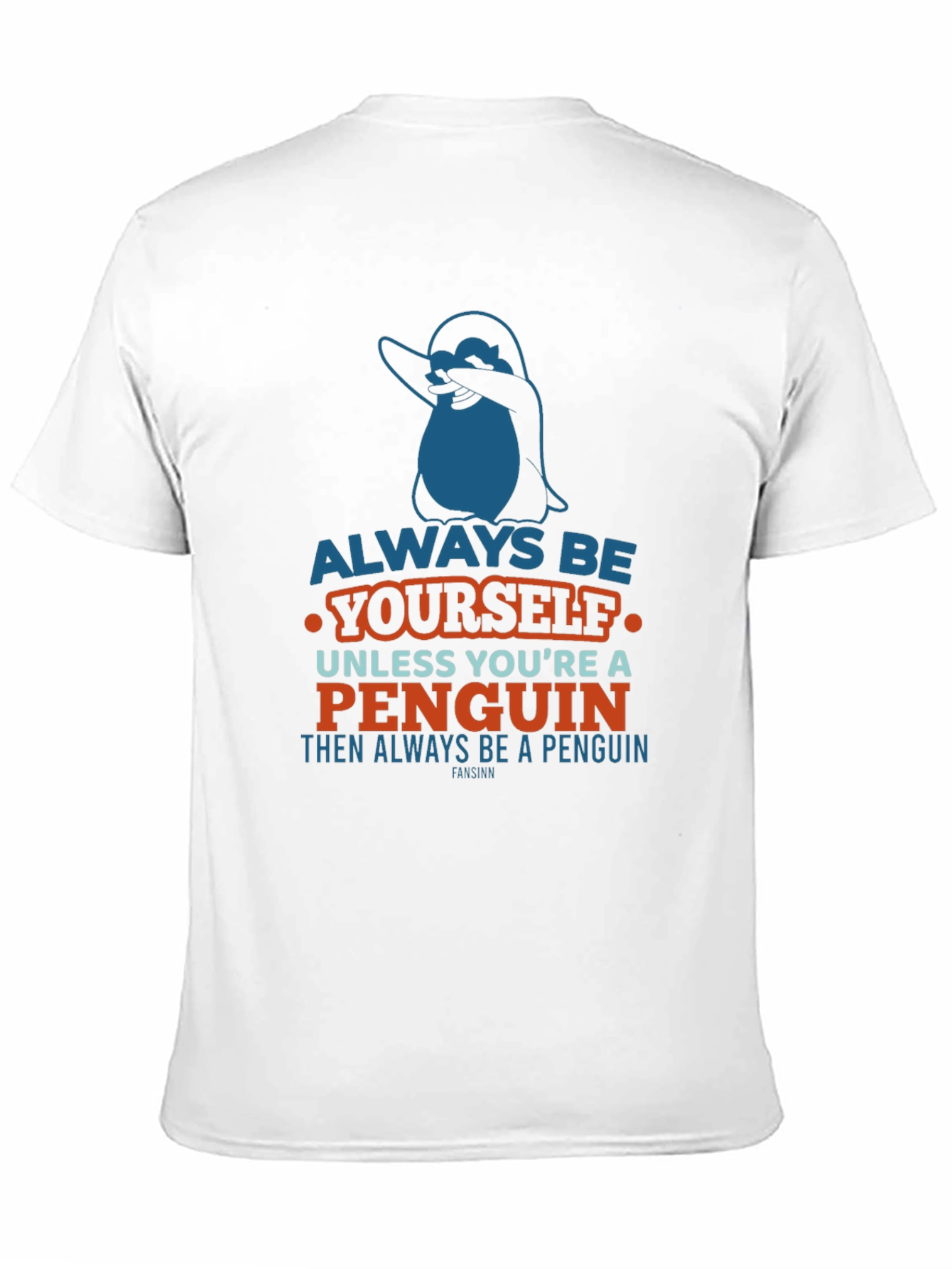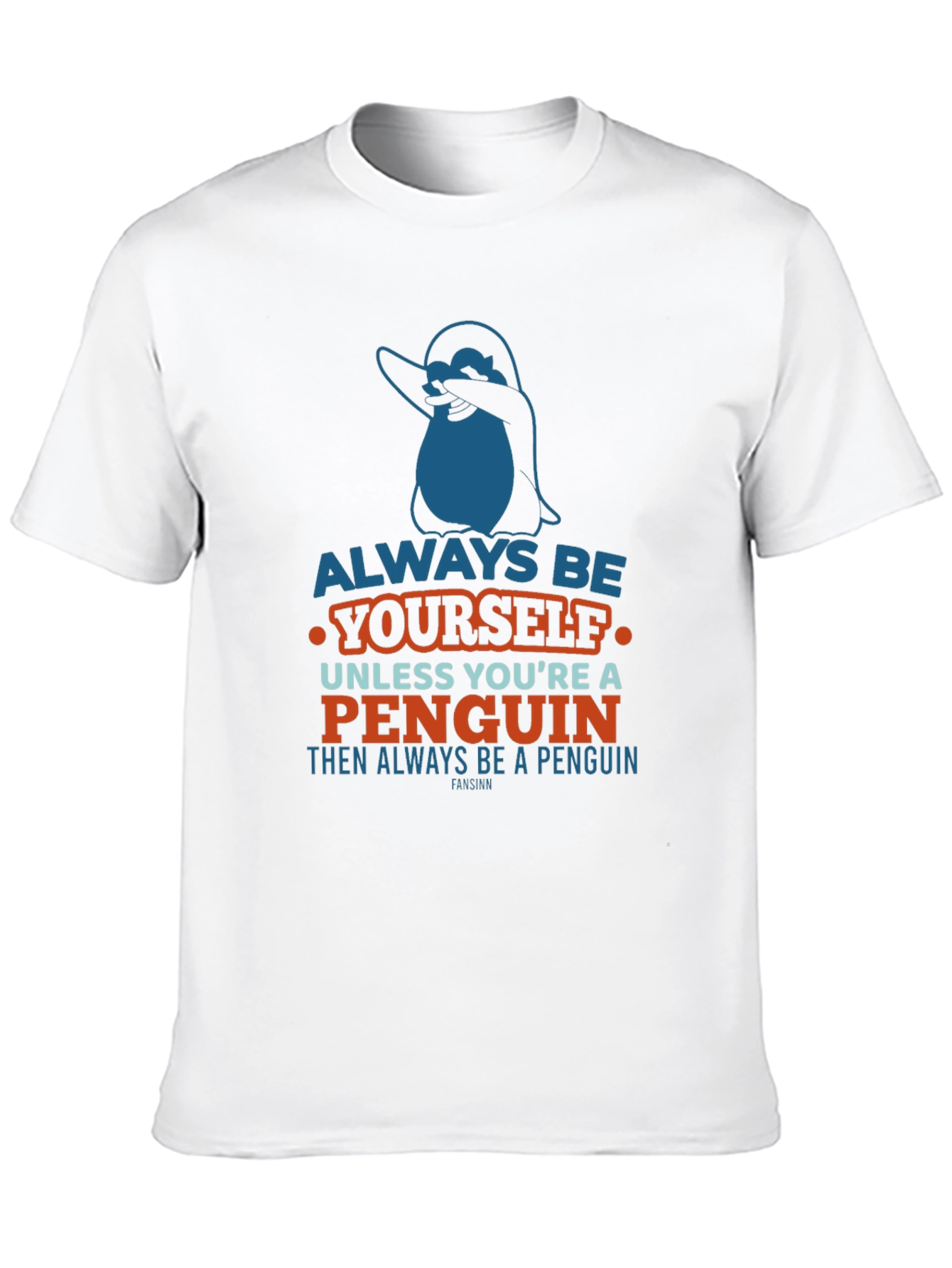 Show off your playful side with this unique black T-shirt. Featuring a fun graphic of a penguin doing the dab, paired with the humorous text "Always Be Yourself. Unless You're A Penguin. Then Always Be A Penguin", this tee is sure to spark conversations. Made from a soft, comfortable fabric, it's perfect for casual wear. Whether you're a penguin lover, enjoy quirky designs, or simply want to add a touch of humor to your wardrobe, this shirt is a great choice. Get ready to spread some smiles and turn heads!