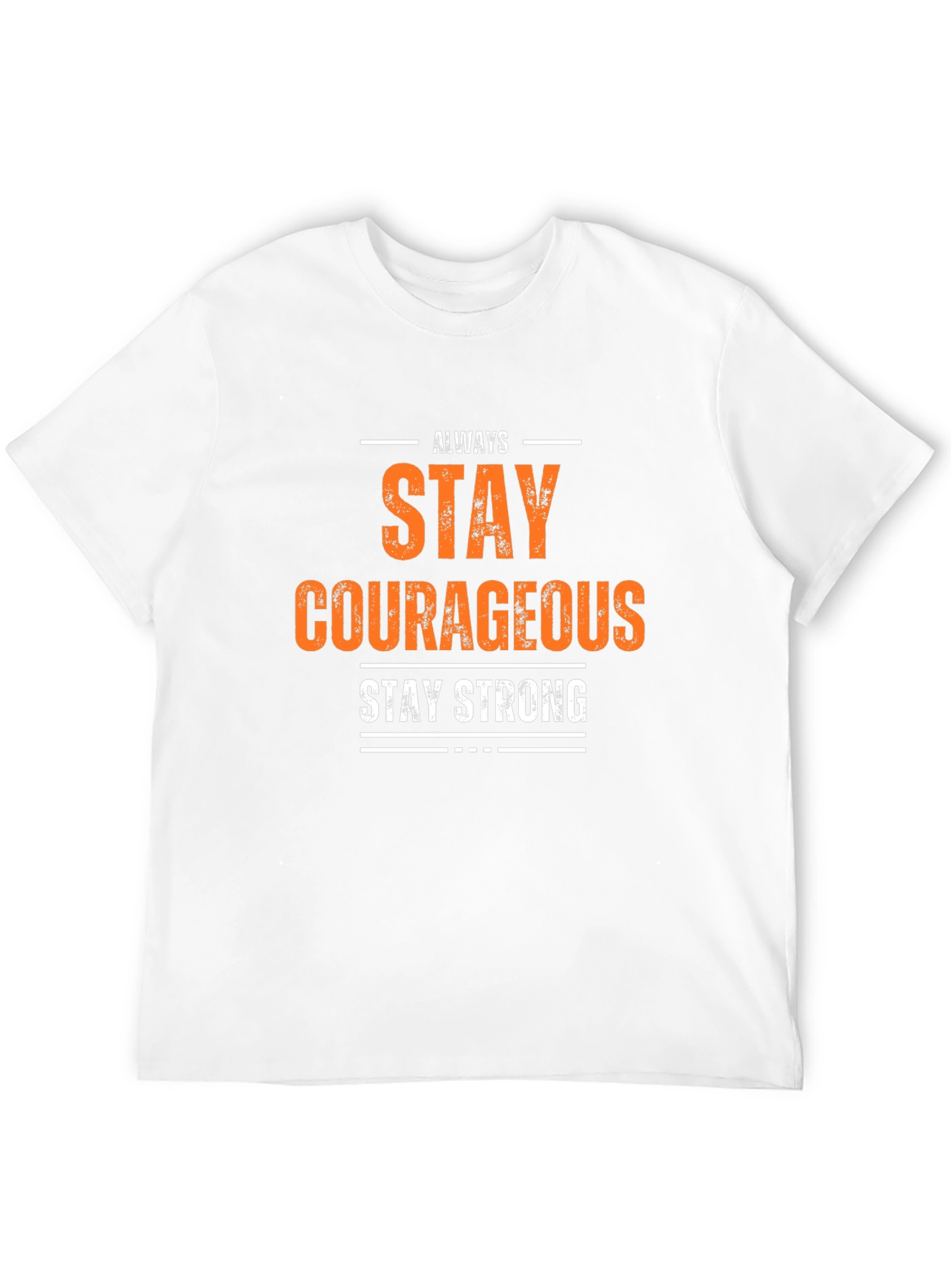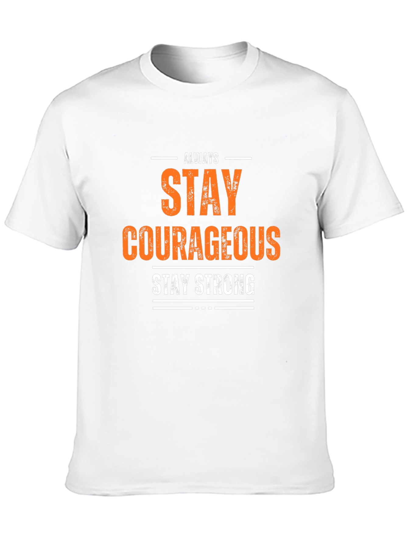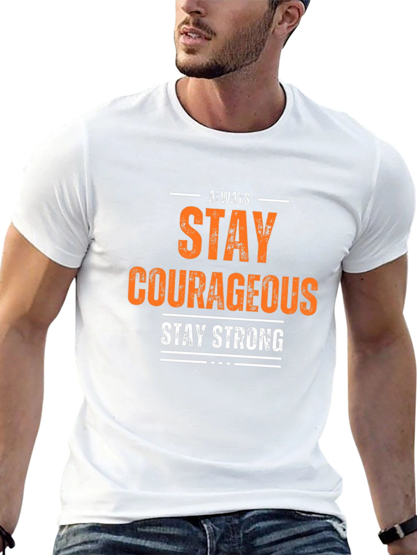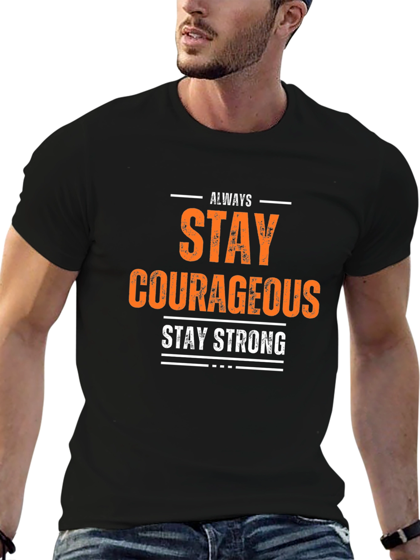 This classic black t-shirt features a powerful and inspiring message. Bold orange lettering proclaims "ALWAYS STAY COURAGEOUS," followed by "STAY STRONG" in white, creating a striking contrast. The design is modern and clean, making it suitable for everyday wear. The shirt appears to be made from a comfortable, breathable material, perfect for casual outings or workouts. Wear this tee as a reminder to stay resilient and positive, or gift it to someone who needs a boost of encouragement. It's an excellent choice for anyone seeking comfort and style with a meaningful message.