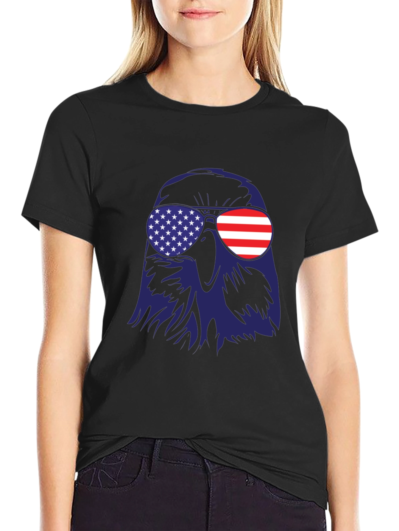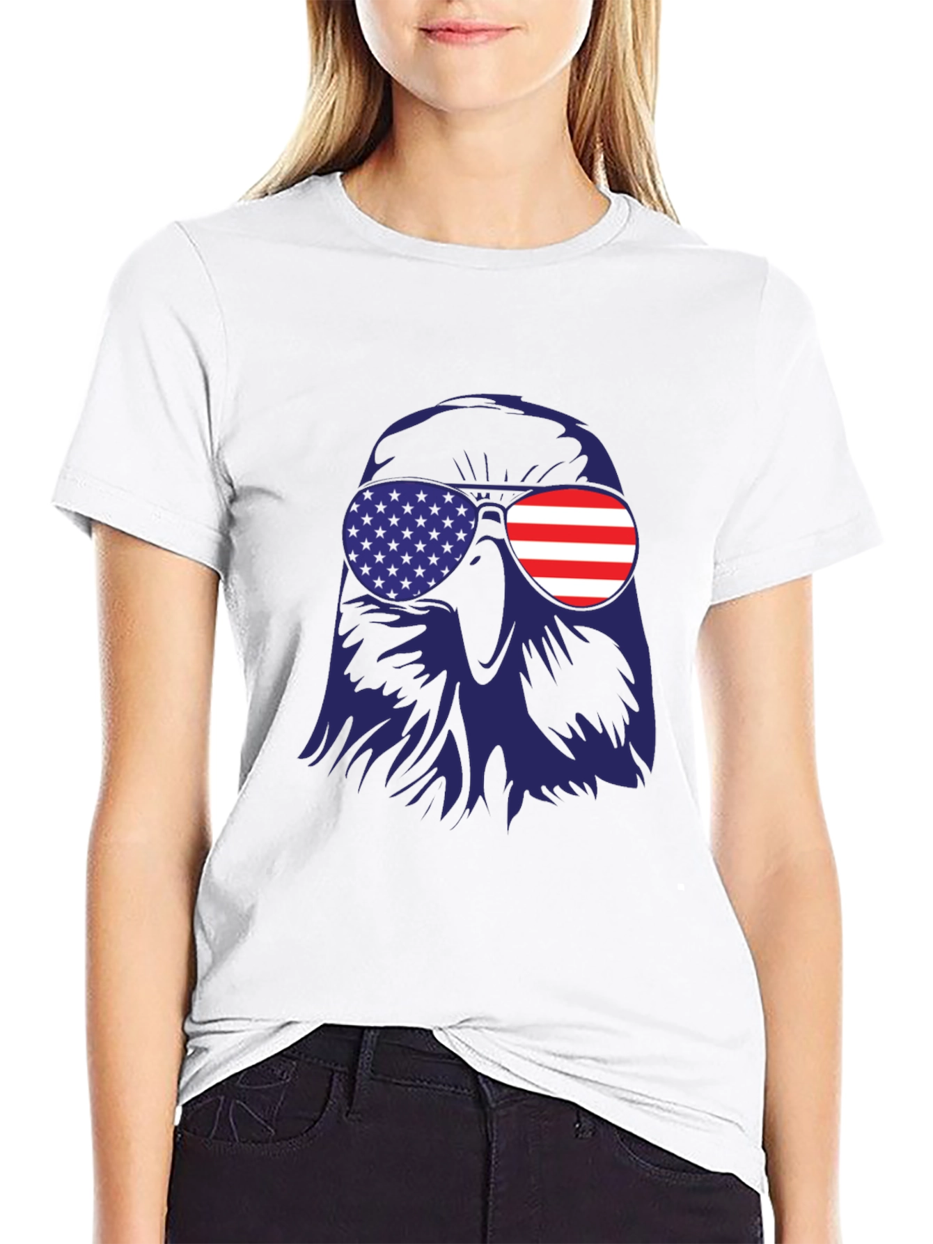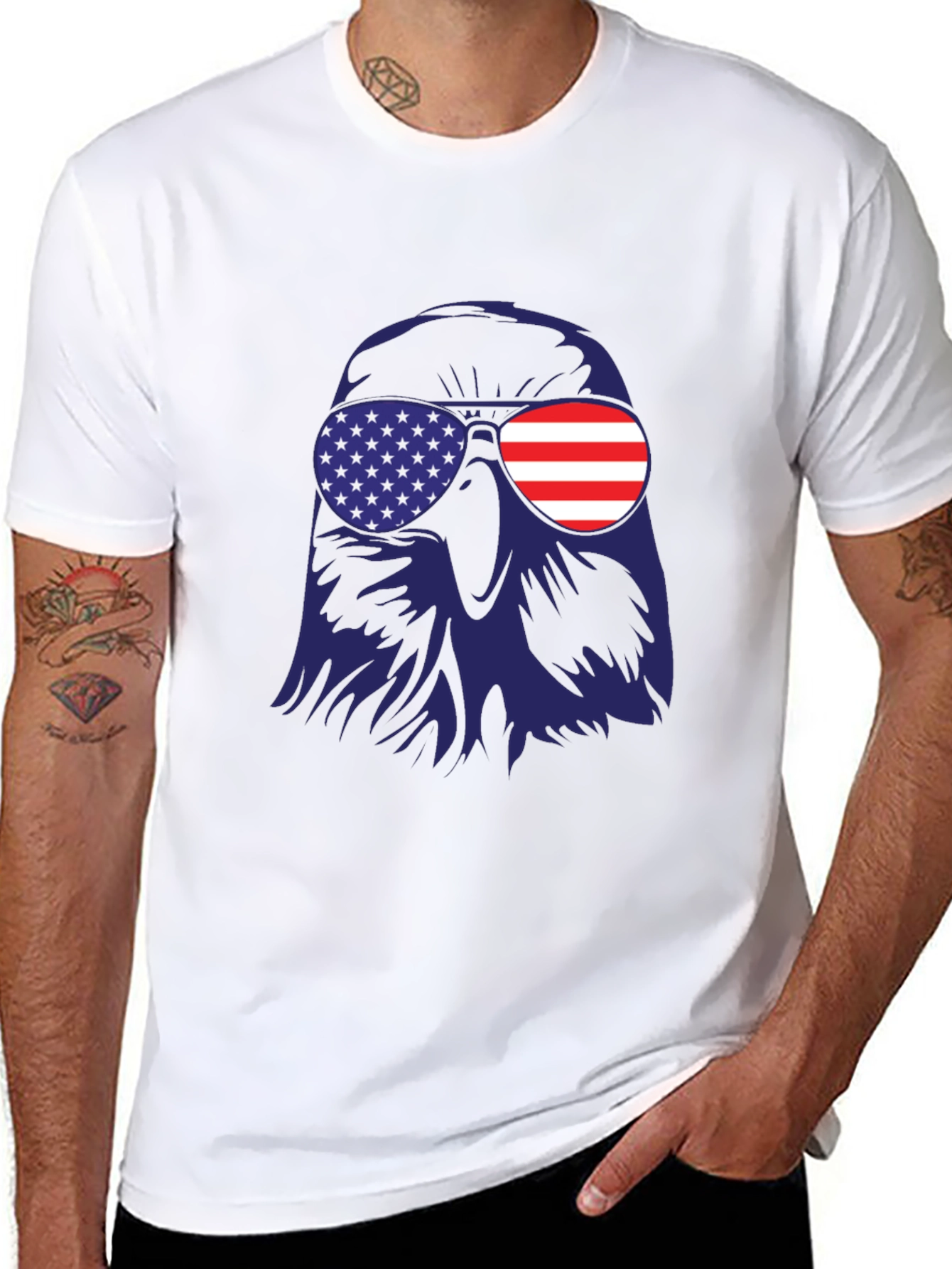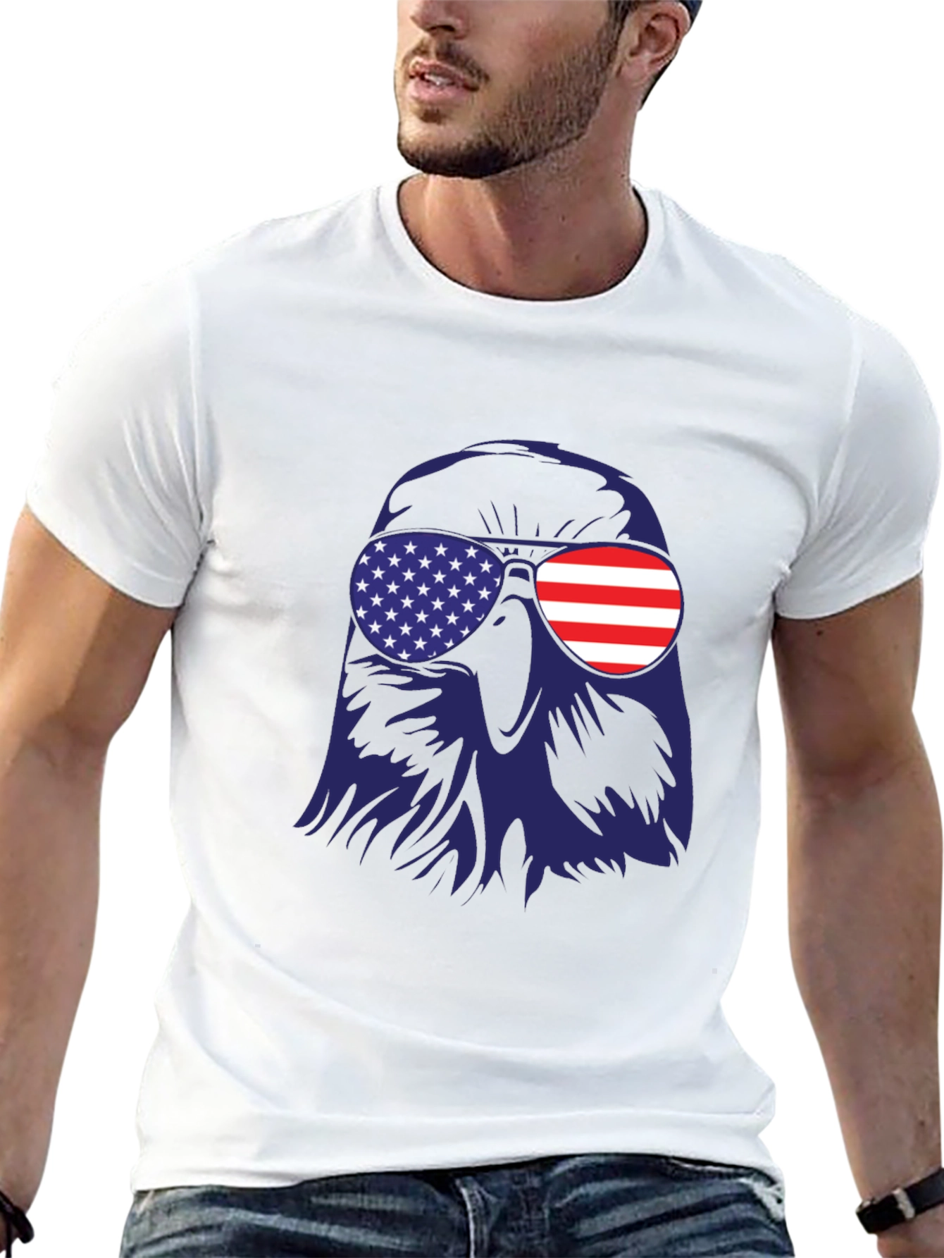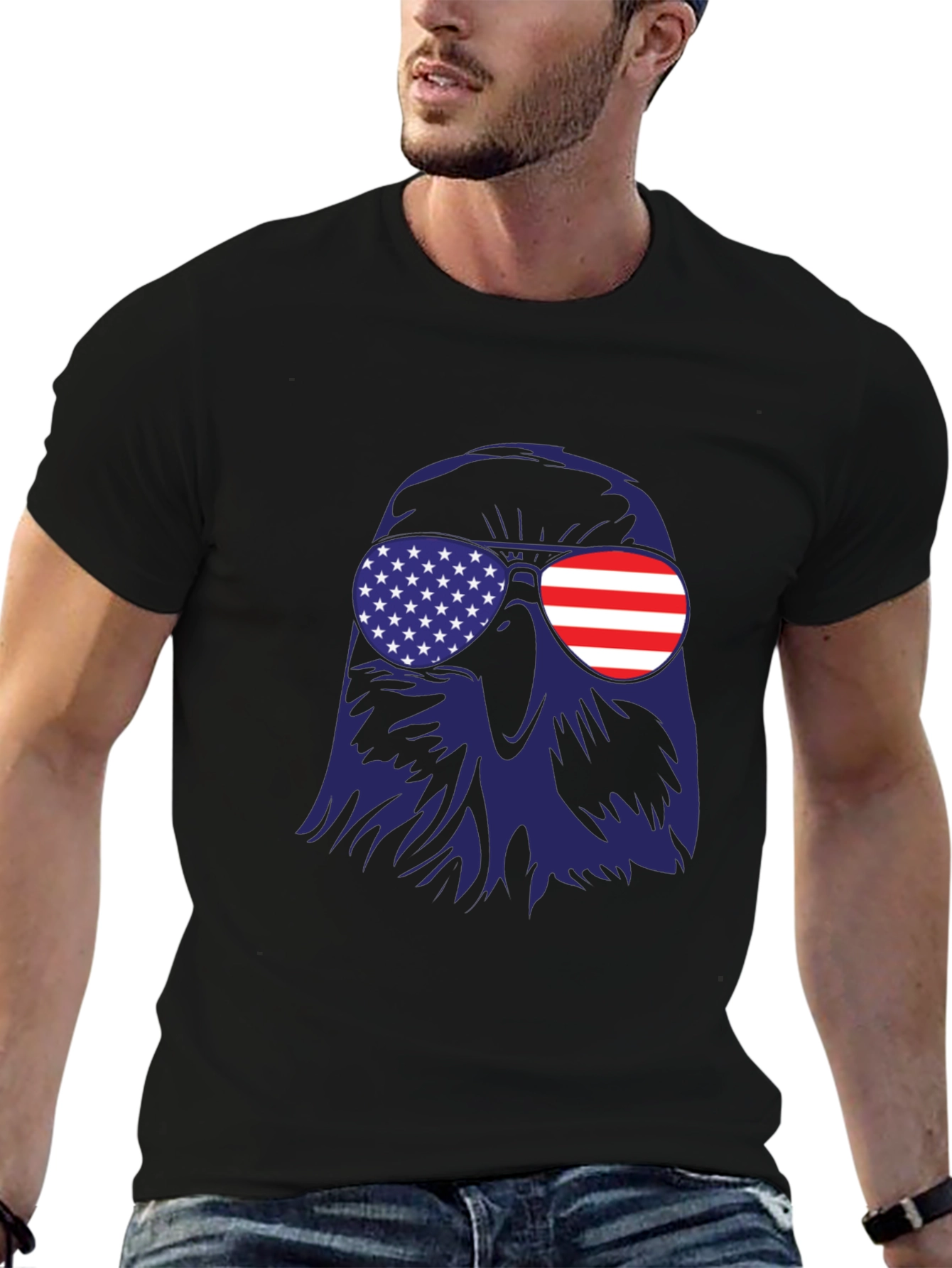 Show your American pride with this bold and stylish t-shirt. The design features a striking graphic of an eagle wearing sunglasses with American flag details on both lenses. Made from a comfortable, lightweight fabric, this tee is perfect for casual wear, summer events, or patriotic celebrations. Whether you're attending a 4th of July barbecue, a Memorial Day parade, or simply want to display your love for the USA, this shirt is a fantastic choice. Get yours today and wear your patriotism with pride!