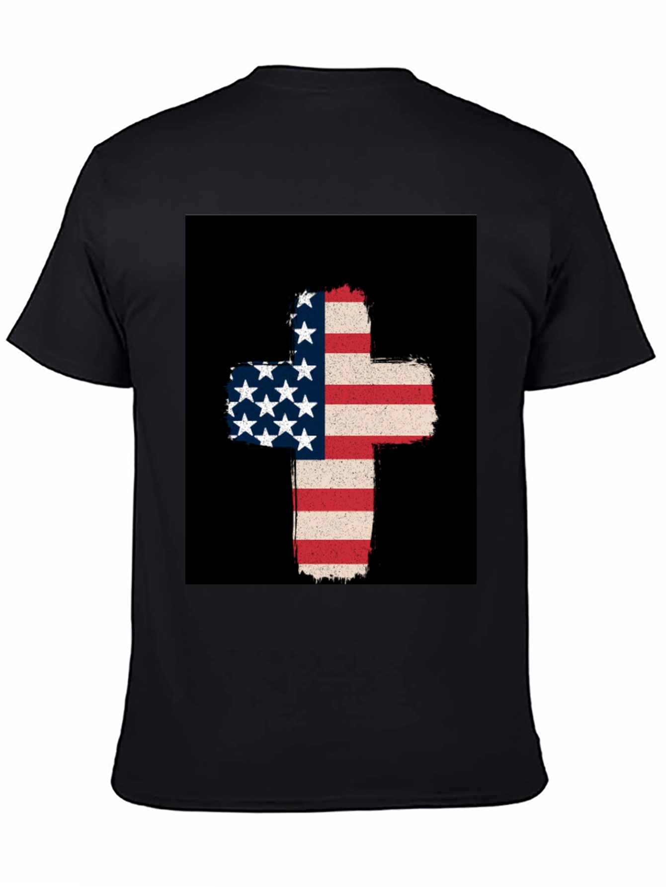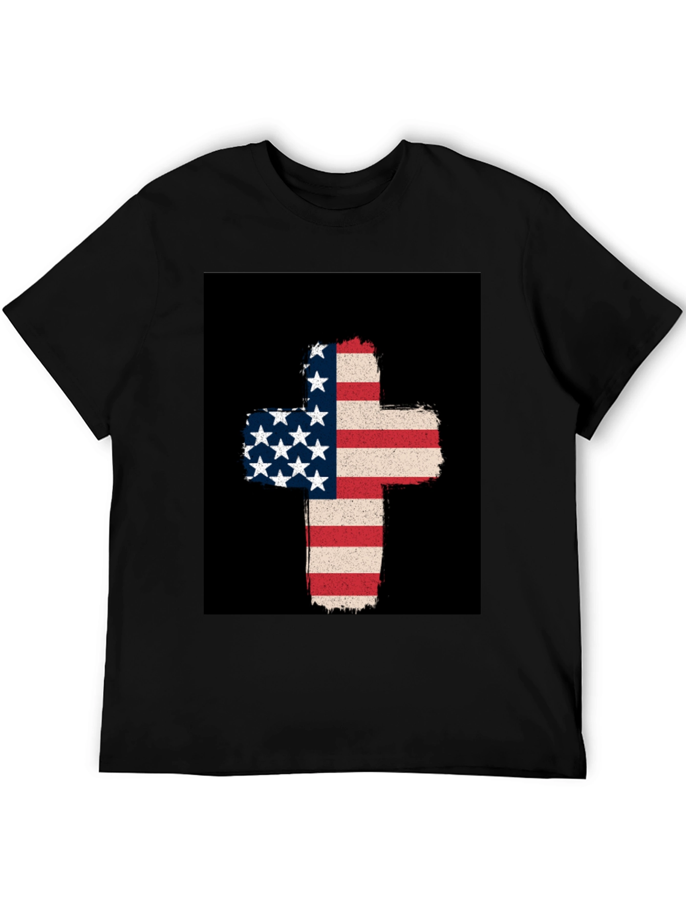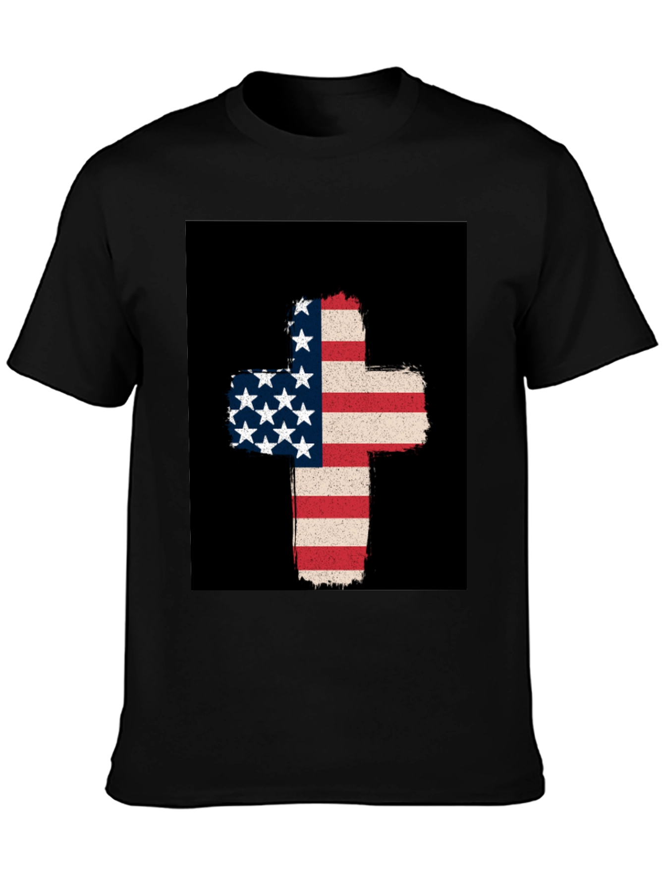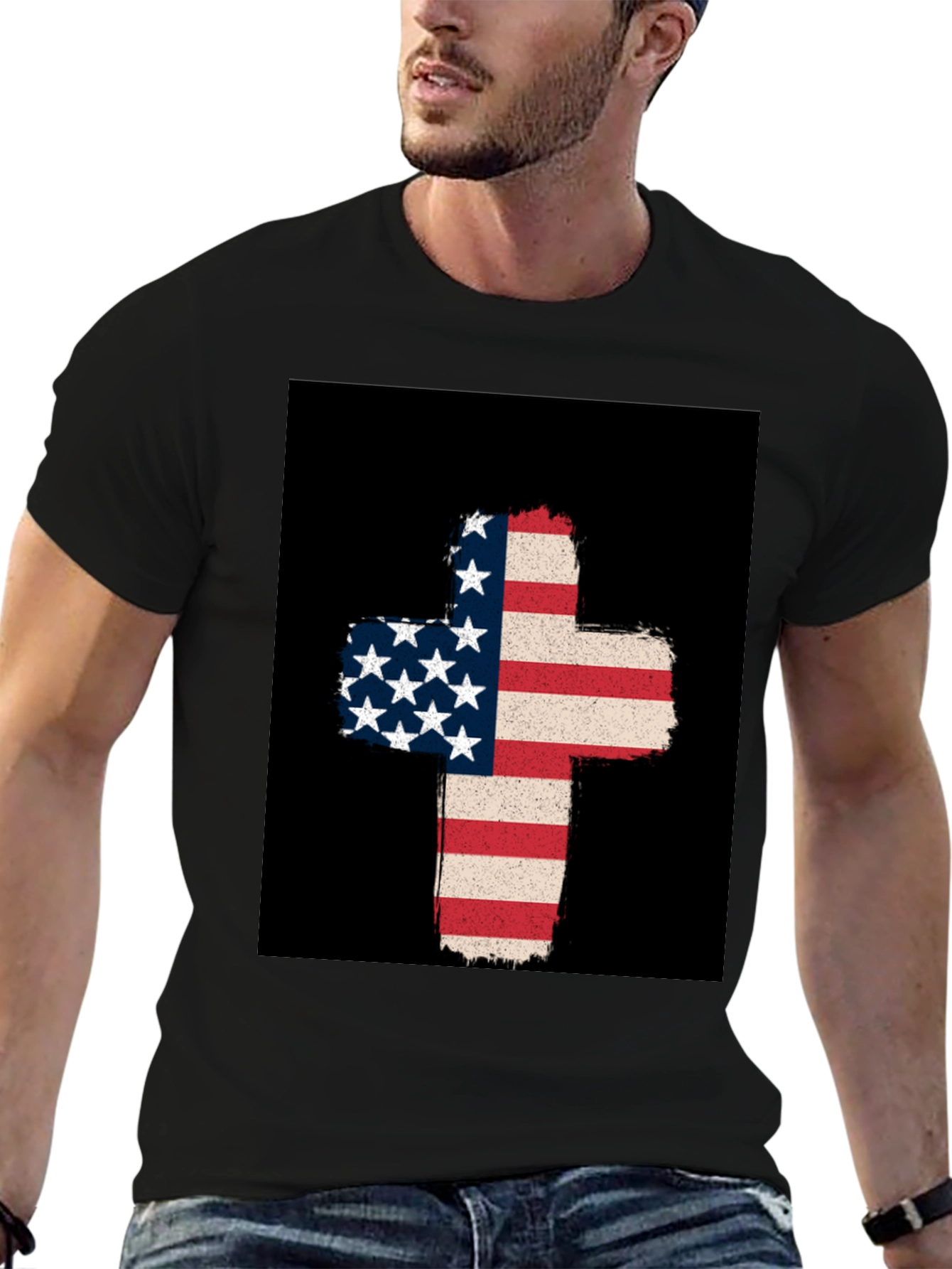 Showcase your patriotic spirit with this eye-catching graphic tee. The shirt features a unique design of a cross overlaid with the American flag pattern, blending faith and national pride. The distressed, vintage look adds a touch of timeless appeal. Made from comfortable, breathable fabric, this tee is perfect for casual wear, patriotic holidays, or expressing your values. Pair it with jeans or shorts for a relaxed yet stylish look. Available in a classic black that makes the design pop, this tee is a must-have addition to any wardrobe.