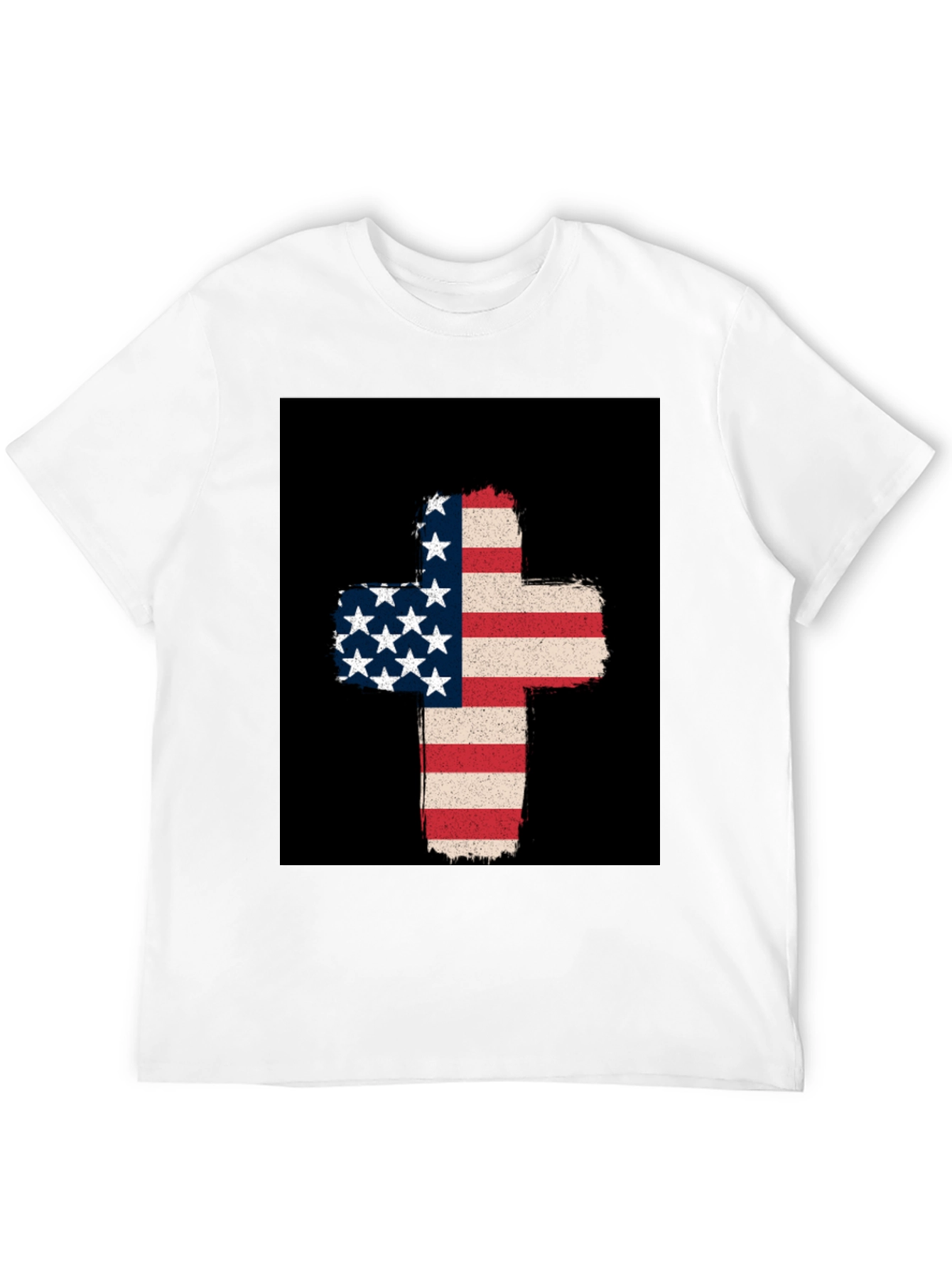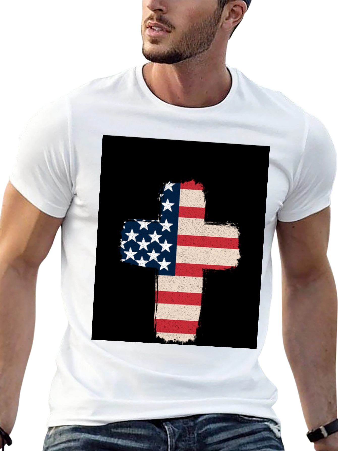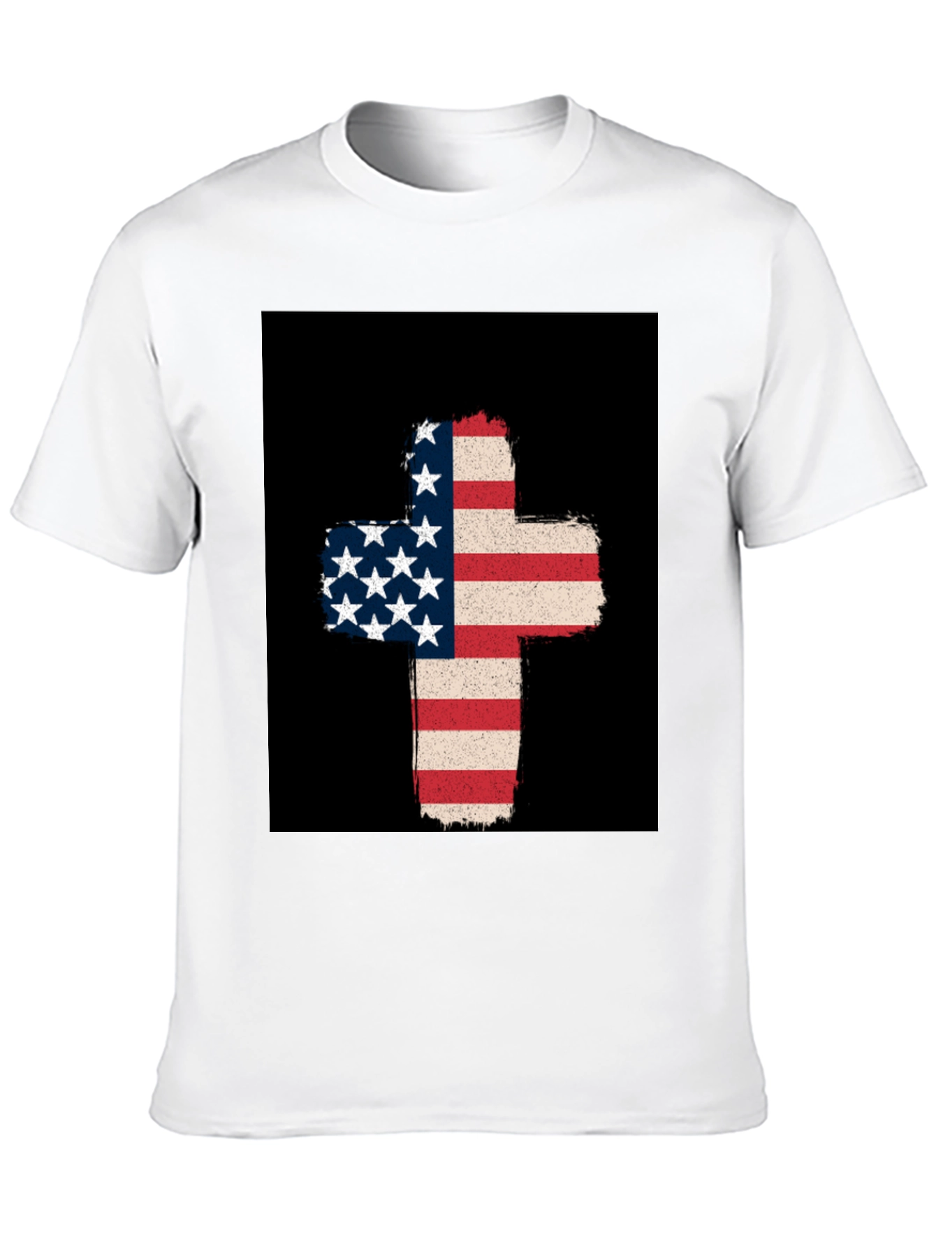 Showcase your patriotic spirit with this eye-catching graphic tee. The shirt features a unique design of a cross overlaid with the American flag pattern, blending faith and national pride. The distressed, vintage look adds a touch of timeless appeal. Made from comfortable, breathable fabric, this tee is perfect for casual wear, patriotic holidays, or expressing your values. Pair it with jeans or shorts for a relaxed yet stylish look. Available in a classic black that makes the design pop, this tee is a must-have addition to any wardrobe.