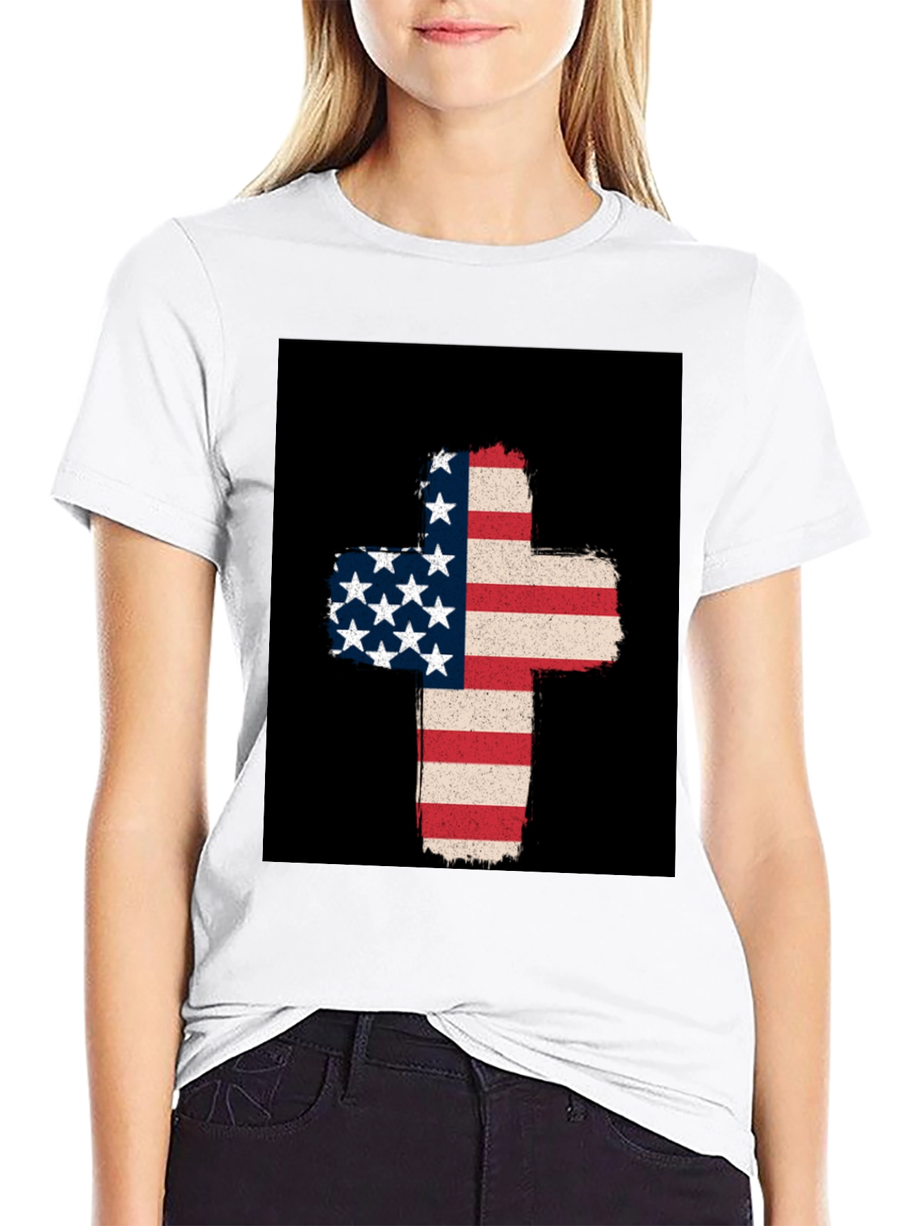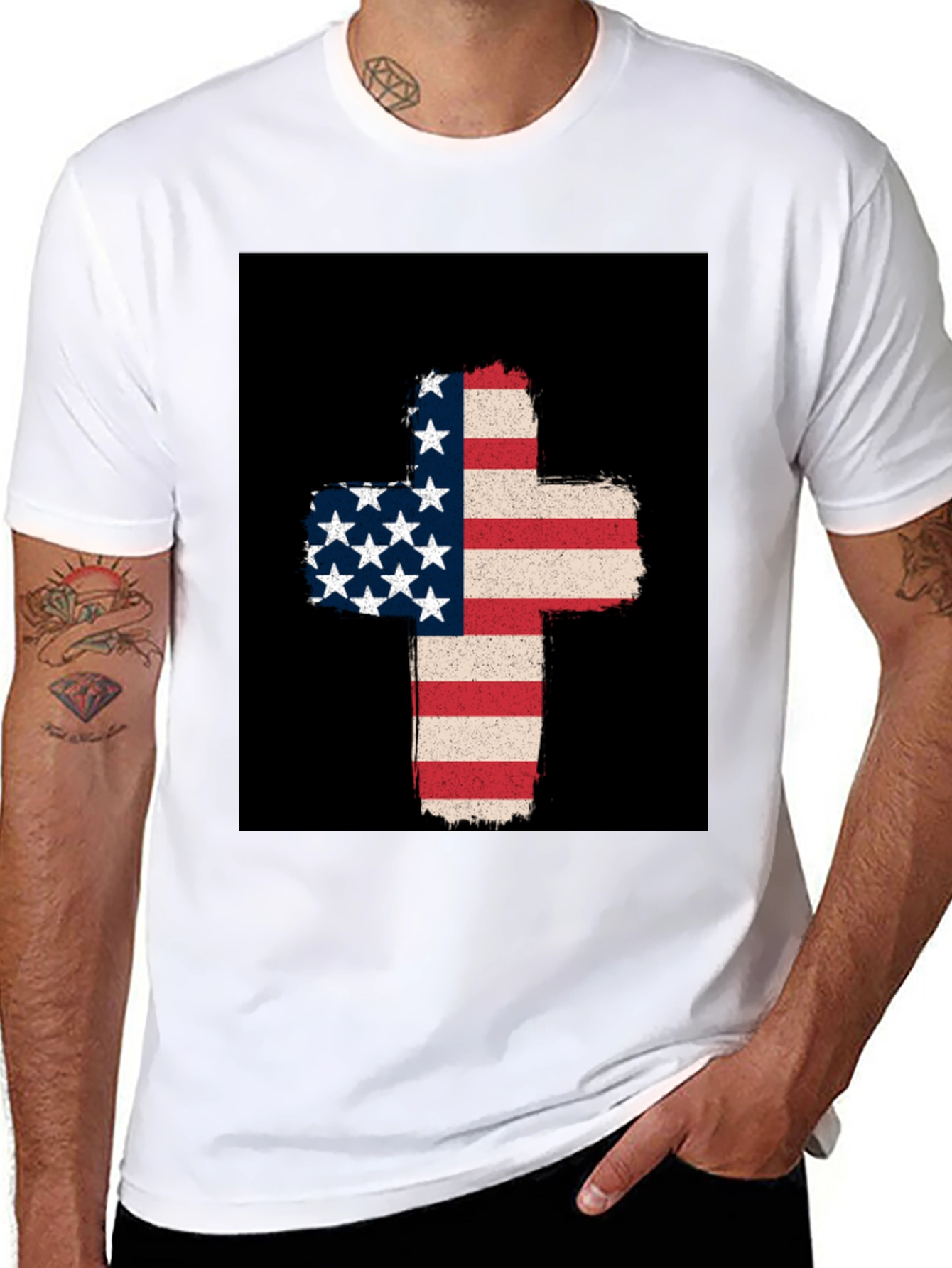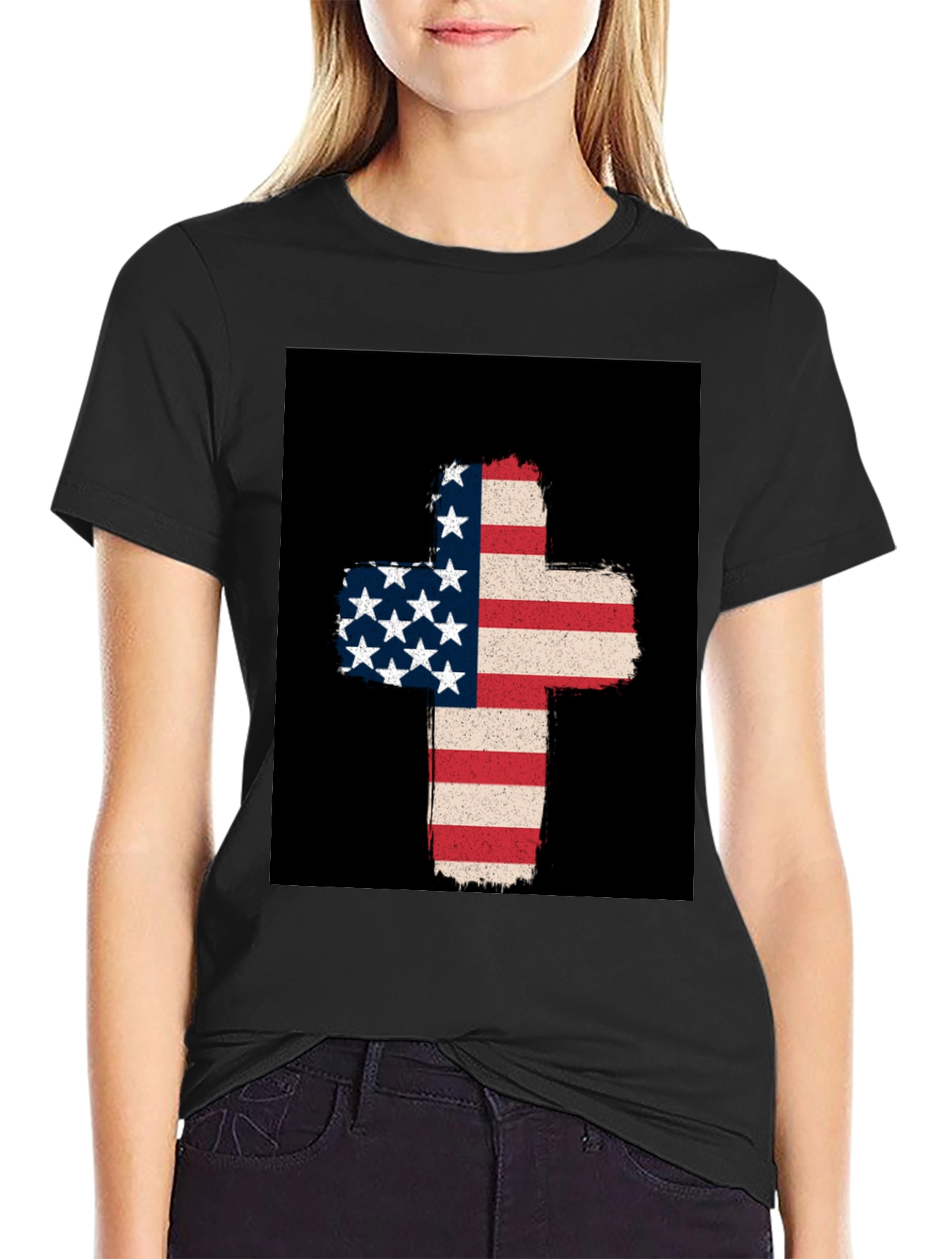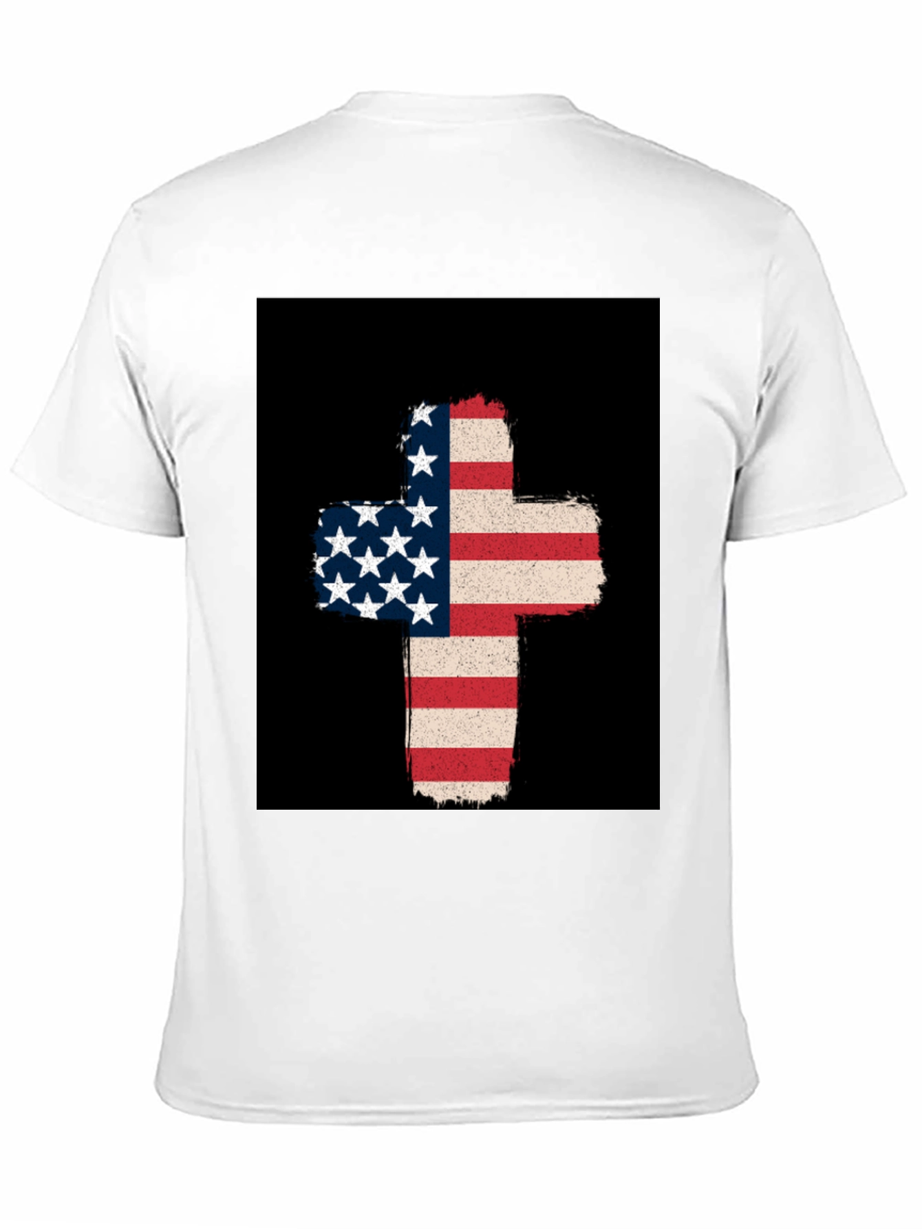 Showcase your patriotic spirit with this eye-catching graphic tee. The shirt features a unique design of a cross overlaid with the American flag pattern, blending faith and national pride. The distressed, vintage look adds a touch of timeless appeal. Made from comfortable, breathable fabric, this tee is perfect for casual wear, patriotic holidays, or expressing your values. Pair it with jeans or shorts for a relaxed yet stylish look. Available in a classic black that makes the design pop, this tee is a must-have addition to any wardrobe.