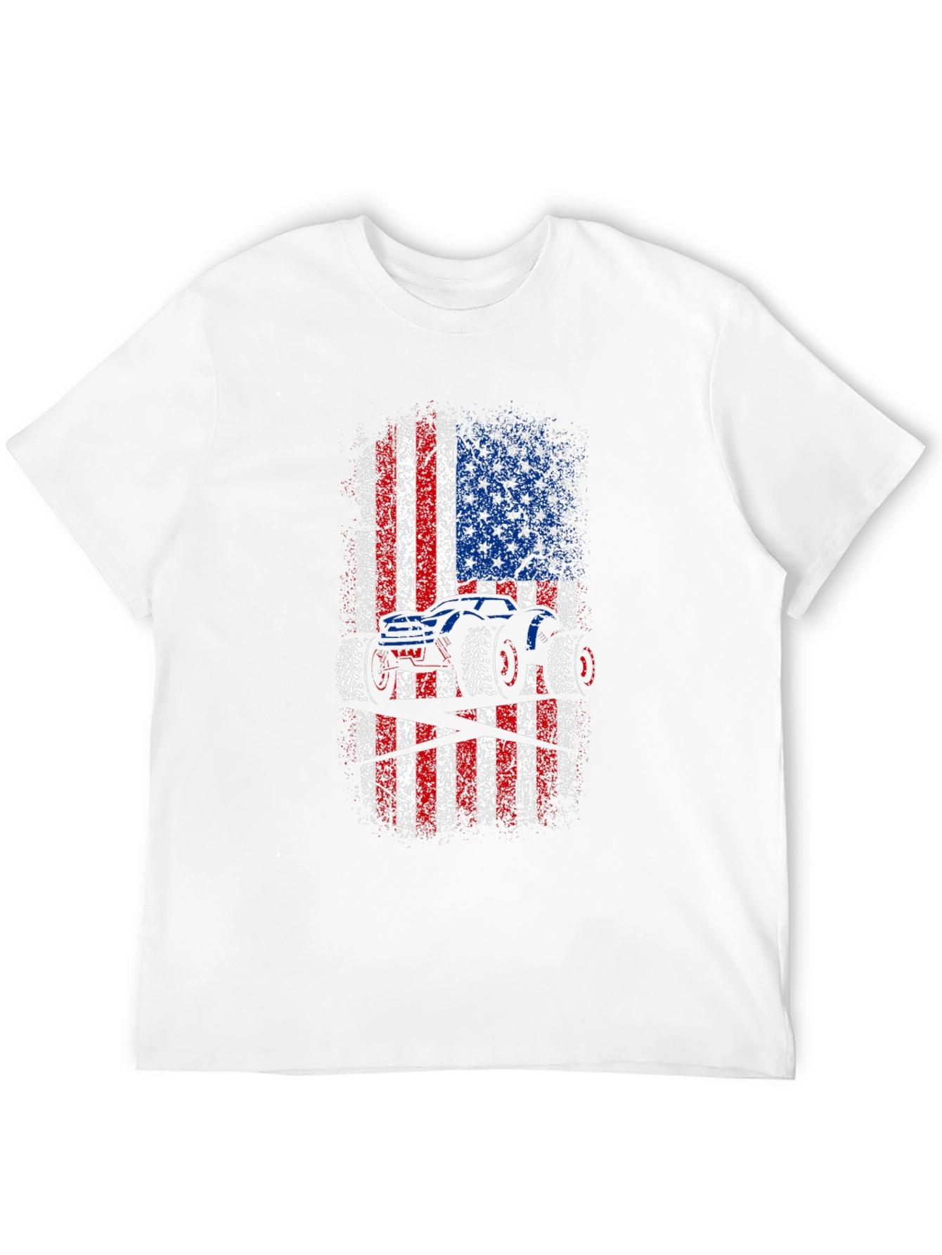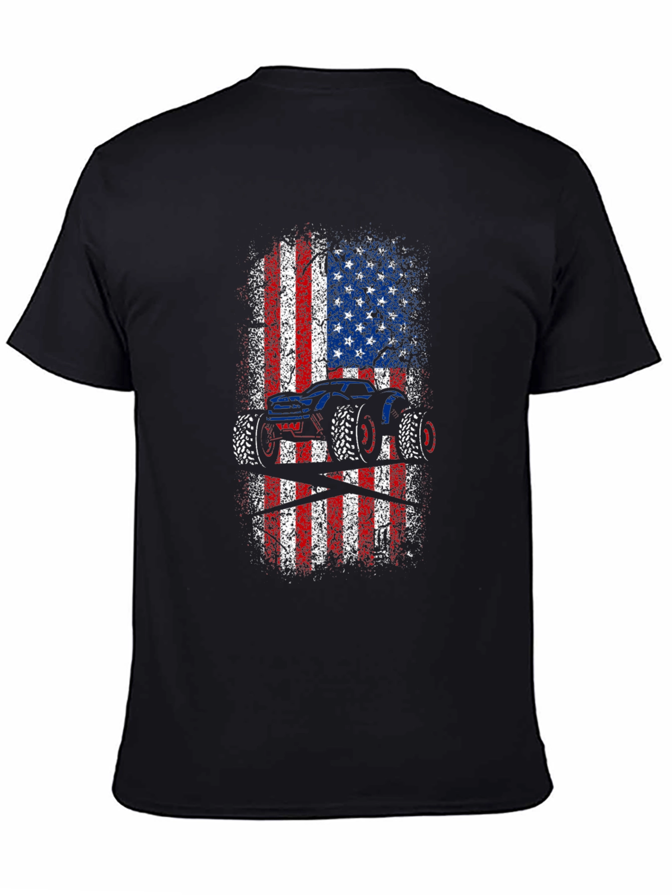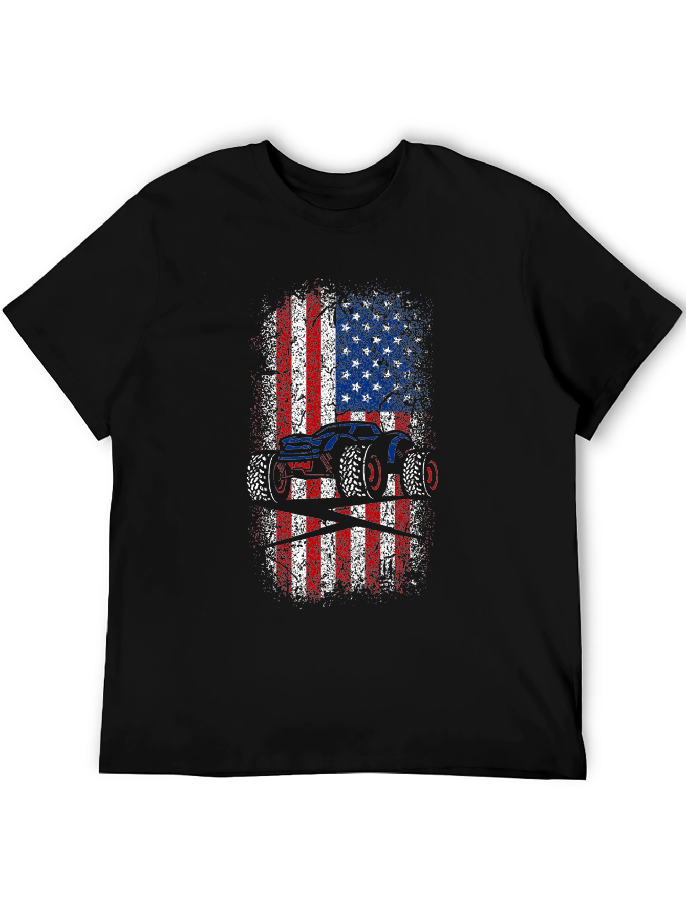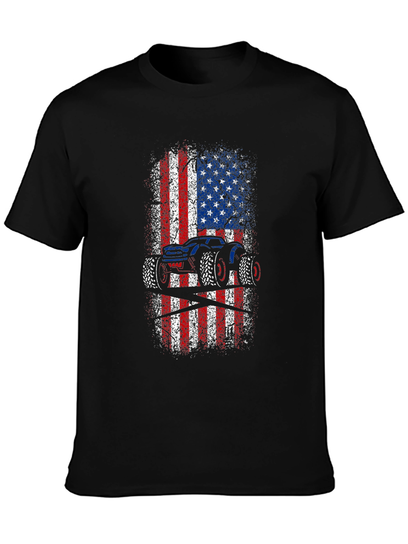 Show off your love for monster trucks and American pride with this unique graphic tee! This black t-shirt features a bold, distressed American flag design with a striking monster truck silhouette overlaid. The red, white, and blue colors pop against the dark background, creating a visually appealing and patriotic statement. Made from comfortable, breathable fabric, this tee is perfect for everyday wear, casual outings, or showing your support at monster truck events. A must-have for any truck enthusiast or proud American!