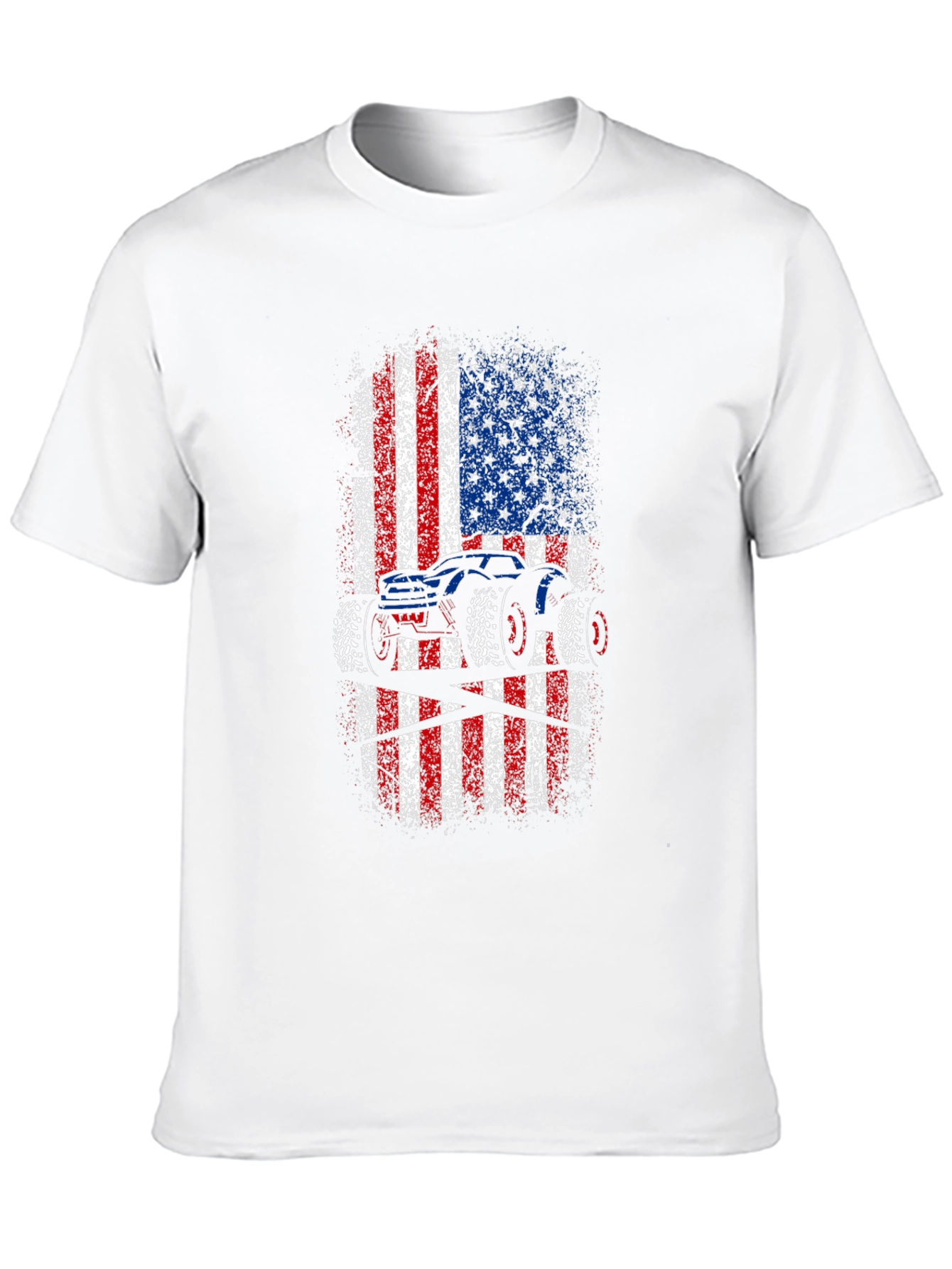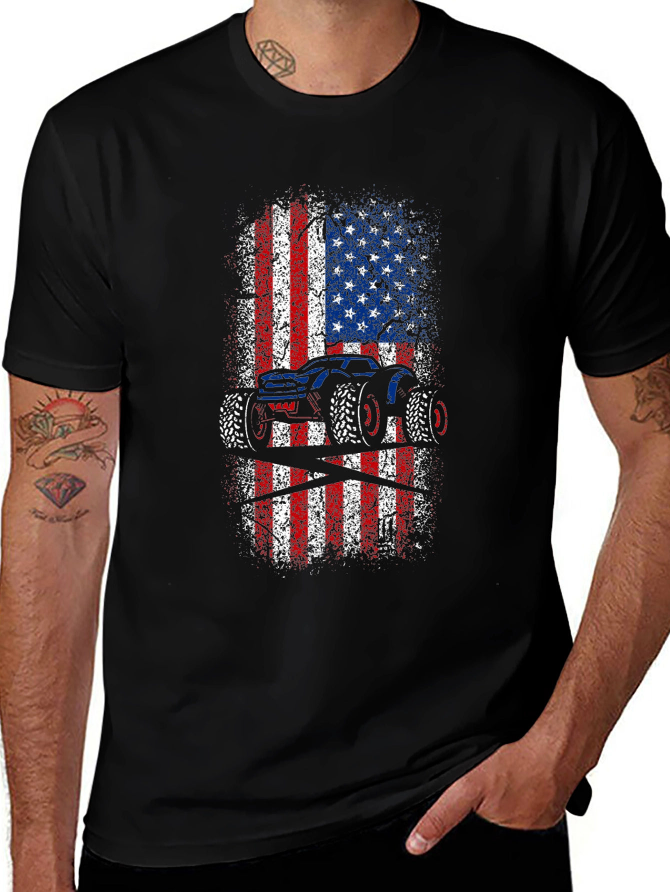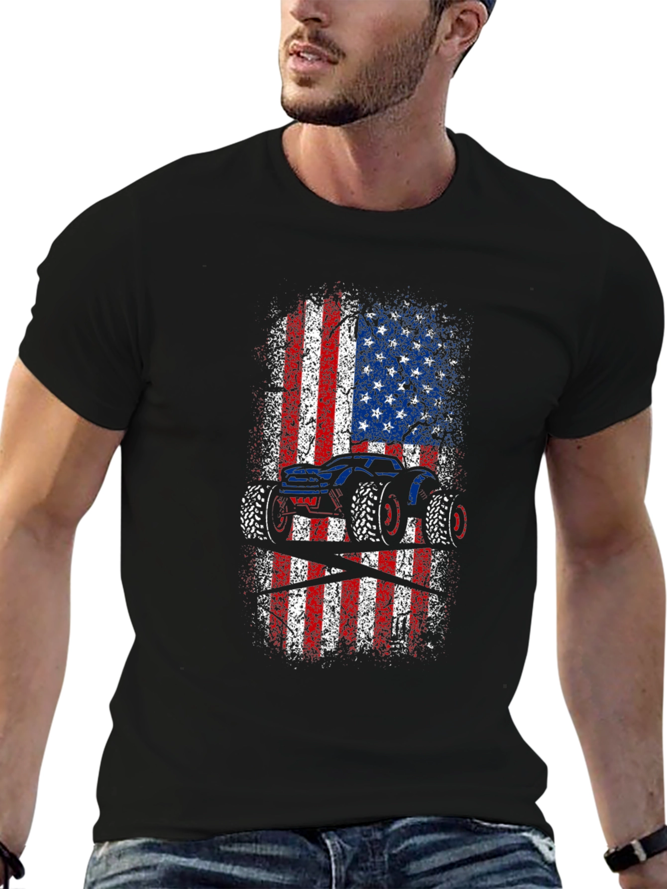 Show off your love for monster trucks and American pride with this unique graphic tee! This black t-shirt features a bold, distressed American flag design with a striking monster truck silhouette overlaid. The red, white, and blue colors pop against the dark background, creating a visually appealing and patriotic statement. Made from comfortable, breathable fabric, this tee is perfect for everyday wear, casual outings, or showing your support at monster truck events. A must-have for any truck enthusiast or proud American!