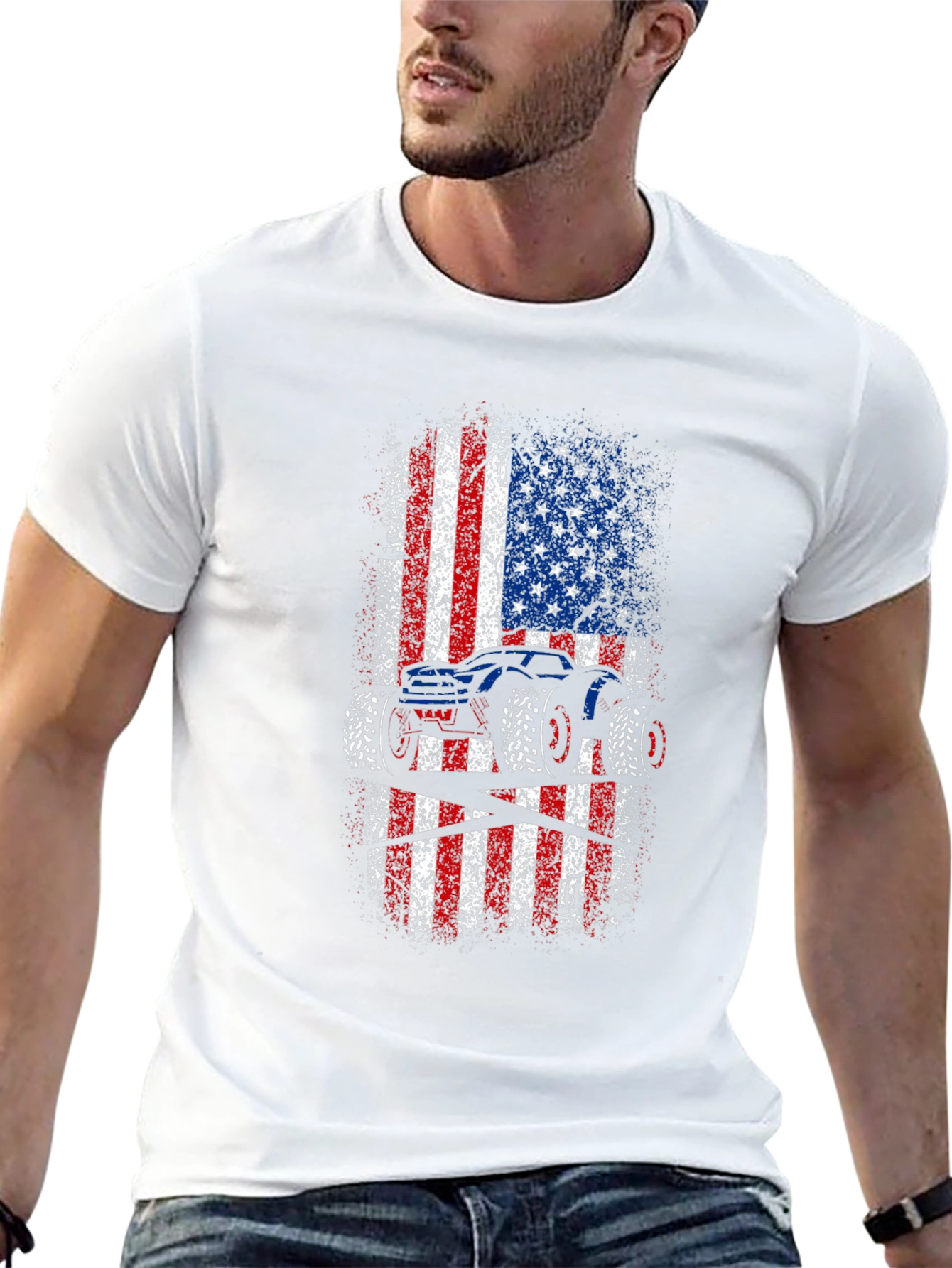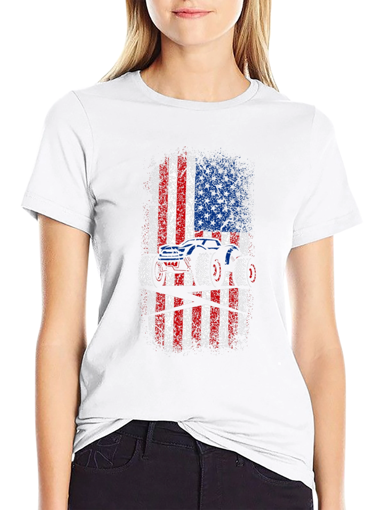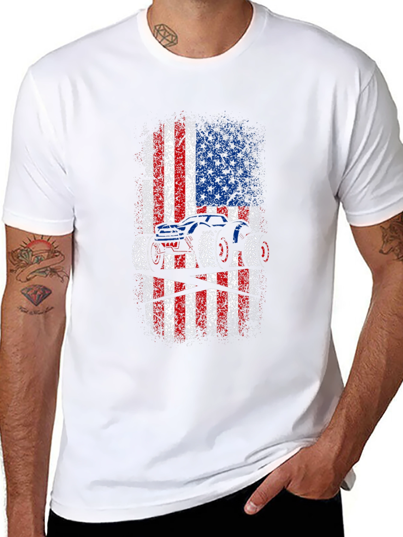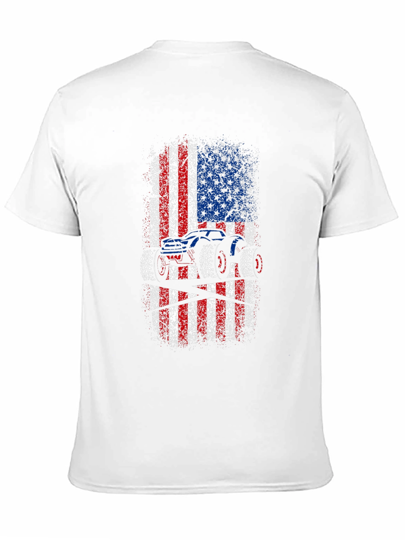 Show off your love for monster trucks and American pride with this unique graphic tee! This black t-shirt features a bold, distressed American flag design with a striking monster truck silhouette overlaid. The red, white, and blue colors pop against the dark background, creating a visually appealing and patriotic statement. Made from comfortable, breathable fabric, this tee is perfect for everyday wear, casual outings, or showing your support at monster truck events. A must-have for any truck enthusiast or proud American!