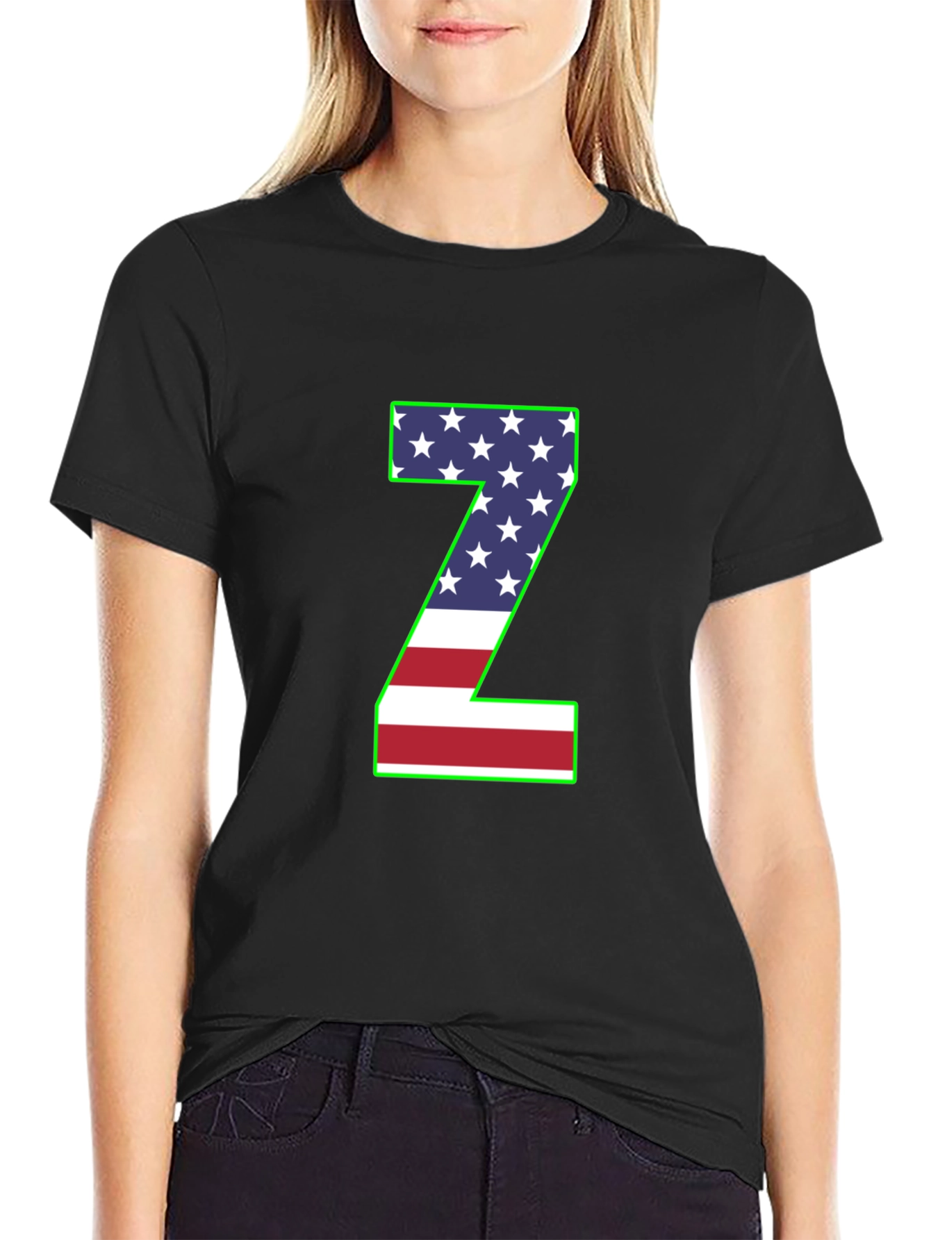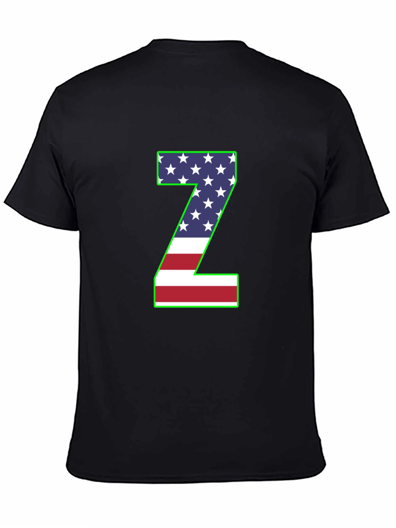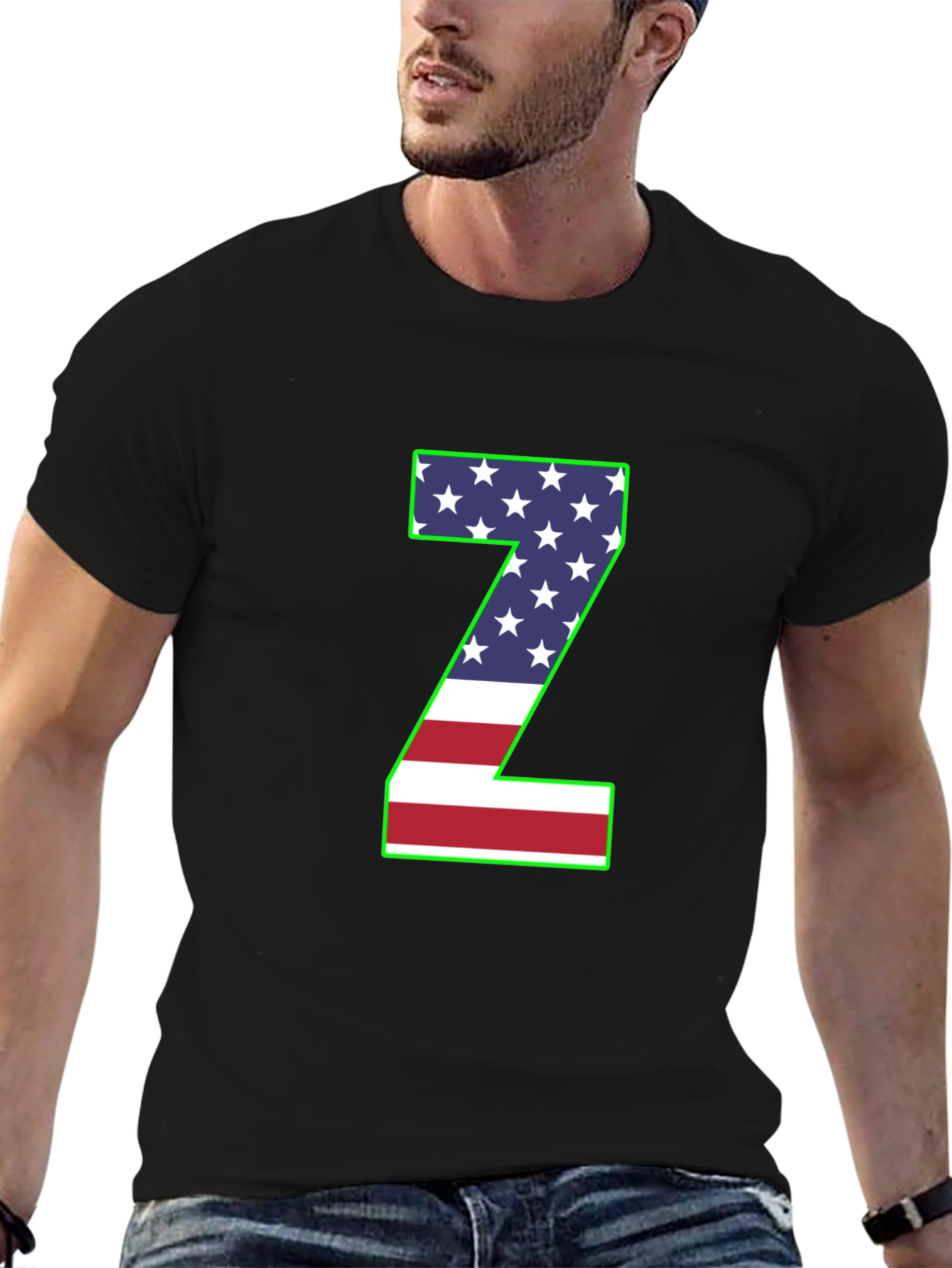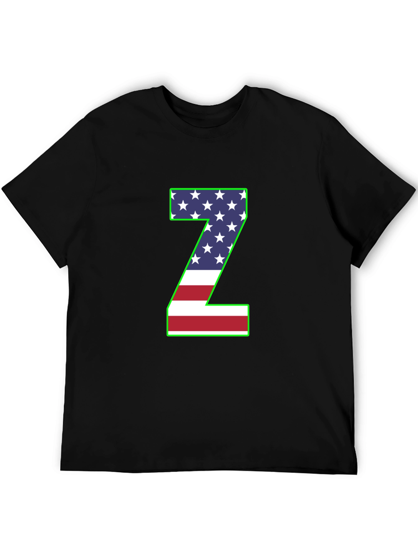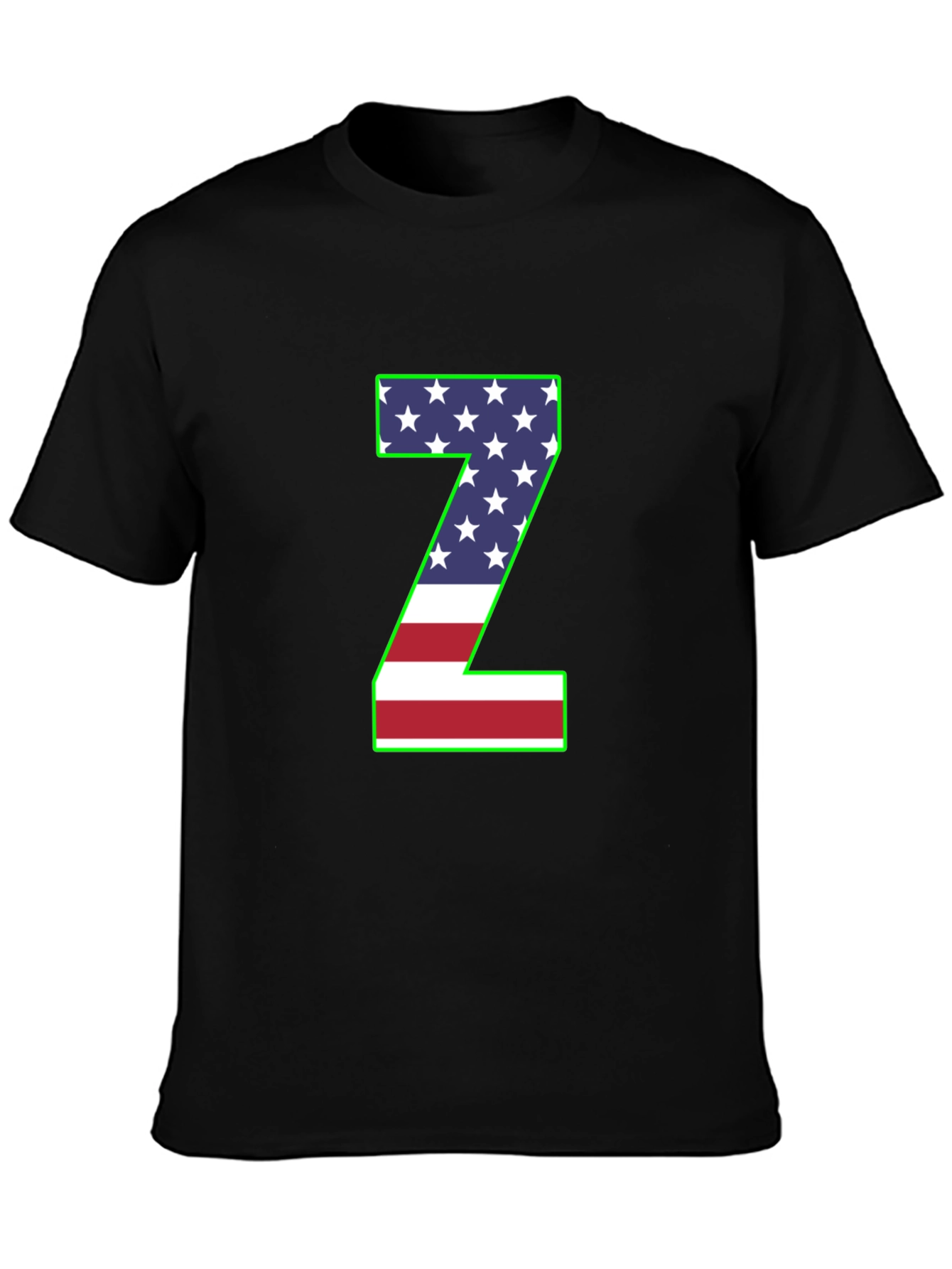 Show your patriotic spirit with this unique black t-shirt featuring a bold letter 'Z' design filled with the iconic American flag pattern. The letter is outlined with green. Made from a soft and comfortable fabric, this shirt is perfect for casual wear, summer outings, or celebrating national holidays. The striking 'Z' graphic adds a touch of individuality while still expressing love for the USA. Pair it with jeans or shorts for a relaxed yet stylish look. A must-have for anyone who wants to display their patriotism in a fun and fashionable way.