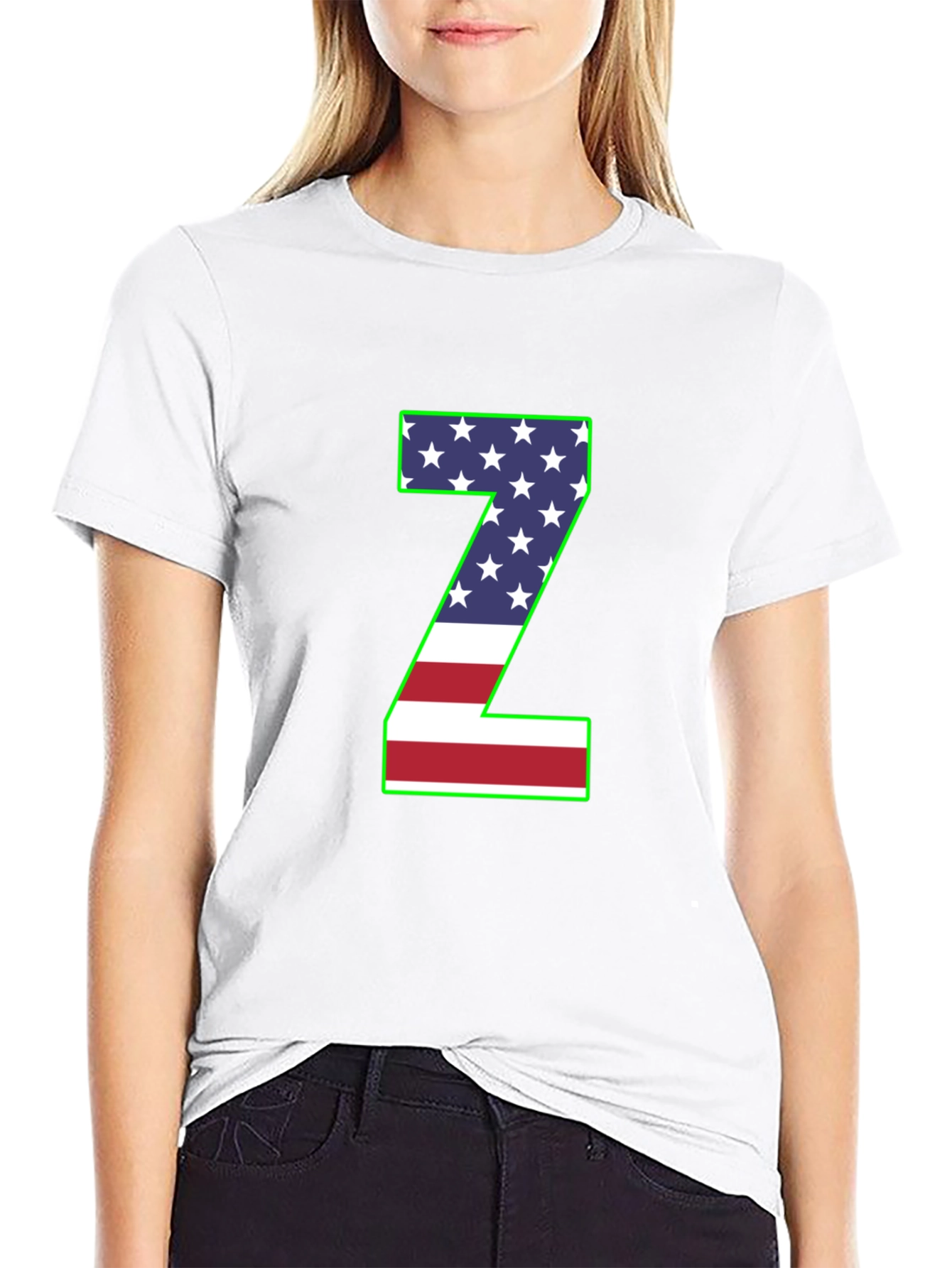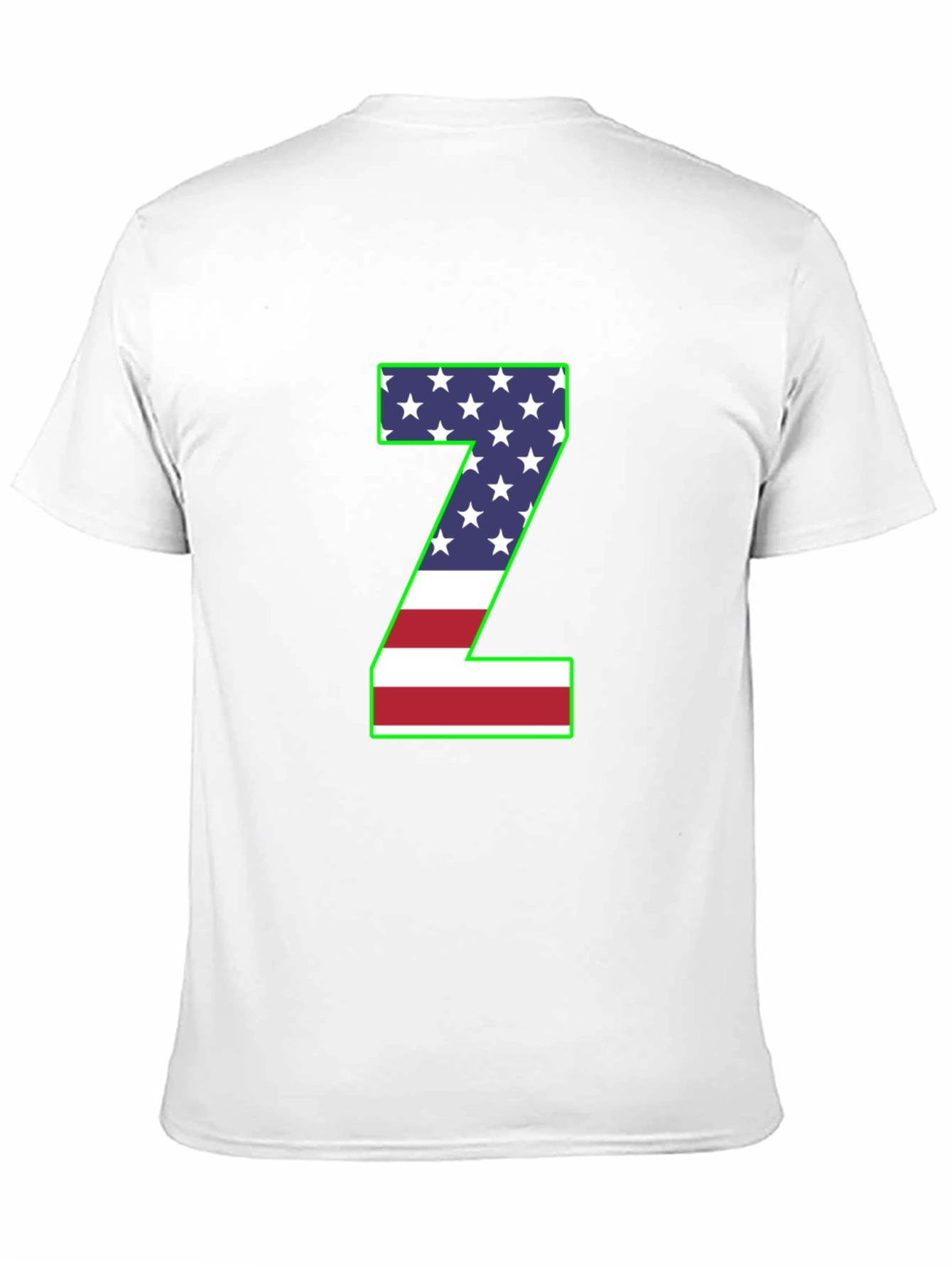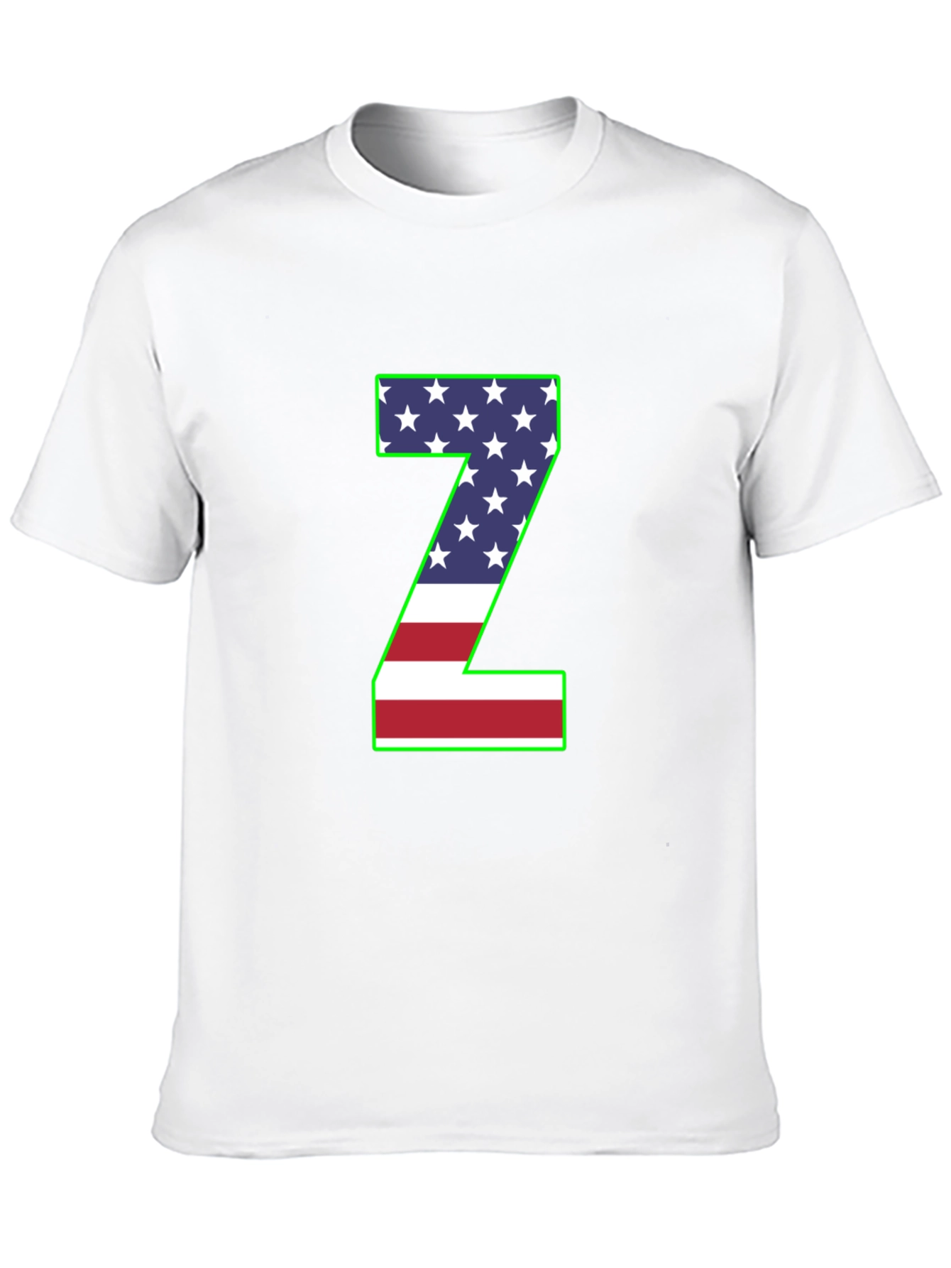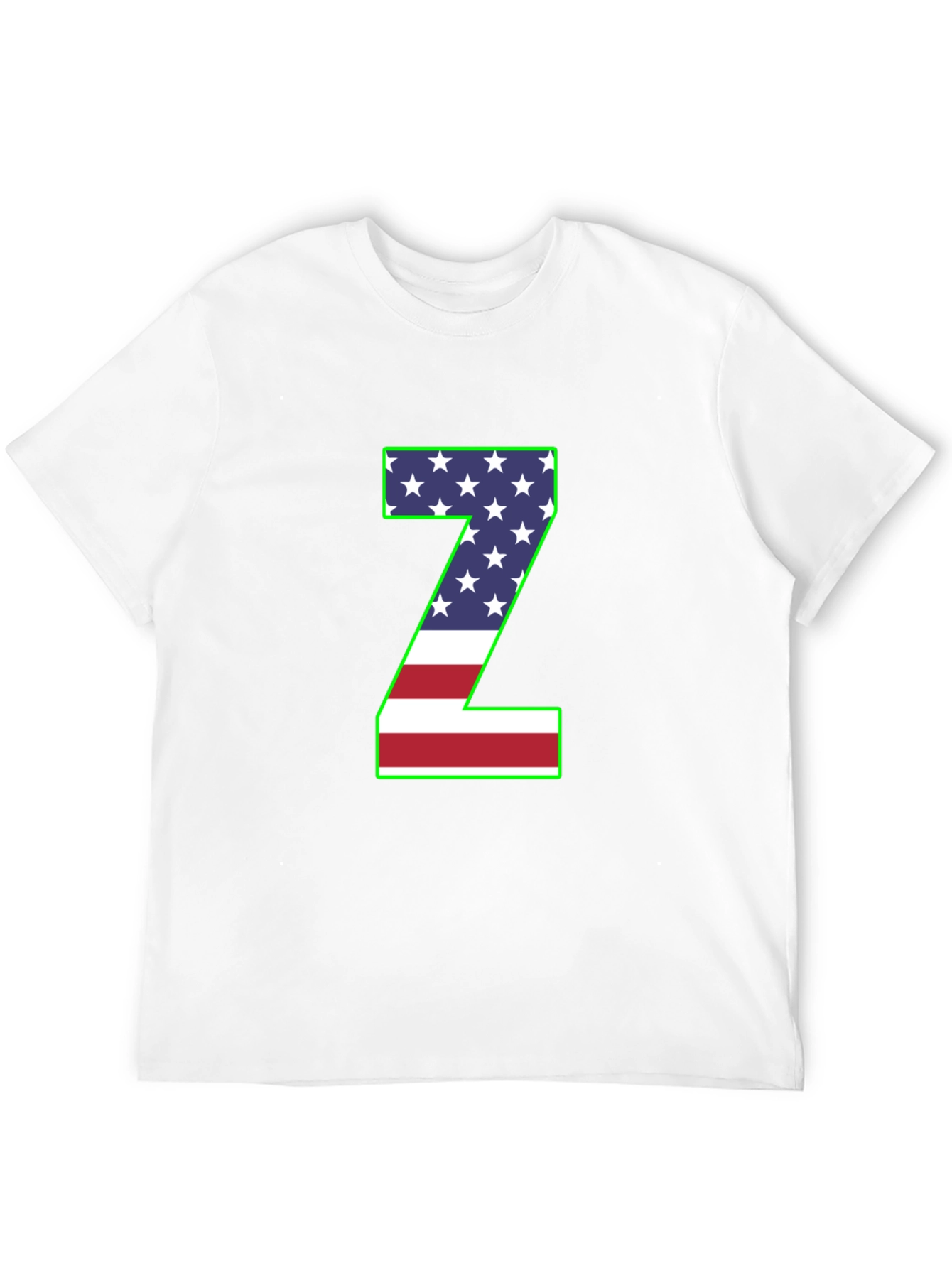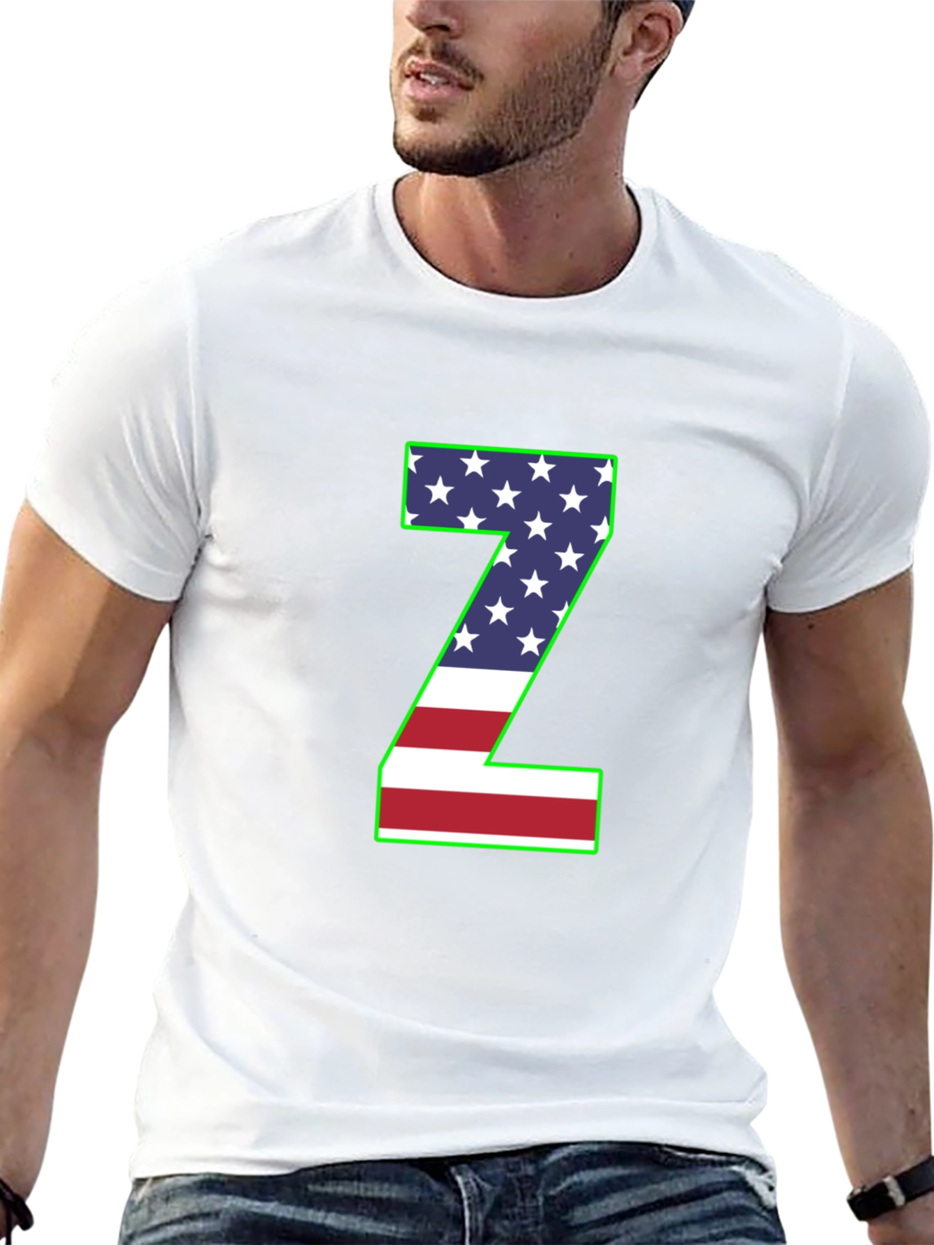 Show your patriotic spirit with this unique black t-shirt featuring a bold letter 'Z' design filled with the iconic American flag pattern. The letter is outlined with green. Made from a soft and comfortable fabric, this shirt is perfect for casual wear, summer outings, or celebrating national holidays. The striking 'Z' graphic adds a touch of individuality while still expressing love for the USA. Pair it with jeans or shorts for a relaxed yet stylish look. A must-have for anyone who wants to display their patriotism in a fun and fashionable way.
