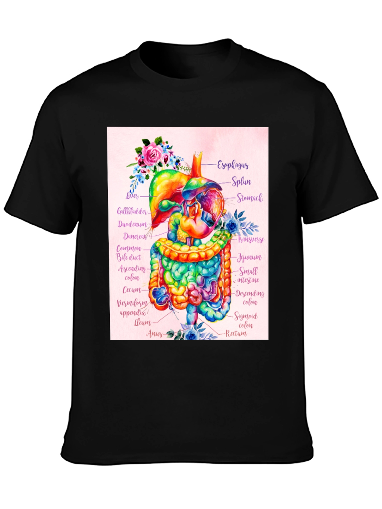 This eye-catching t-shirt features a detailed, colorful illustration of the human digestive system adorned with delicate floral accents. The anatomical design showcases organs such as the esophagus, stomach, intestines, liver, and more, labeled for educational appeal. Made from a comfortable, soft fabric, this tee combines scientific artistry with everyday wearability. The vivid colors and intricate details make it a unique statement piece, perfect for science enthusiasts, medical professionals, or anyone with an appreciation for anatomical art. Wear it to classes, conventions, or casual outings to spark conversations and showcase your interests.