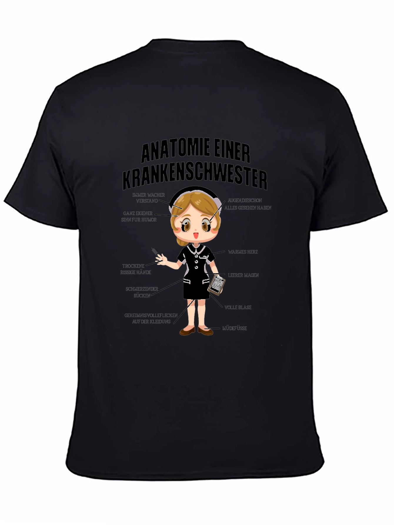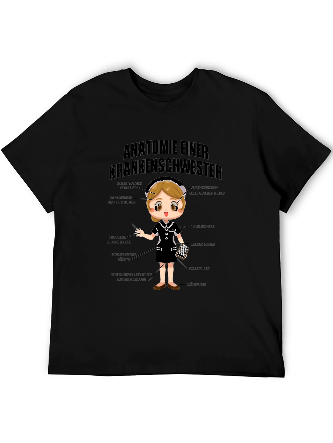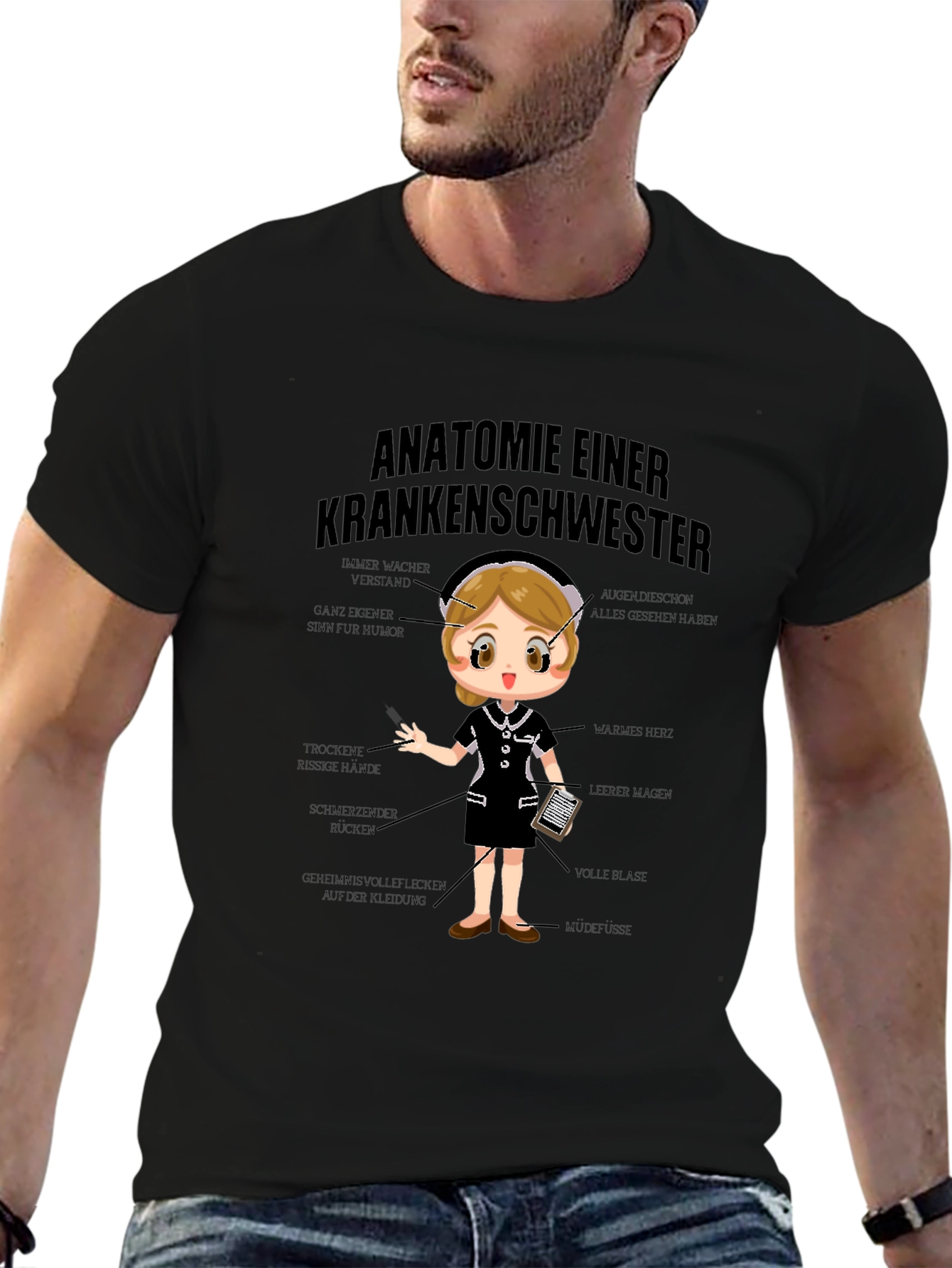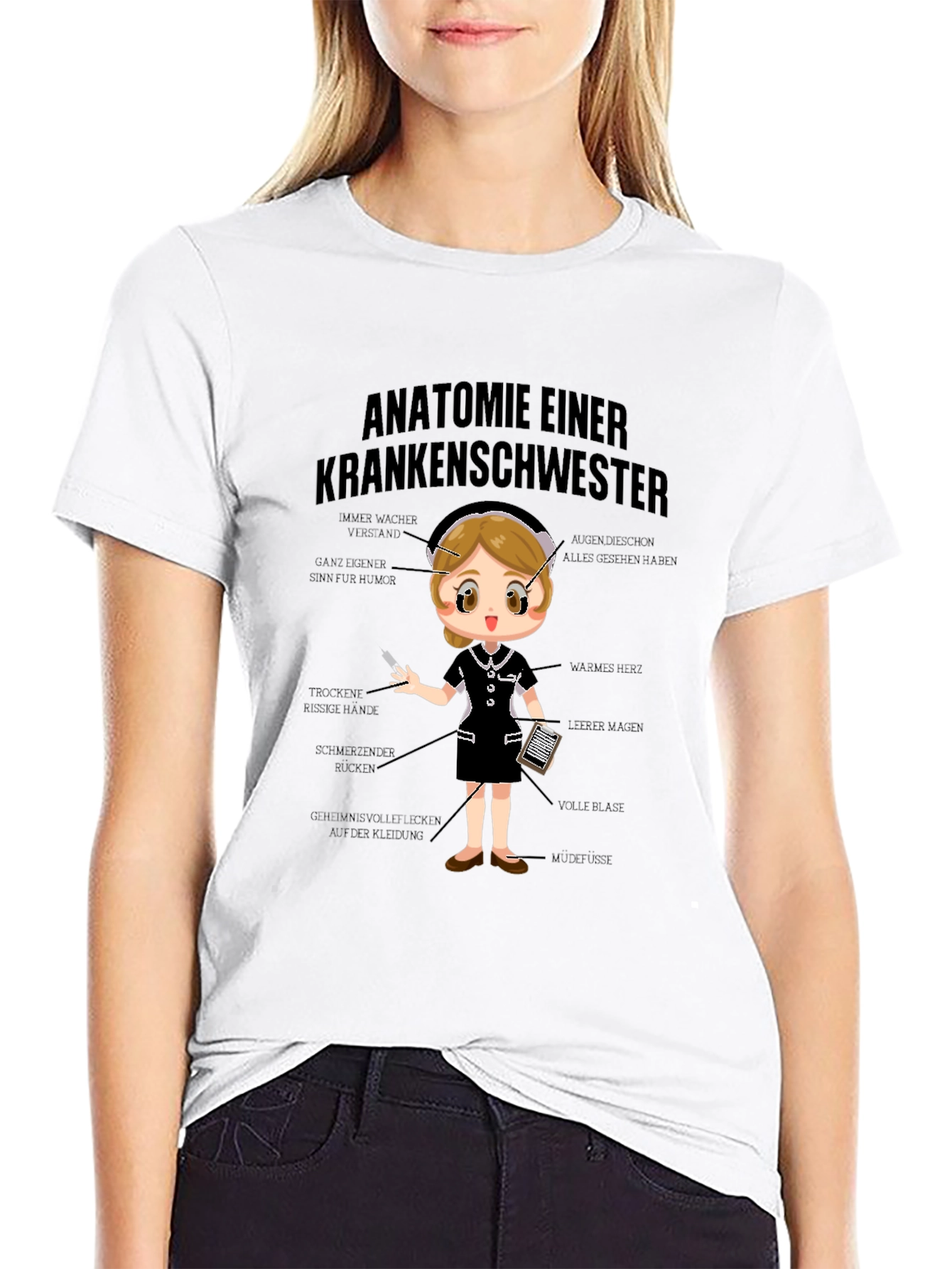 This black t-shirt features a humorous and informative graphic. The design shows a cartoon nurse with labels pointing to different parts of her body. The t-shirt graphic is both playful and engaging, offering a unique twist on nursing apparel. Made from a soft, comfortable fabric, this tee is perfect for everyday wear. The t-shirt's bold graphic is sure to spark conversation and showcase your appreciation for nurses. A great gift for nurses or nursing students!