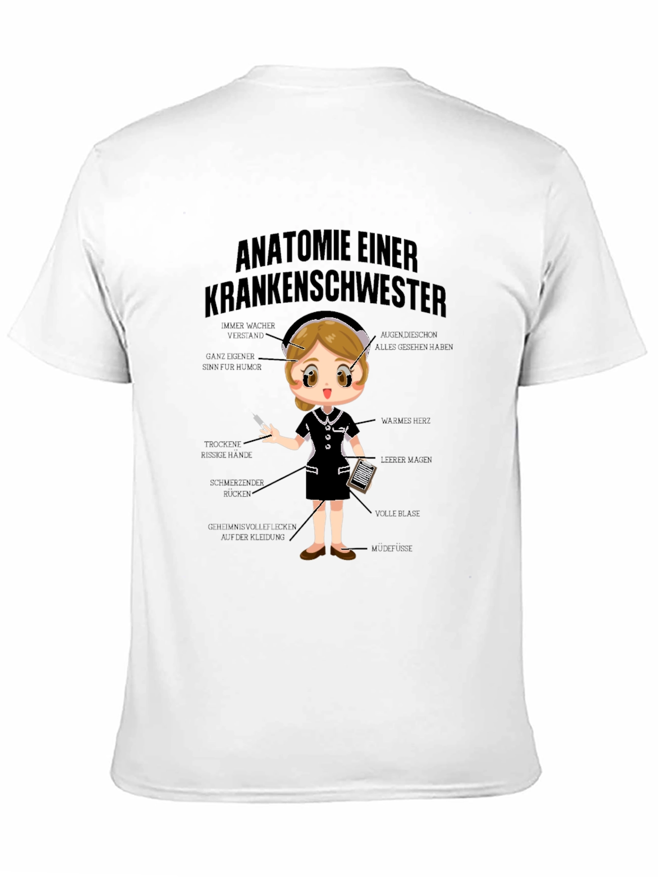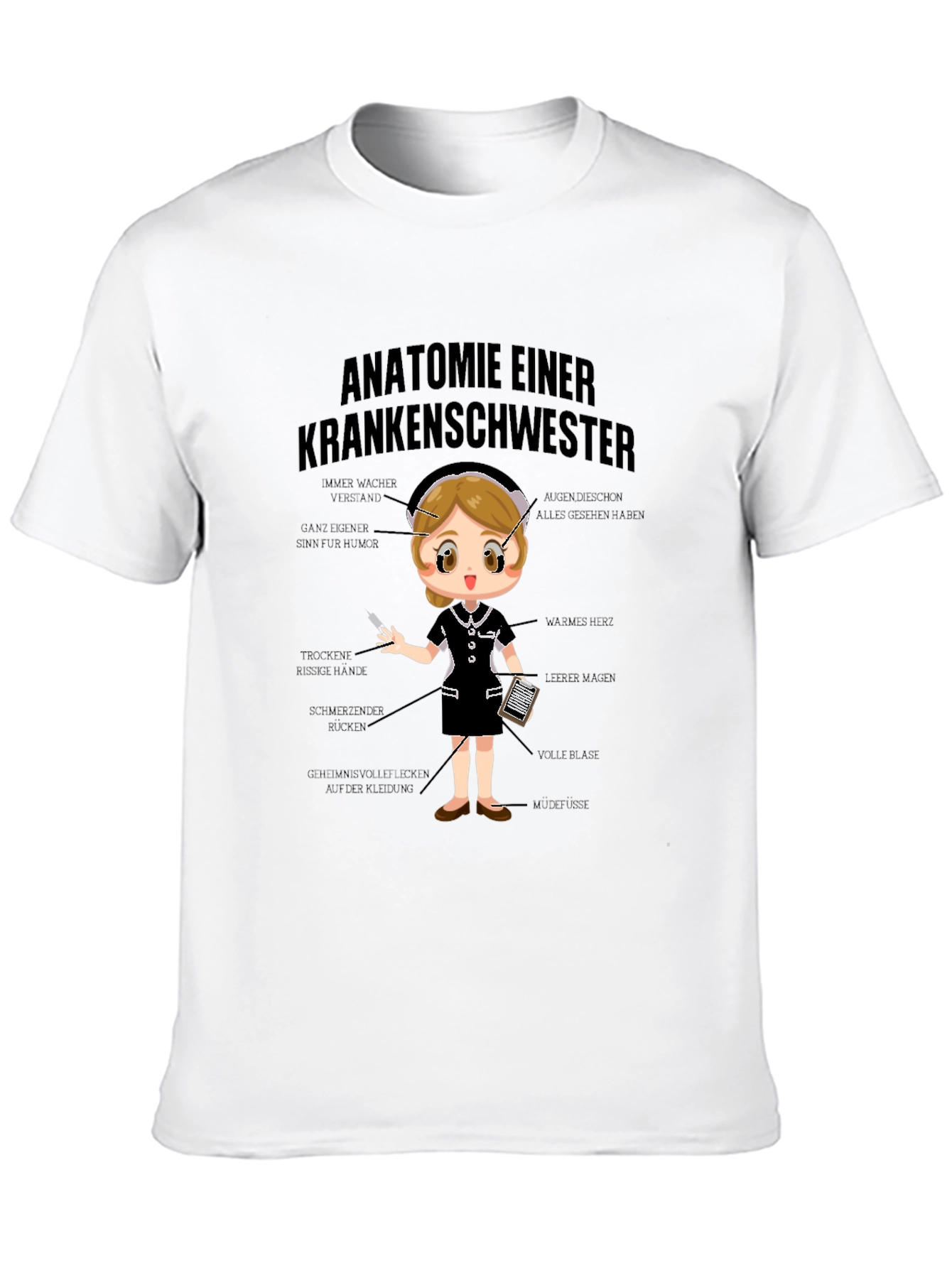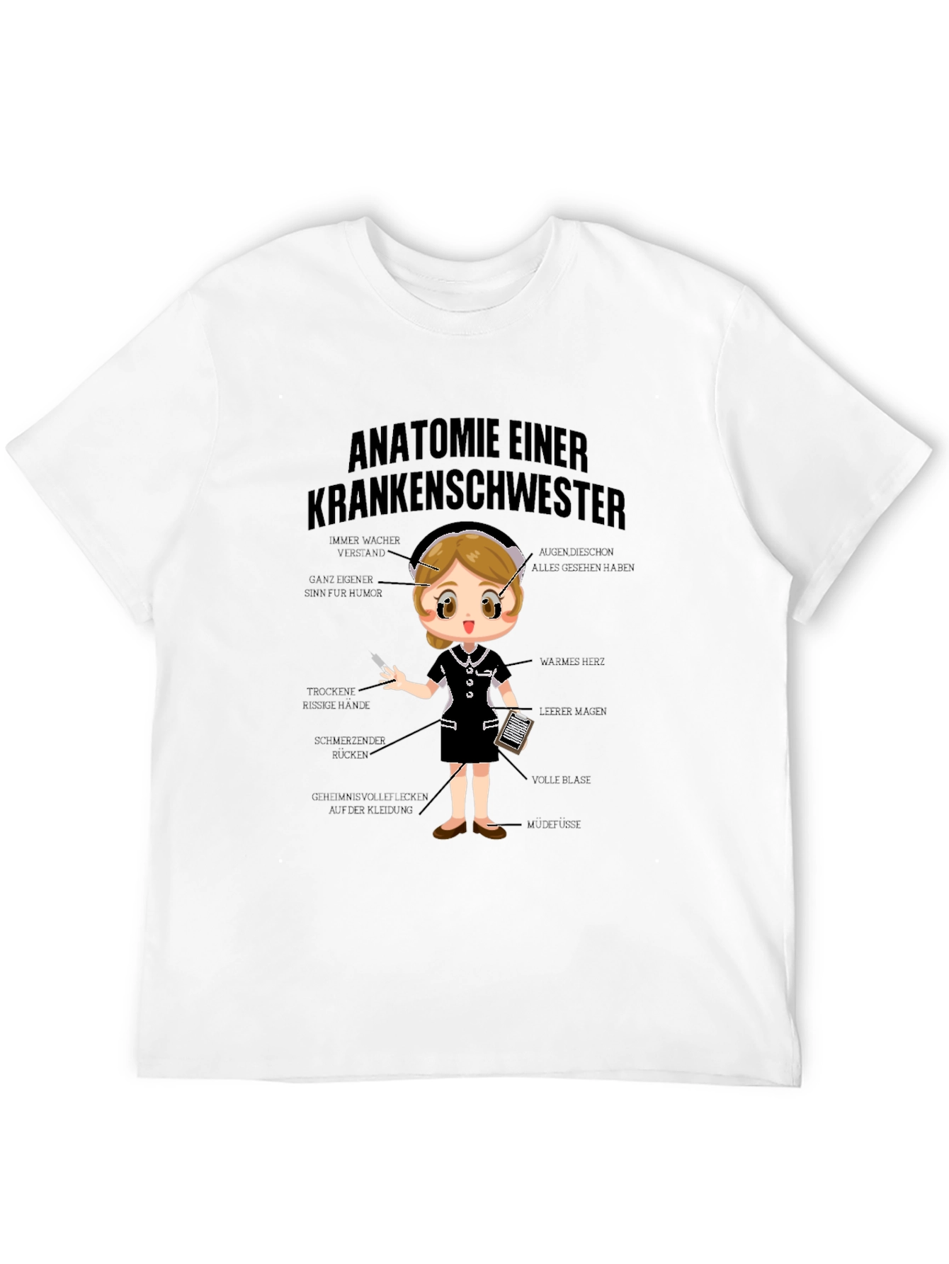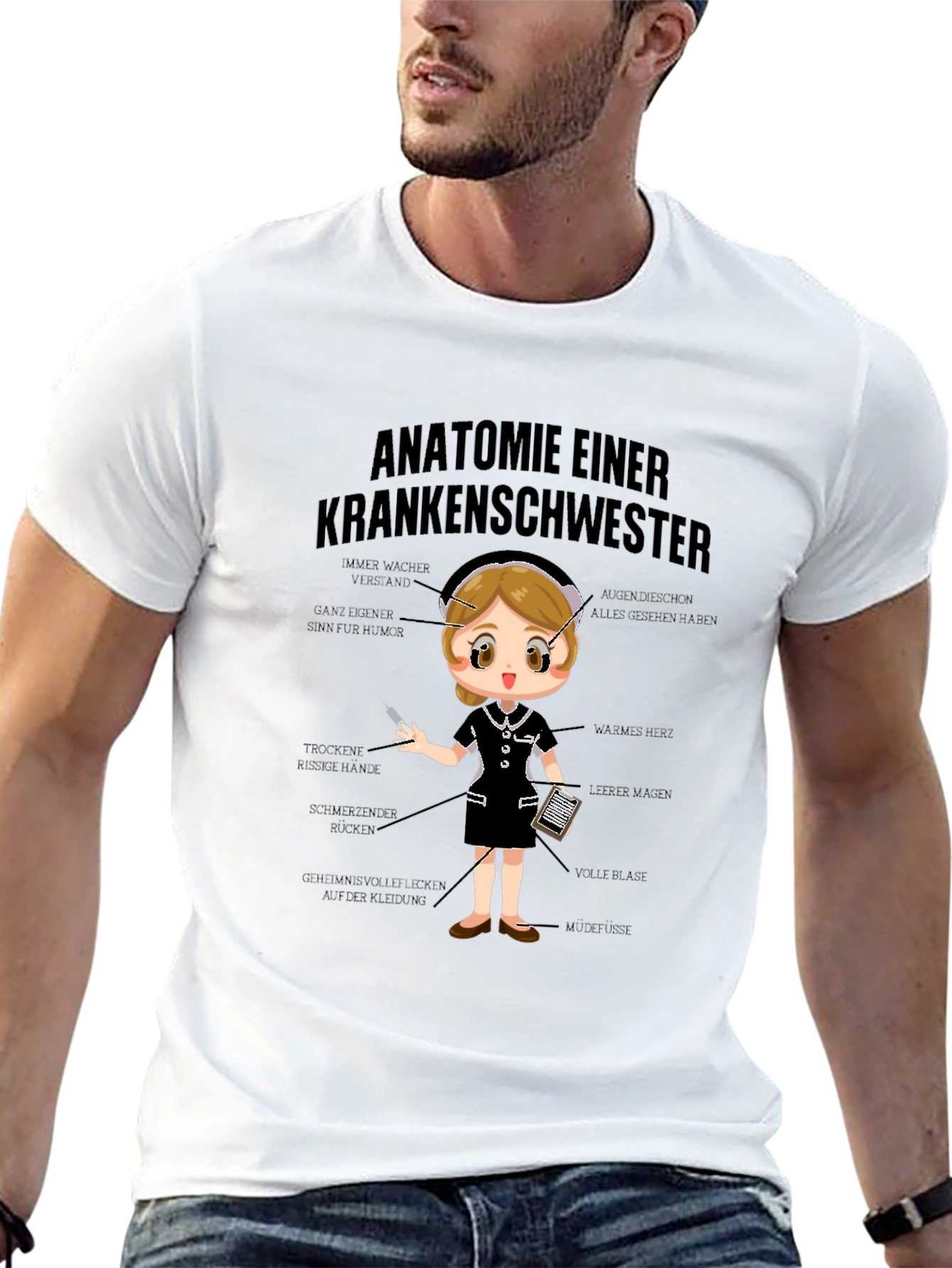 This black t-shirt features a humorous and informative graphic. The design shows a cartoon nurse with labels pointing to different parts of her body. The t-shirt graphic is both playful and engaging, offering a unique twist on nursing apparel. Made from a soft, comfortable fabric, this tee is perfect for everyday wear. The t-shirt's bold graphic is sure to spark conversation and showcase your appreciation for nurses. A great gift for nurses or nursing students!