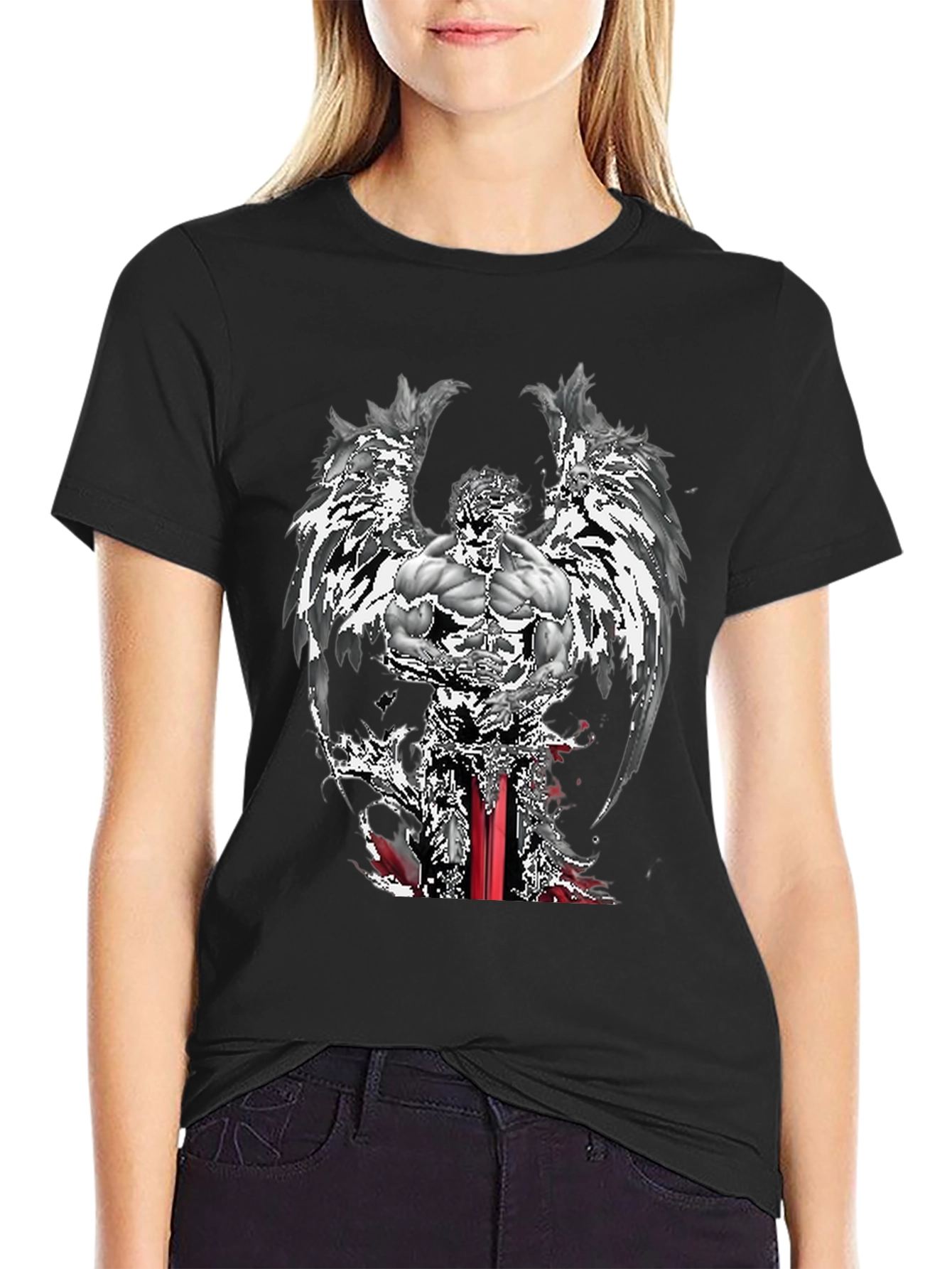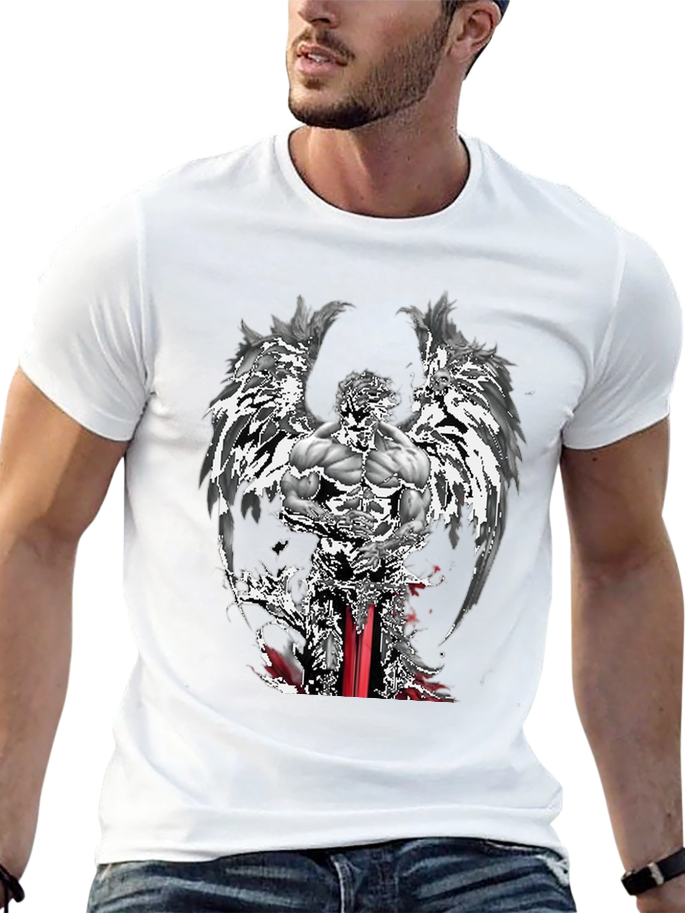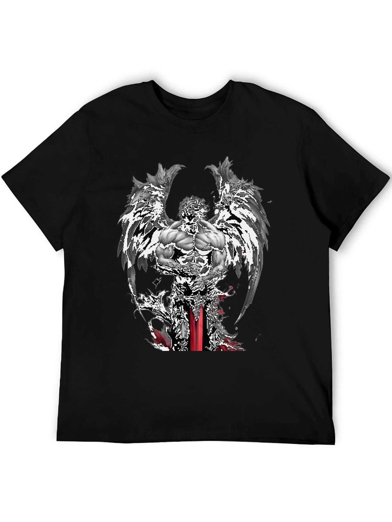Unleash your inner warrior with this striking men's black t-shirt. The bold graphic features a powerful angel warrior with intricate wings and a dominating presence. The design includes shades of white and grey with subtle red highlights, creating a dynamic visual impact. Made from a comfortable, breathable fabric, this tee is perfect for everyday wear. Showcase your unique style and make a statement wherever you go. Ideal for casual outings, concerts, or expressing your individuality, this tee combines comfort and eye-catching design.