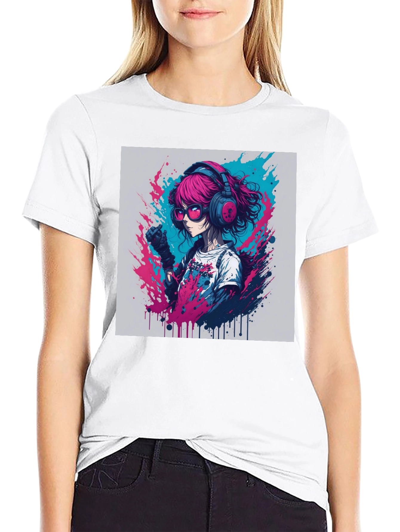 Make a bold statement with this striking graphic tee. The design features an anime-style girl with vibrant pink hair, rocking a pair of headphones and cool sunglasses. The eye-catching art is rendered in a dynamic splash effect of blues and pinks, creating a visually engaging look. Made from a comfortable, breathable fabric, this t-shirt is perfect for everyday wear, casual outings, or showcasing your unique style. Pair it with jeans or shorts for an effortlessly cool ensemble. Perfect for anime lovers and anyone who wants to showcase a vibrant, creative style.