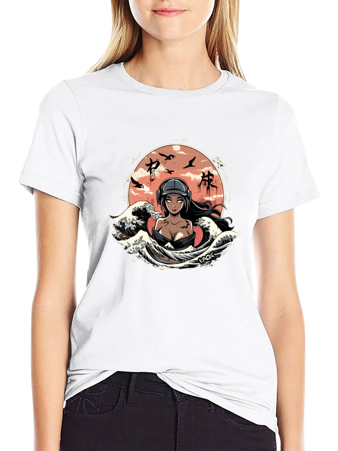 This stylish black t-shirt features a captivating anime-inspired design. A woman wearing a hat and headphones is surrounded by swirling ocean waves against a warm sunset backdrop. The unique graphic blends elements of Japanese art with modern anime aesthetics. Made from comfortable cotton fabric, this tee is perfect for casual wear, anime conventions, or expressing your unique style. Stand out from the crowd with this eye-catching and artistic t-shirt.