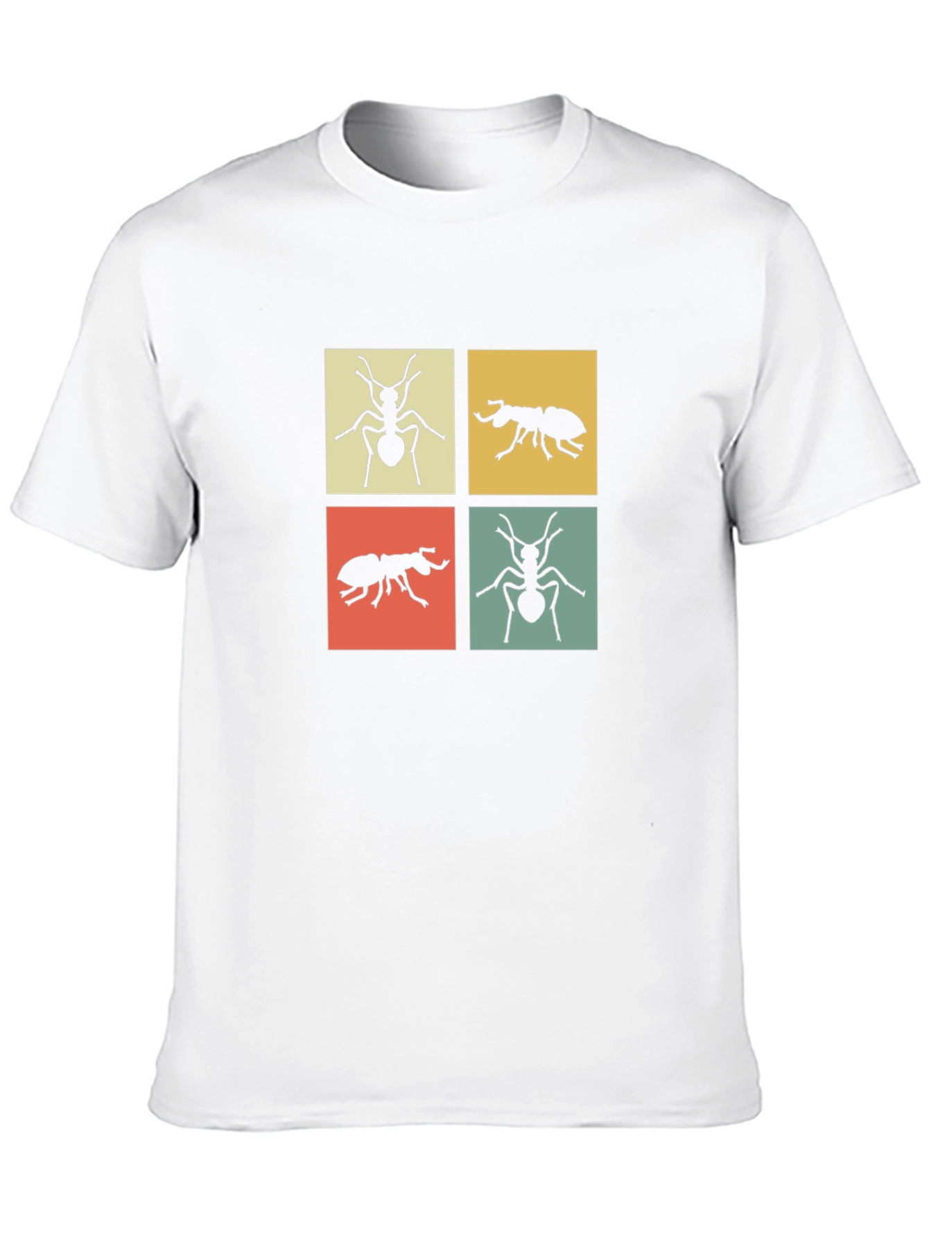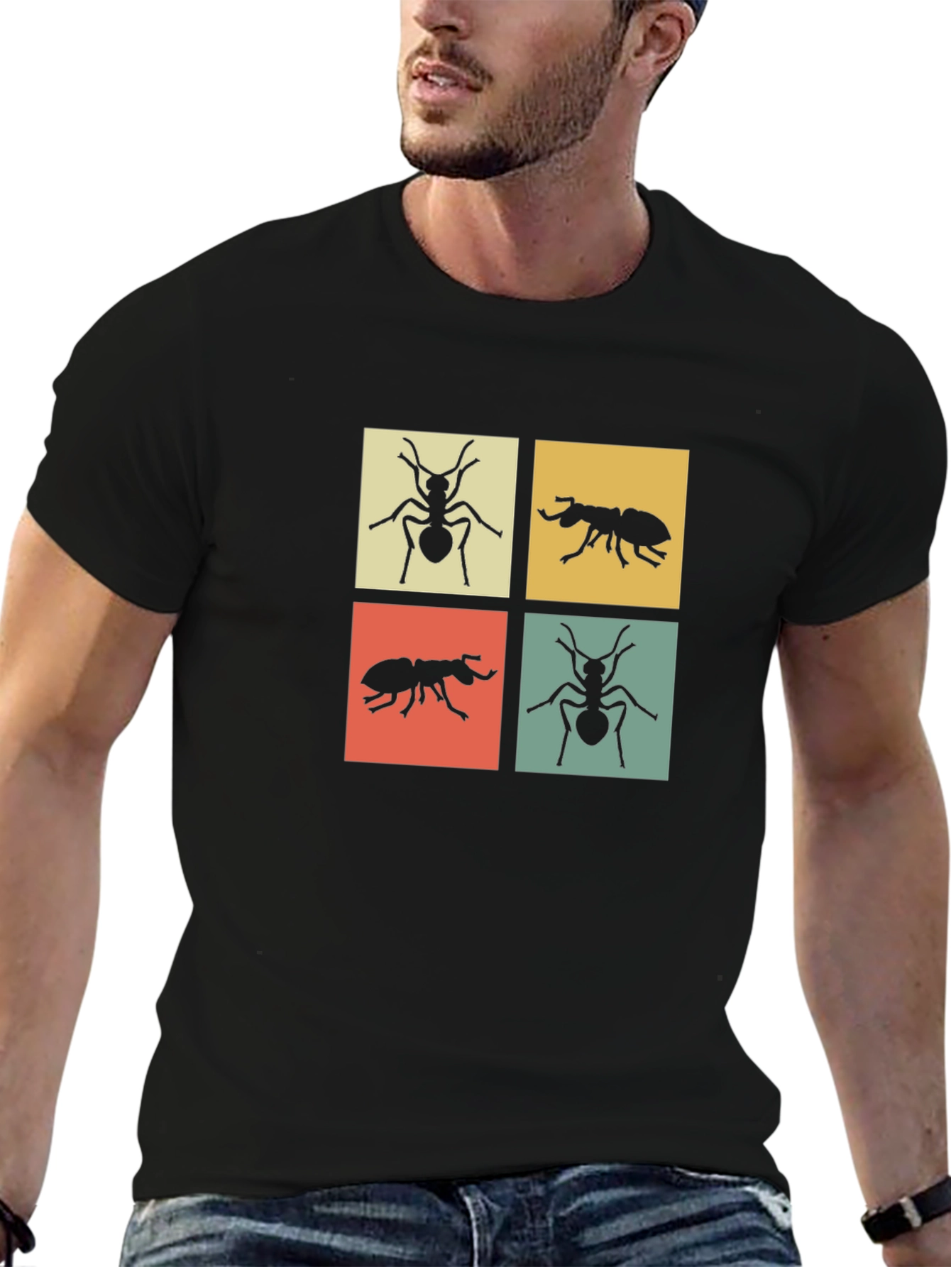 Showcase your unique style with this eye-catching graphic tee. The shirt features a striking four-panel design with bold black ant silhouettes against muted vintage backgrounds. This design offers a modern twist on a classic arthropod theme. Made from a soft, comfortable fabric (appearing to be cotton or a cotton blend), this tee is perfect for everyday wear. Its breathable material makes it ideal for casual outings, lounging, or as a conversation starter at social gatherings. Elevate your wardrobe with this versatile and stylish statement piece. This striking T-shirt brings nature-inspired art to your everyday style!