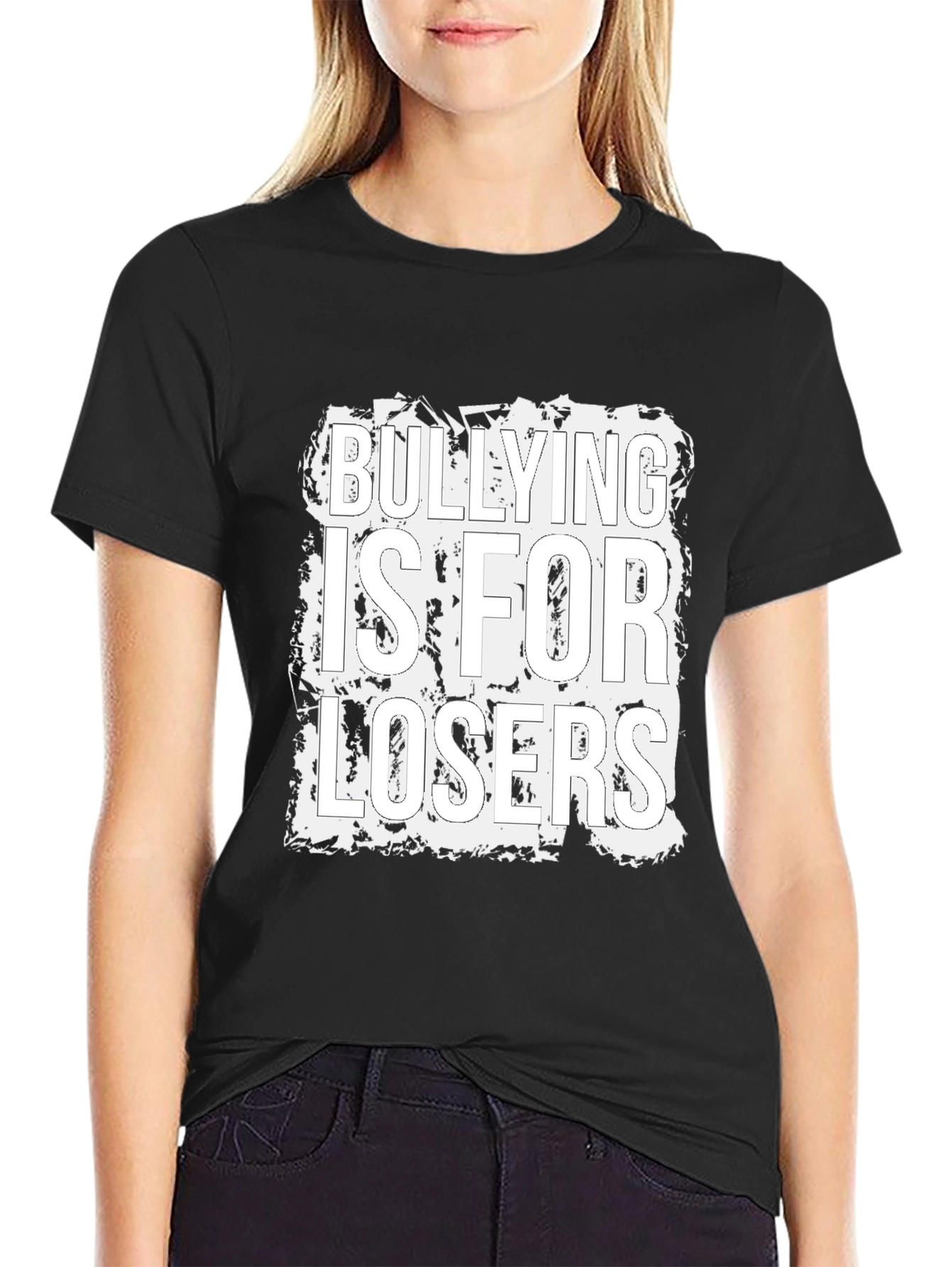 Make a statement with this bold, black graphic tee! The shirt features the powerful message "Bullying is for Losers" in a stylized white font with a distressed edge design. Constructed from what appears to be a comfortable cotton blend, this tee offers both style and comfort. Ideal for wearing to school, anti-bullying rallies, or casual outings, this t-shirt is a perfect way to show your support for a positive message. Stand up against bullying in style with this eye-catching and meaningful tee.