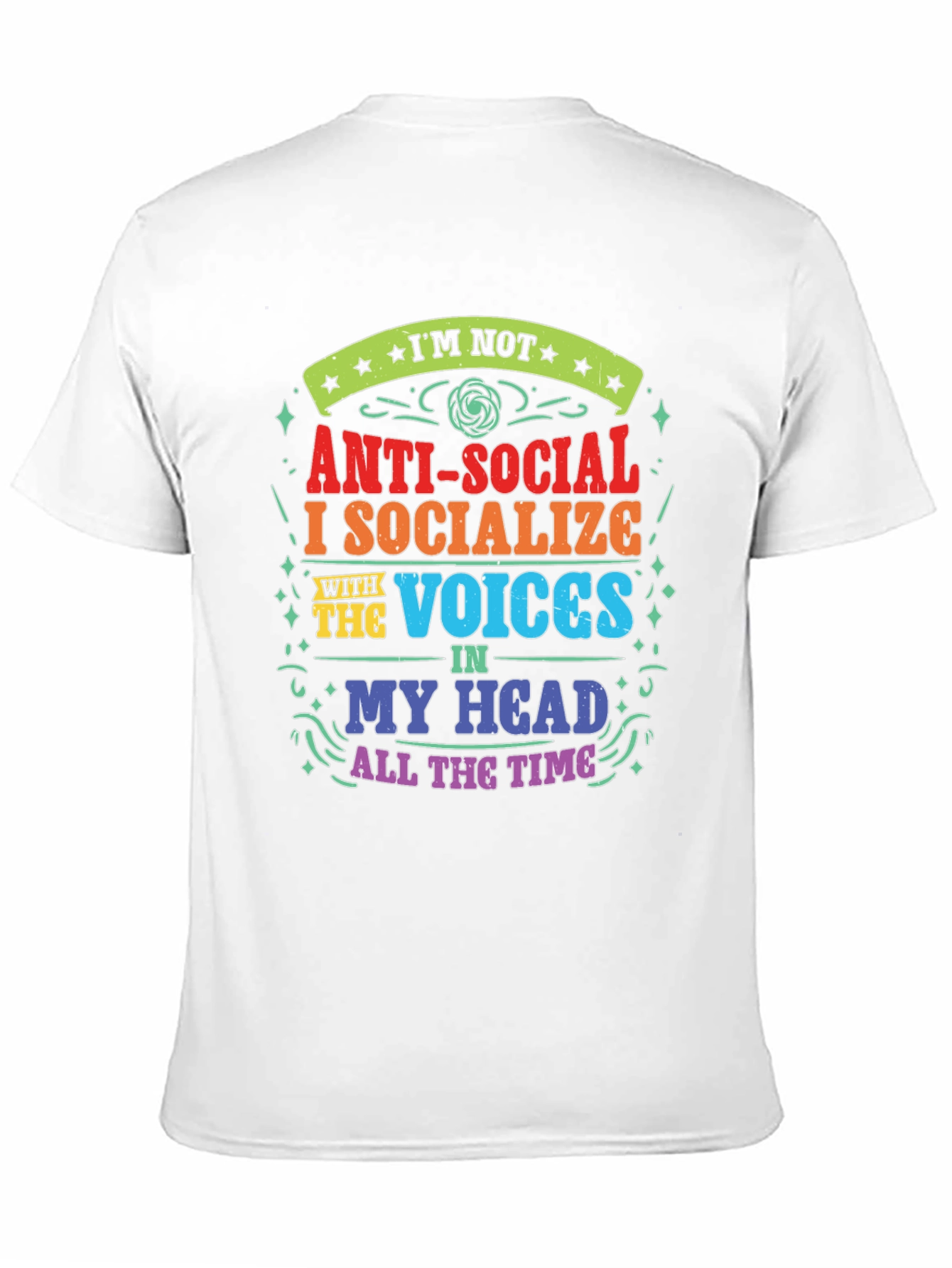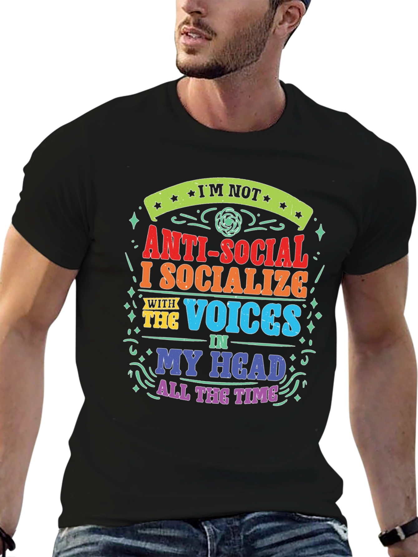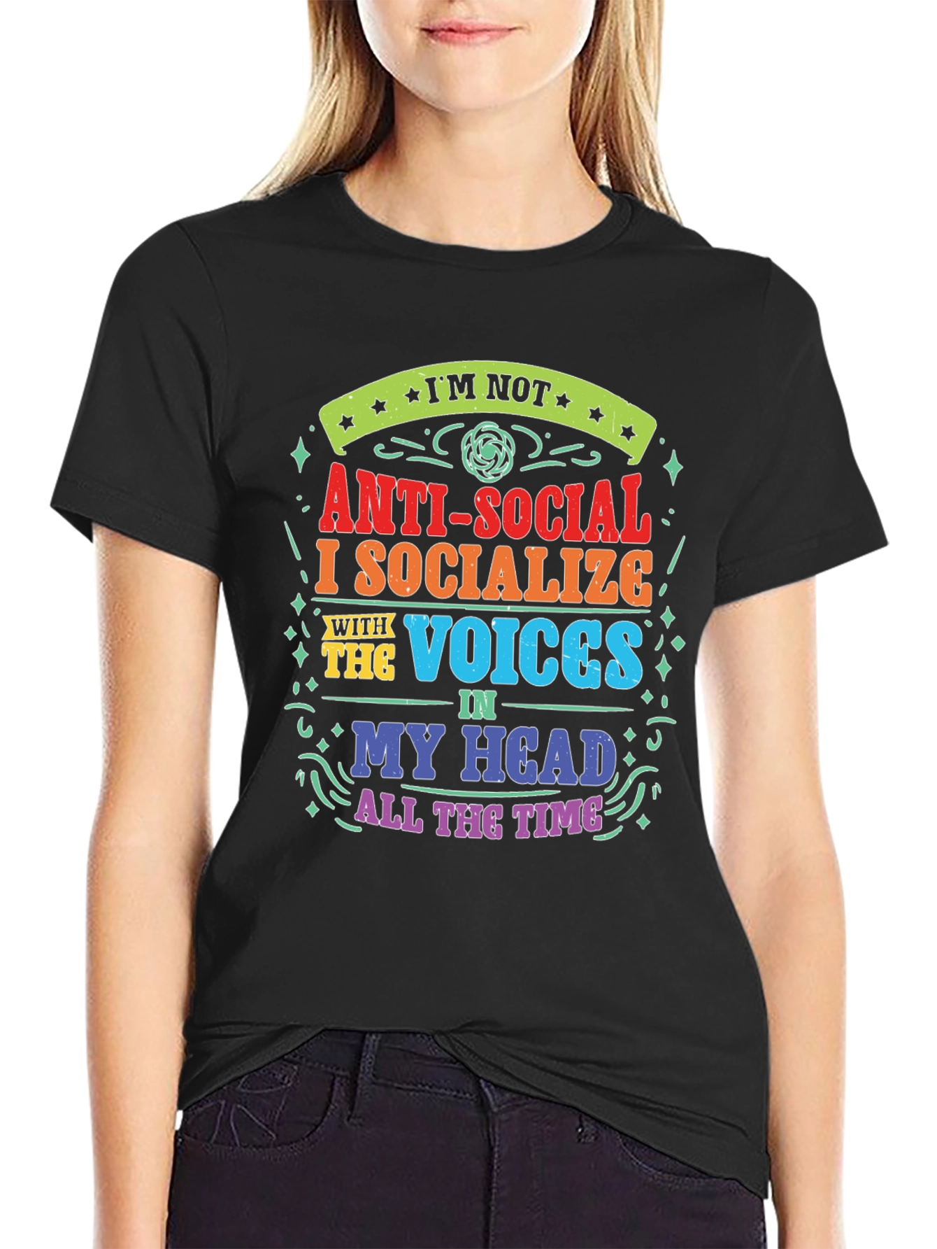 This black t-shirt features a vibrant and quirky design for those who march to the beat of their own drum. Boldly proclaiming "I'm Not Anti-Social, I Socialize With The Voices In My Head All The Time," the shirt uses a colorful, layered text design with stars and decorative flourishes. The casual fit and short sleeves make it ideal for everyday wear, while the humorous message adds a touch of personality. Perfect for casual outings, lounging at home, or making a statement. Show off your unique sense of humor with this eye-catching tee!