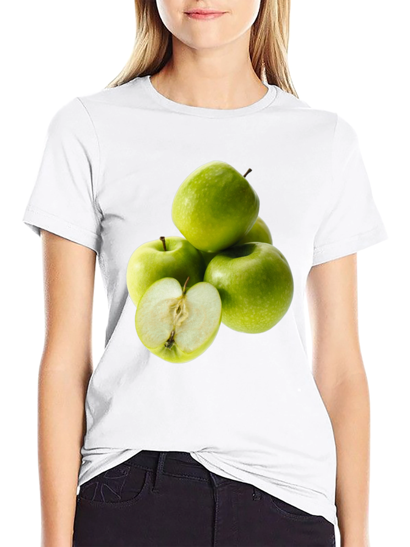 Showcase your love for healthy living with this eye-catching graphic tee. The shirt features a vibrant, realistic image of several green apples and one sliced in half, creating a visually appealing focal point. Made from what appears to be a soft and comfortable black material, this t-shirt offers a relaxed fit suitable for everyday wear. The classic crew neck design ensures versatility, making it easy to pair with jeans, shorts, or casual pants. Perfect for adding a touch of fun and freshness to your wardrobe, this apple graphic tee is sure to turn heads and spark conversations.