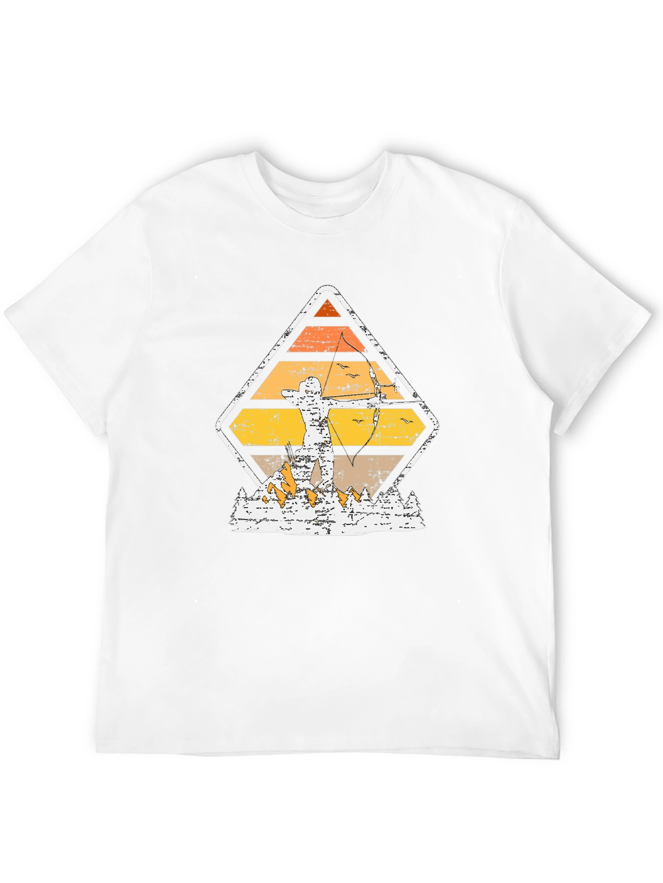 Show off your love for archery with this vintage-inspired graphic tee. The design features an archer silhouette against a retro sunset backdrop, encapsulated in a diamond shape with a distressed effect. Made from a comfortable, dark-colored fabric, this t-shirt offers a relaxed fit perfect for everyday wear. The unique graphic adds a touch of outdoorsy style to any outfit. Ideal for casual outings, archery practice, or as a gift for the archery enthusiast in your life. Pair it with jeans or shorts for a laid-back look that showcases your passion for the sport.