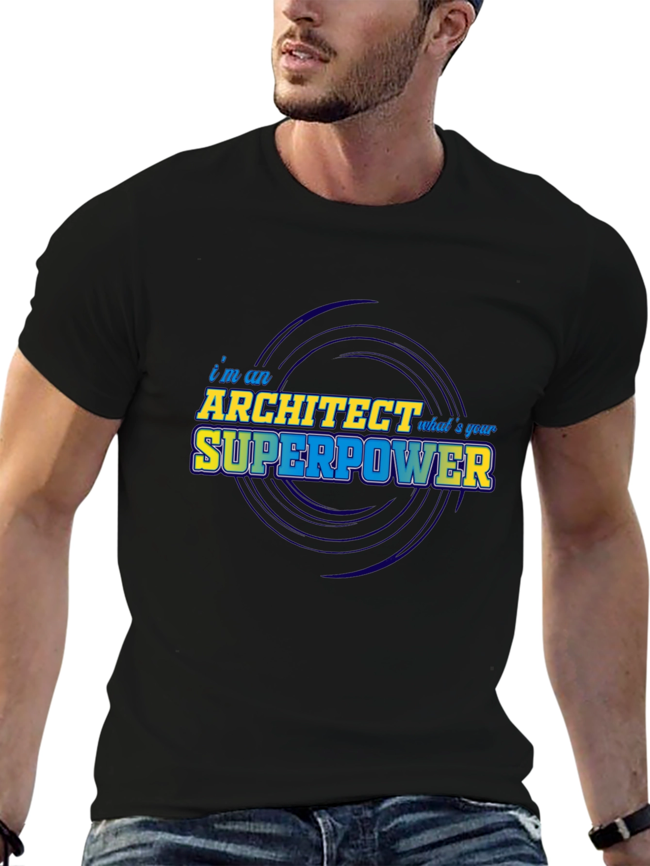 Show off your architect skills with this stylish black t-shirt. The graphic design features the phrase "I'm an ARCHITECT what's your SUPERPOWER", making it a fun and unique addition to your wardrobe. Made from a soft, comfortable fabric, this tee is perfect for everyday wear, whether you're at work, hanging out with friends, or just relaxing at home. The bold, eye-catching design will make you stand out from the crowd and spark conversations. Get yours today and let everyone know about your amazing architect superpowers!