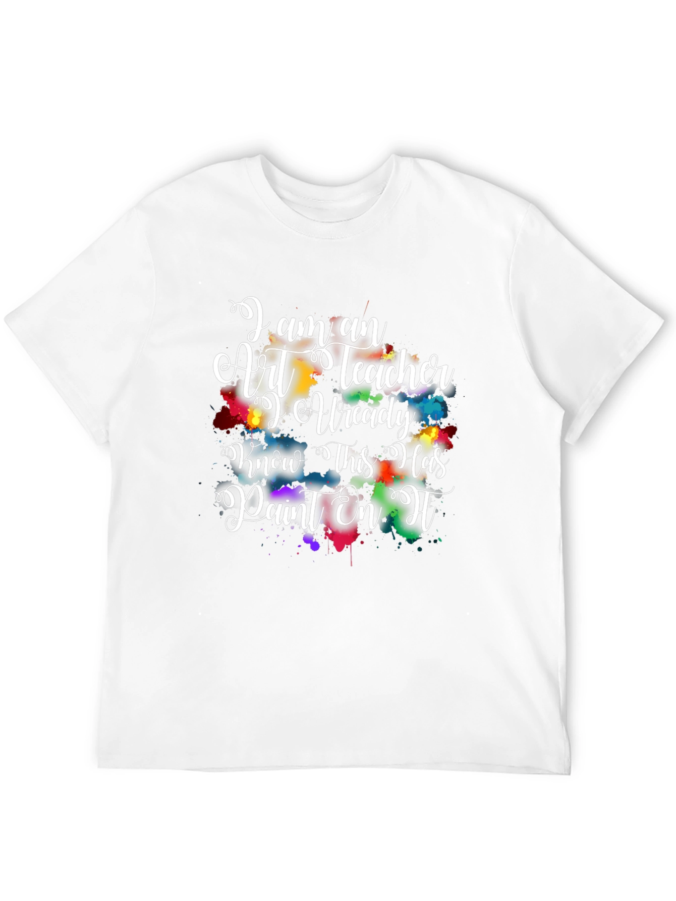 Showcase your artistic passion with this vibrant black T-shirt. Featuring a playful graphic print that reads 'I am an Art Teacher I Already Know This Has Paint On It,' the design is accentuated with a colorful splatter of paint effect. This short-sleeved tee offers a casual yet stylish look, perfect for expressing your creative side in and out of the classroom. Made from comfortable fabric, it's ideal for everyday wear, art classes, or casual outings. A must-have for art teachers who embrace the beauty of a little mess.