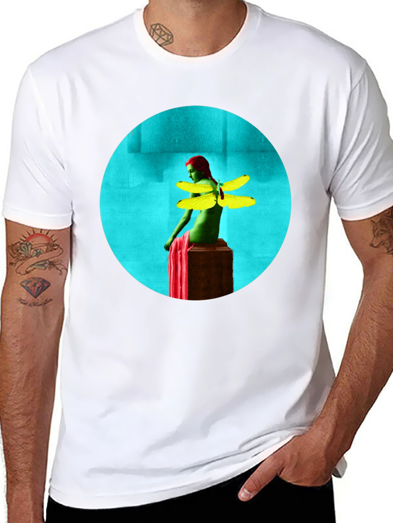 Make a statement with this eye-catching black tee featuring a unique graphic design. At the center, a vivid turquoise circle frames a captivating image of a woman with dragonfly wings. The artwork boasts vibrant colors, creating a striking contrast against the shirt's black backdrop. Crafted from a soft, comfortable material, this tee is ideal for everyday wear. Express your individuality and artistic flair with this stand-out piece. Pair it with your favorite jeans or shorts for a casual yet stylish look. Perfect for art lovers and anyone who wants to add a touch of creativity to their wardrobe.