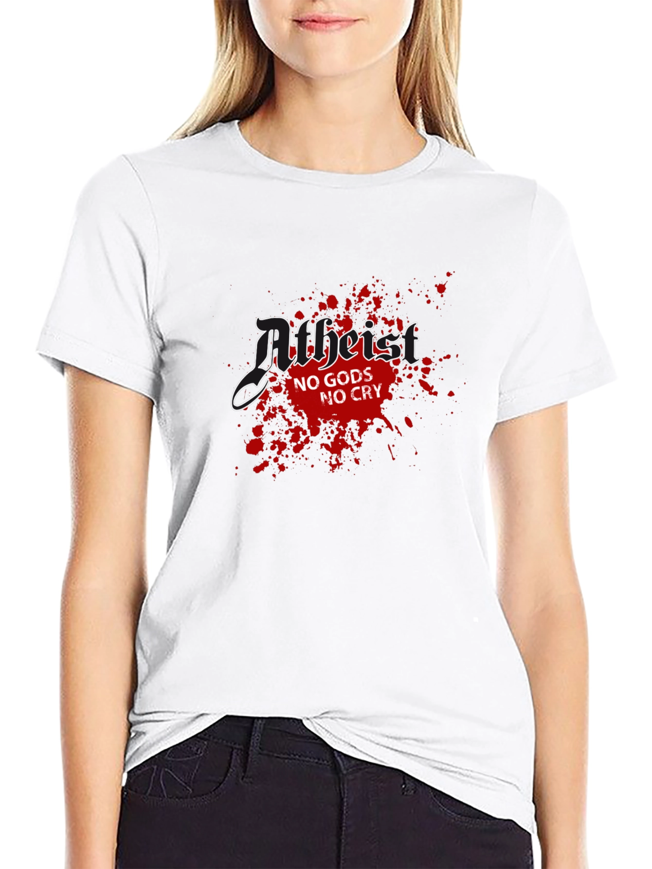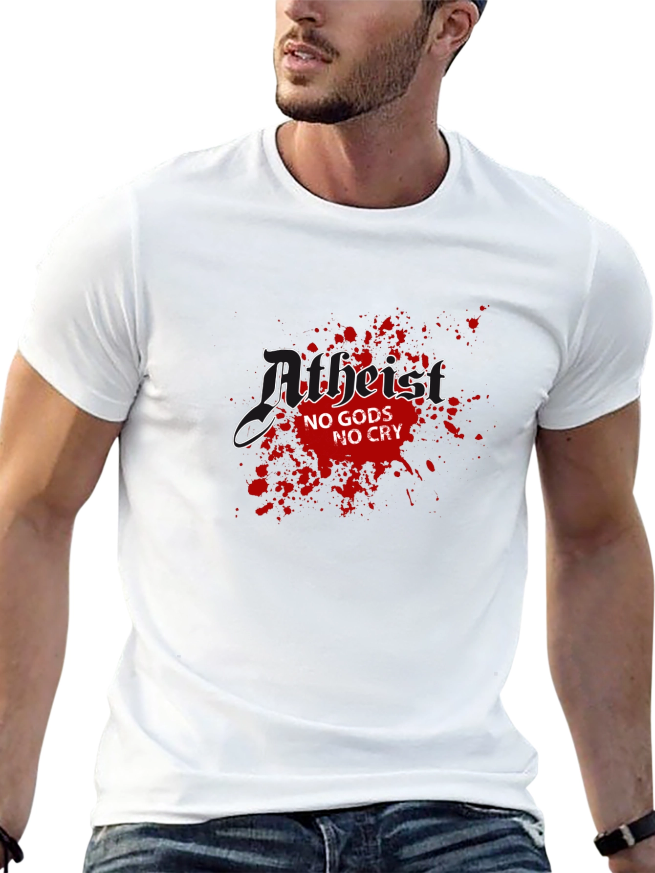 Make a statement with this bold black t-shirt featuring the words "Atheist No Gods No Cry" emblazoned across the chest in a gothic-style font. The design is highlighted by a splatter of vibrant red accents, adding a rebellious edge. Crafted from a soft, comfortable fabric, this short-sleeved tee is perfect for expressing your unique beliefs with style. Ideal for casual wear, concerts, or making a statement at social gatherings. Show off your perspective with this eye-catching t-shirt.