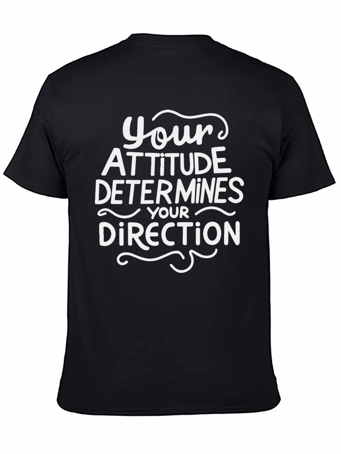 This classic black tee features a bold, white graphic design that reads "Your Attitude Determines Your Direction." The inspiring message is presented in a stylish, slightly whimsical font that adds a touch of personality. Made from a soft, comfortable fabric, this t-shirt is perfect for everyday wear. The short sleeves and crew neck make it a versatile choice for casual outings, gym sessions, or simply relaxing at home. Show off your positive mindset with this eye-catching and comfortable graphic tee. It's sure to spark conversations and inspire those around you! A great gift idea for anyone who needs a reminder that attitude is everything.